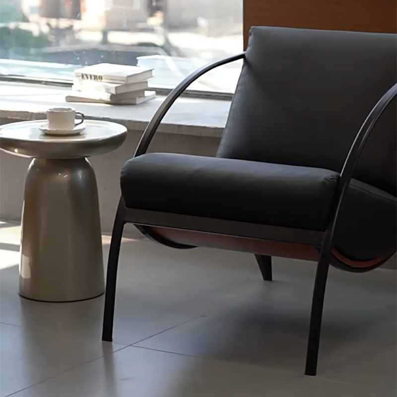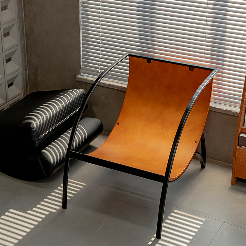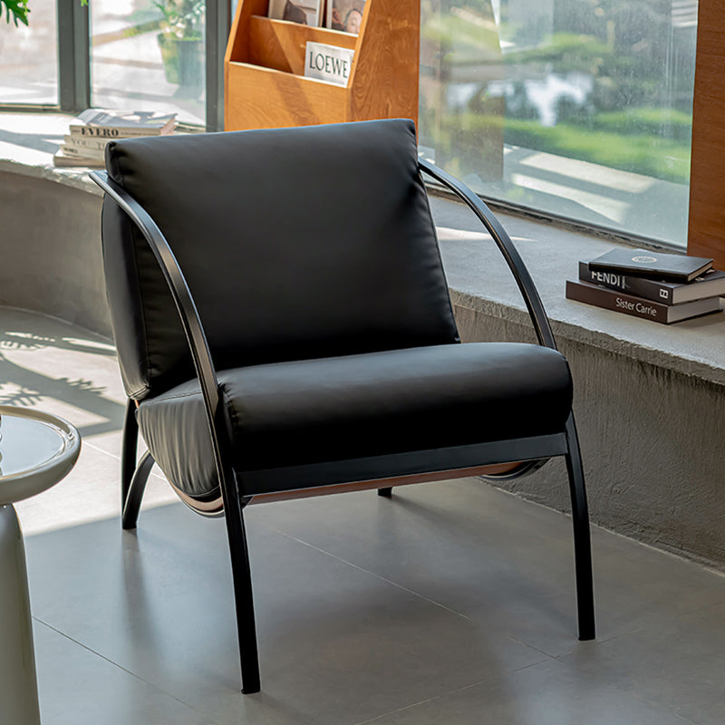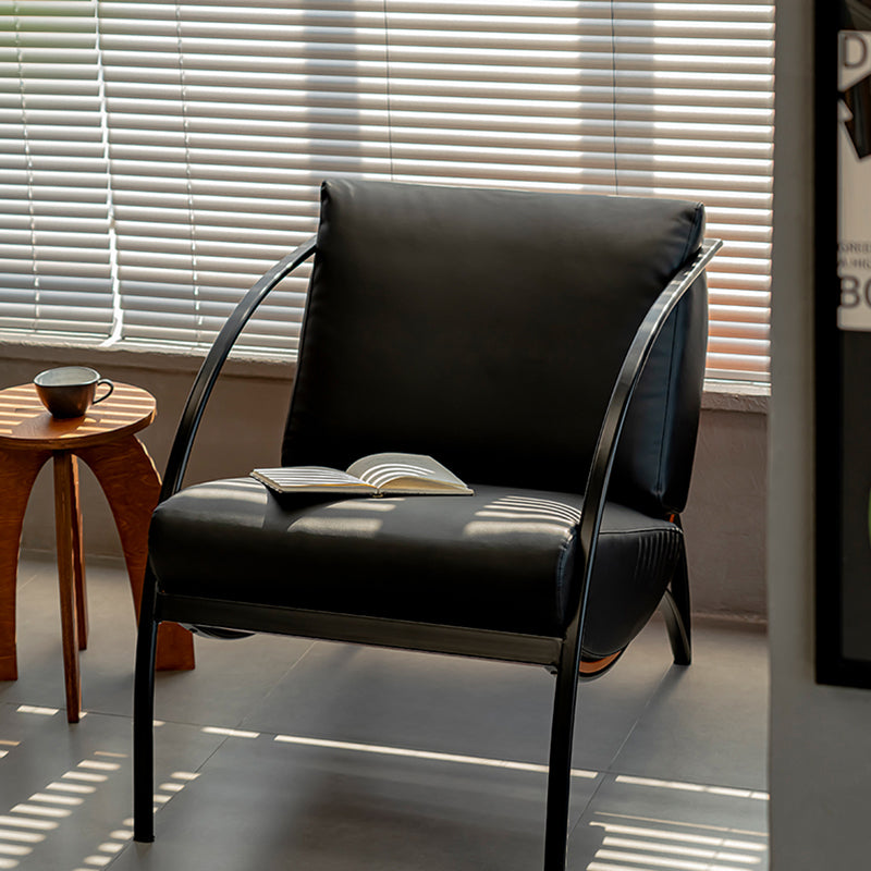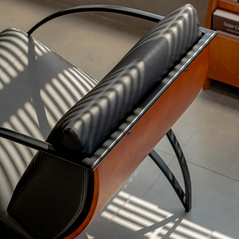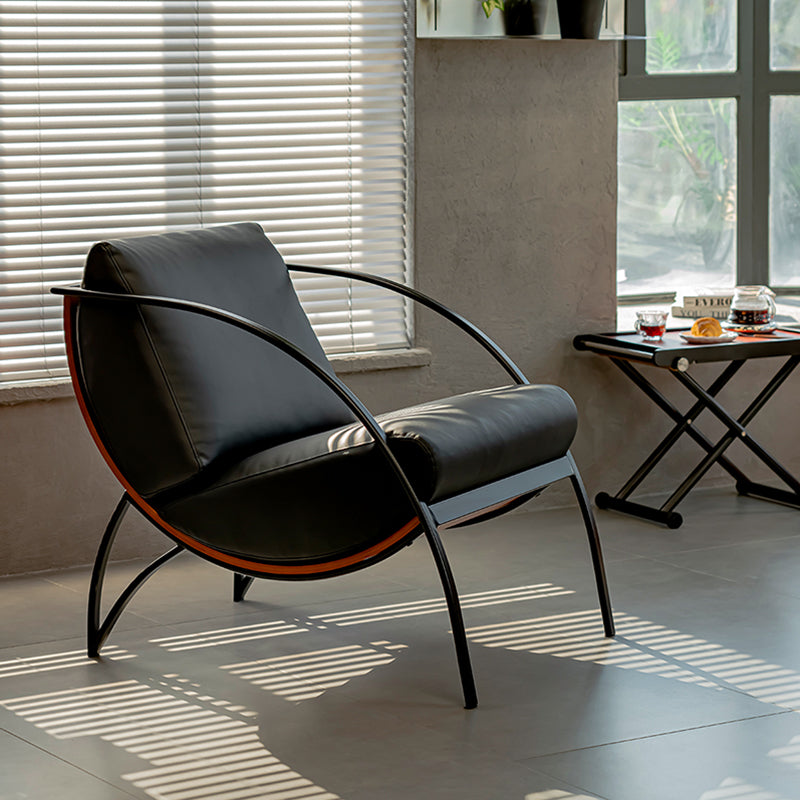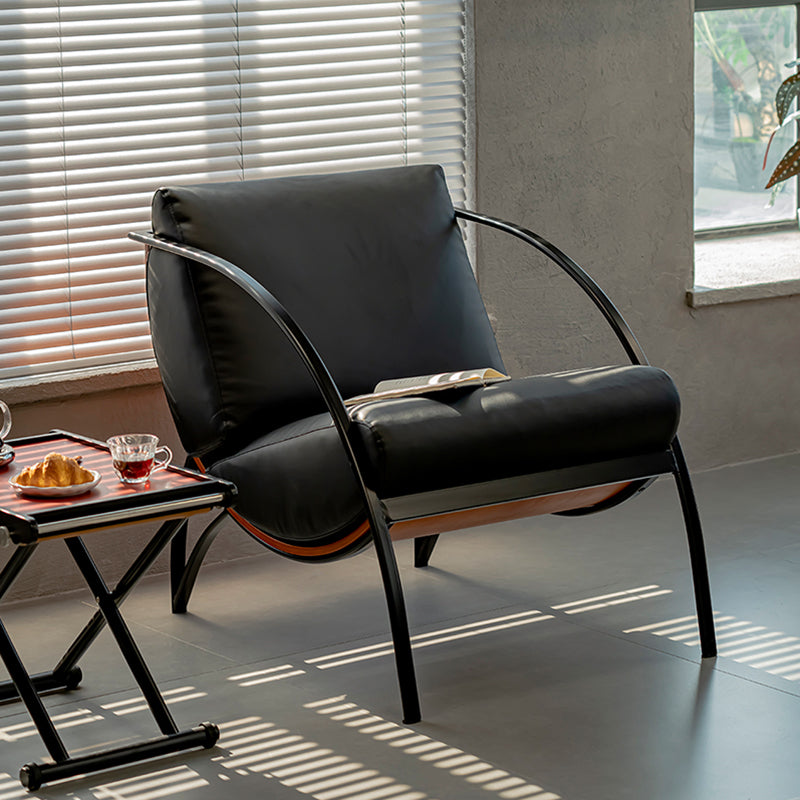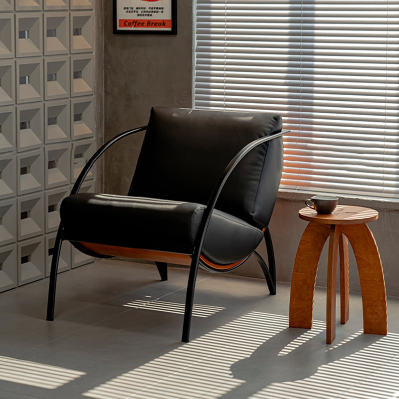 This contemporary retro accent chair features a durable multilayer solid wood structure, premium microfiber leather upholstery, and a sleek iron frame. Designed with curved armrests and a supportive backrest, it brings comfort and style to modern living rooms in classic walnut and black tones.