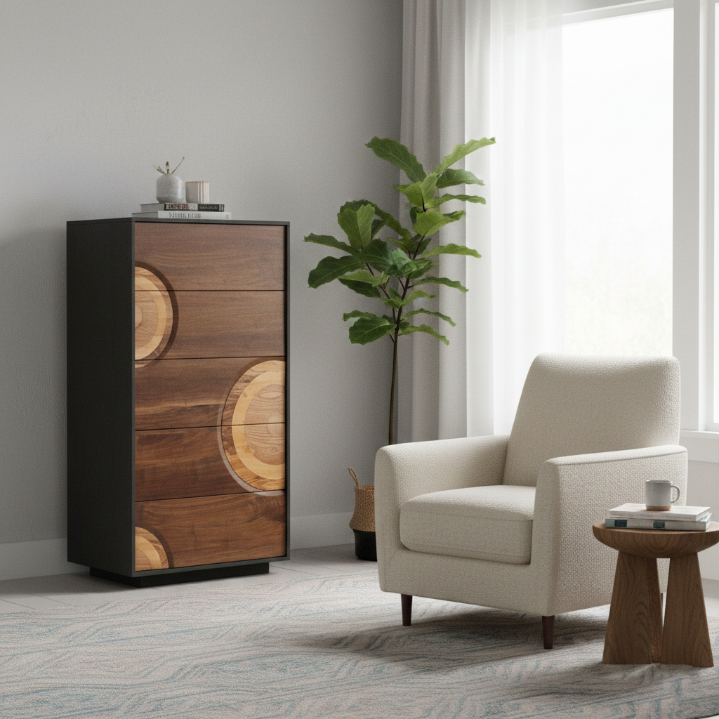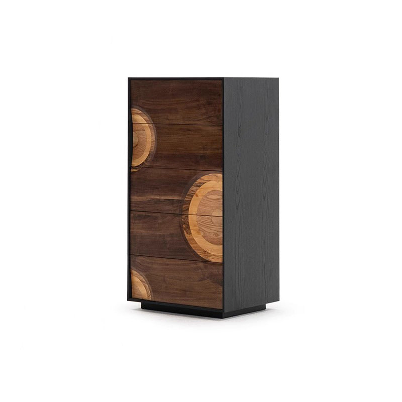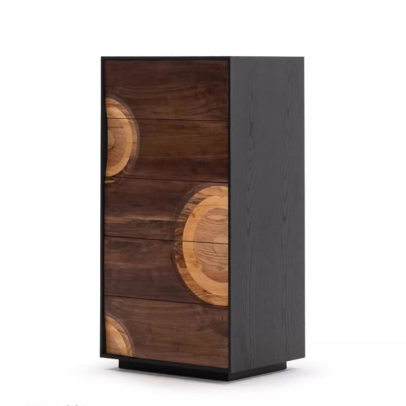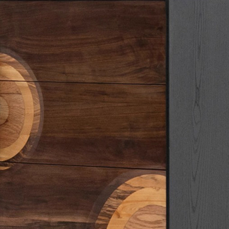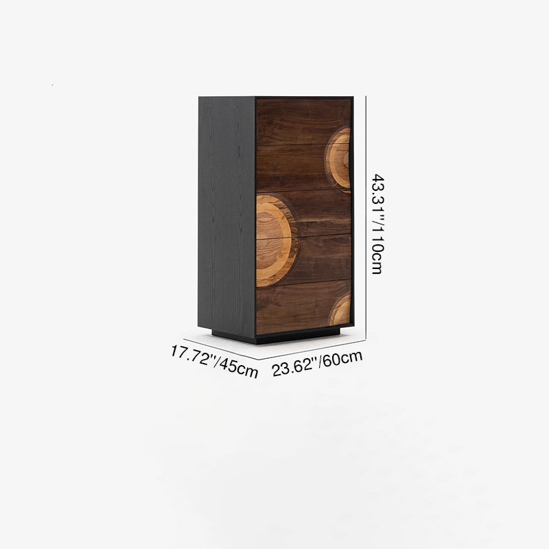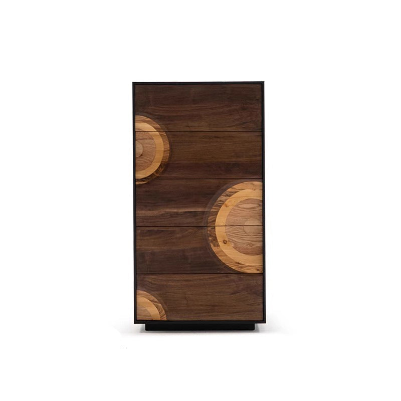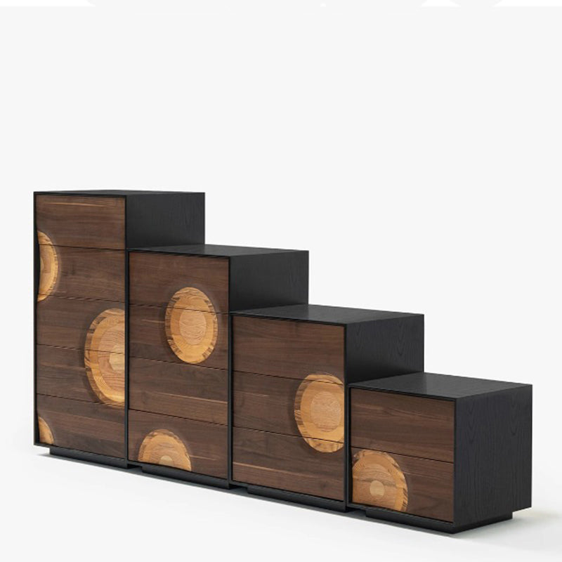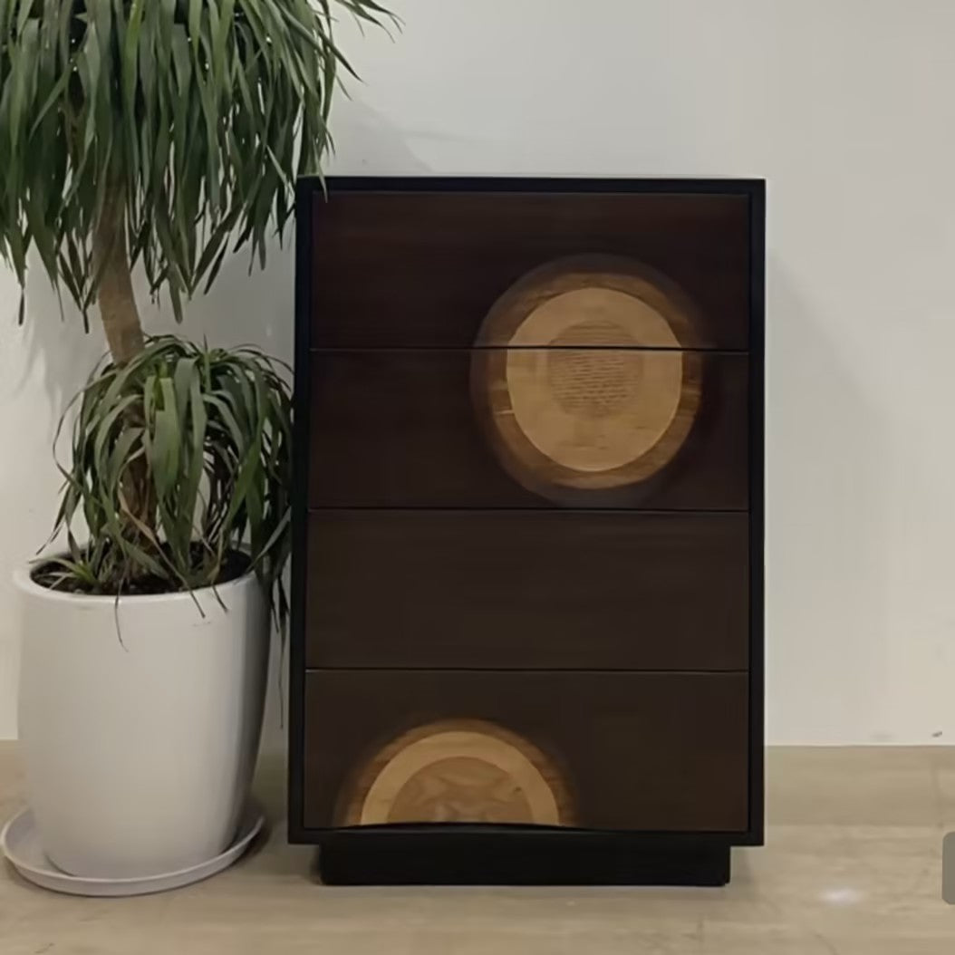 This contemporary solid wood storage cabinet features a unique rectangular silhouette with artistic wood-grain circle inlays, offering 2 spacious drawers for flexible organization. The warm natural wood tone and ample storage make it a stylish and functional addition to modern living rooms or entry spaces.
