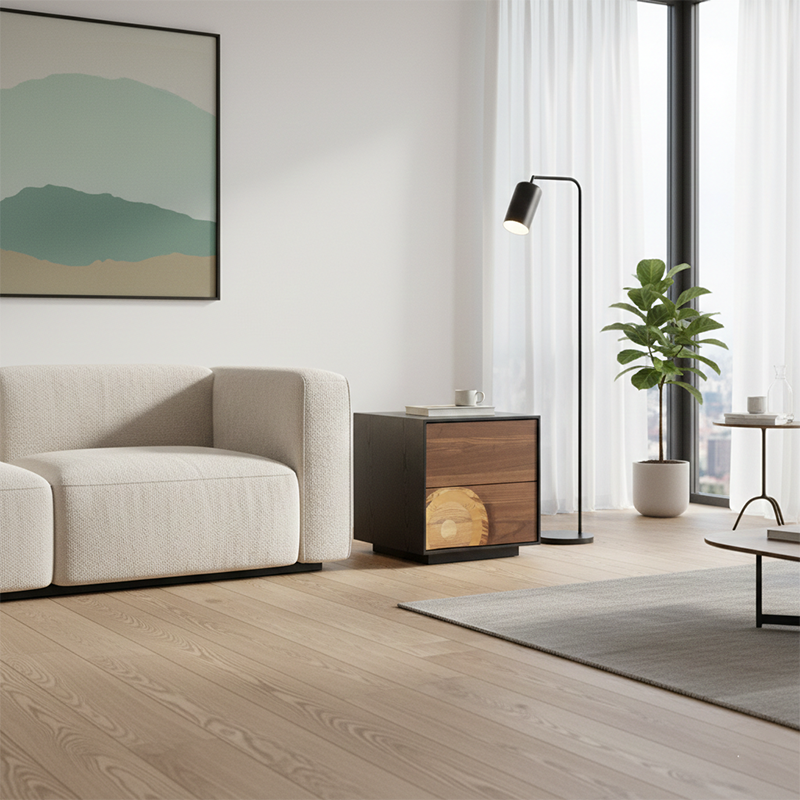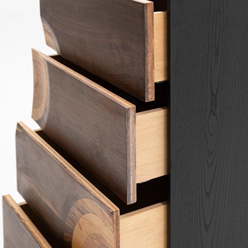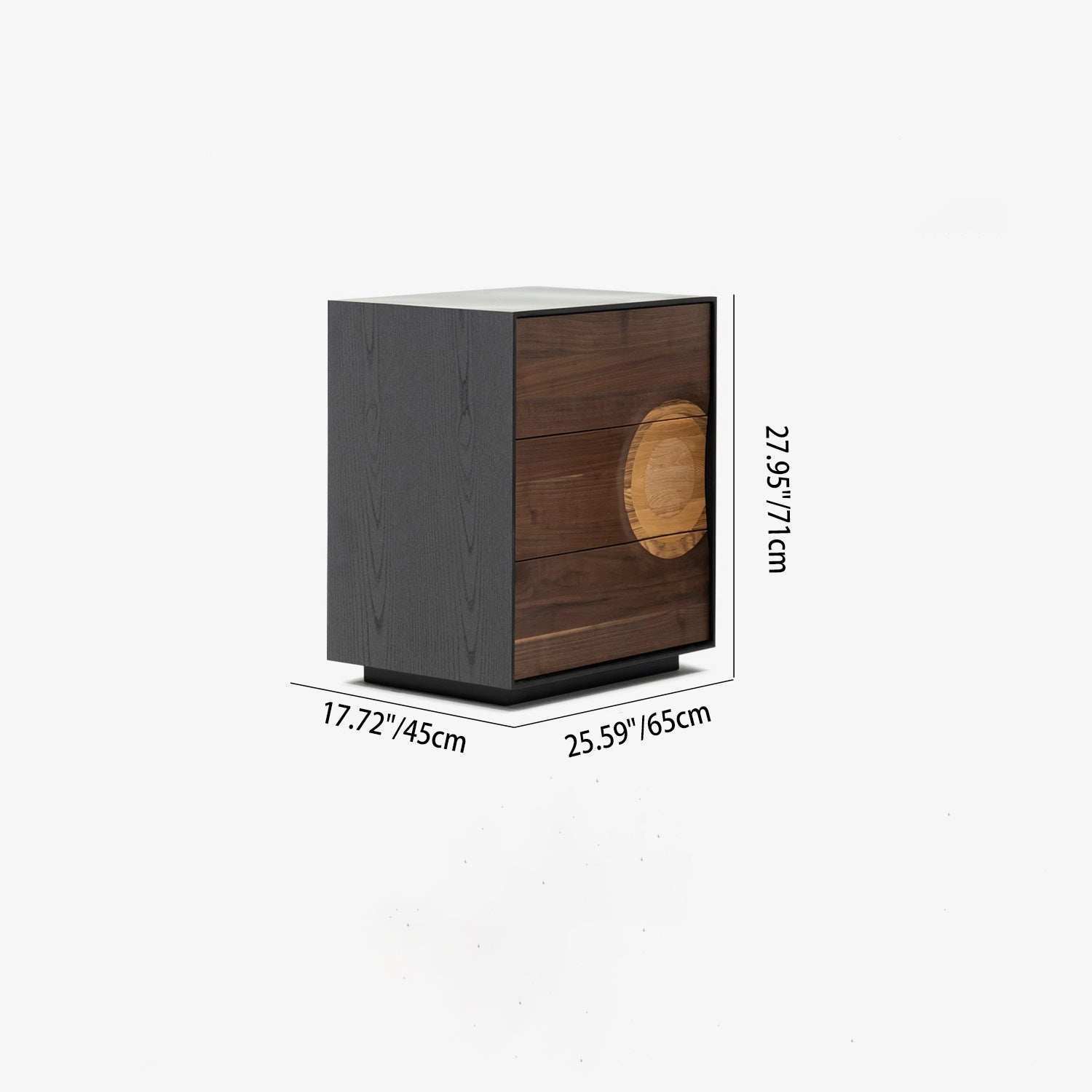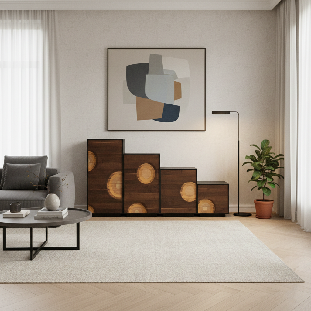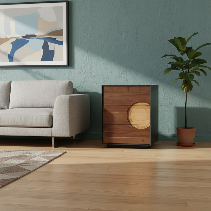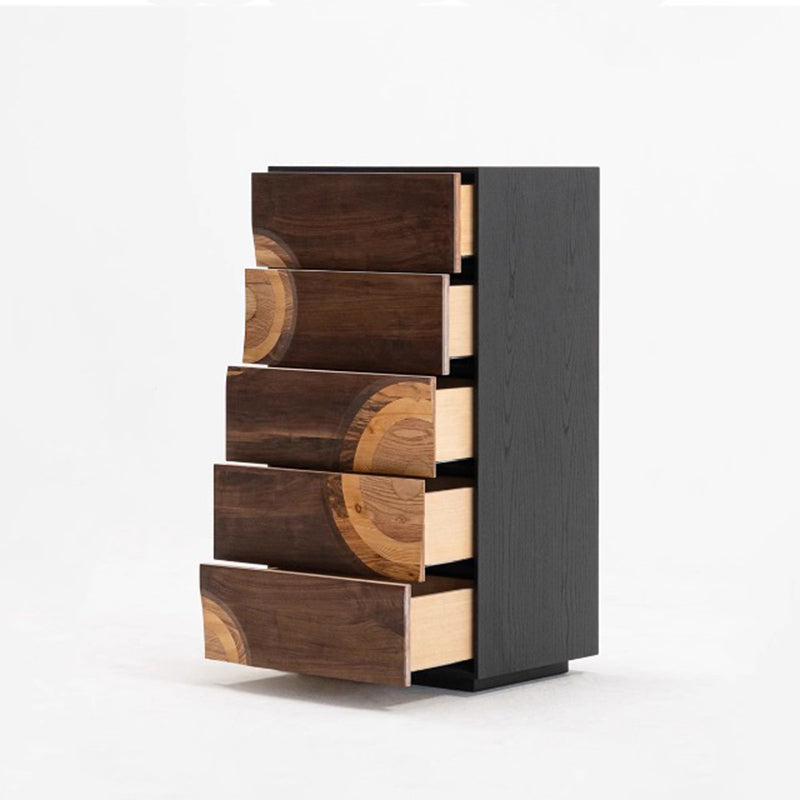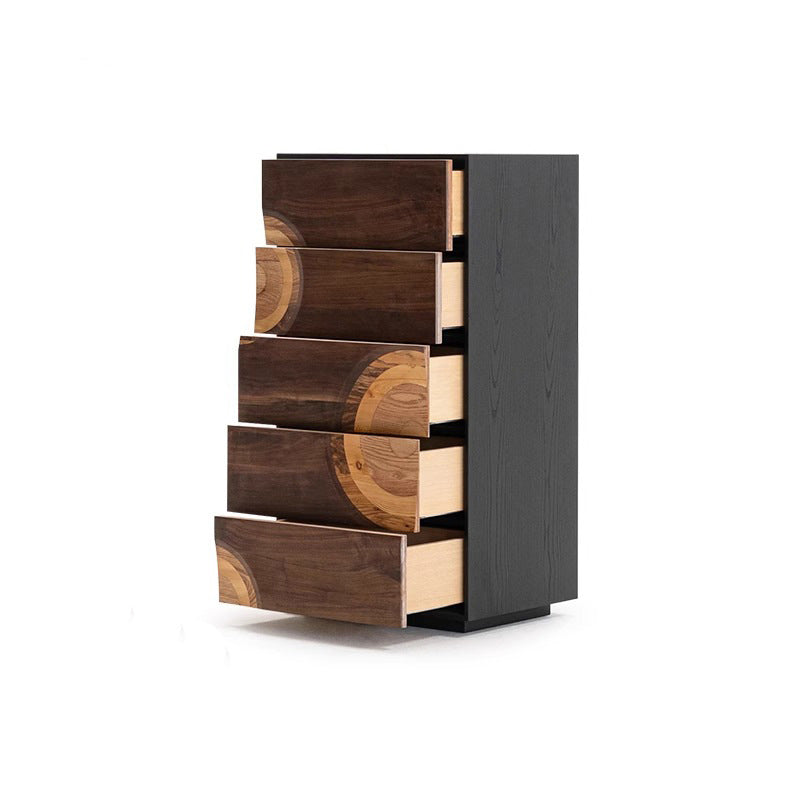 This contemporary solid wood storage cabinet features a unique rectangular silhouette with artistic wood-grain circle inlays, offering 2 spacious drawers for flexible organization. The warm natural wood tone and ample storage make it a stylish and functional addition to modern living rooms or entry spaces.