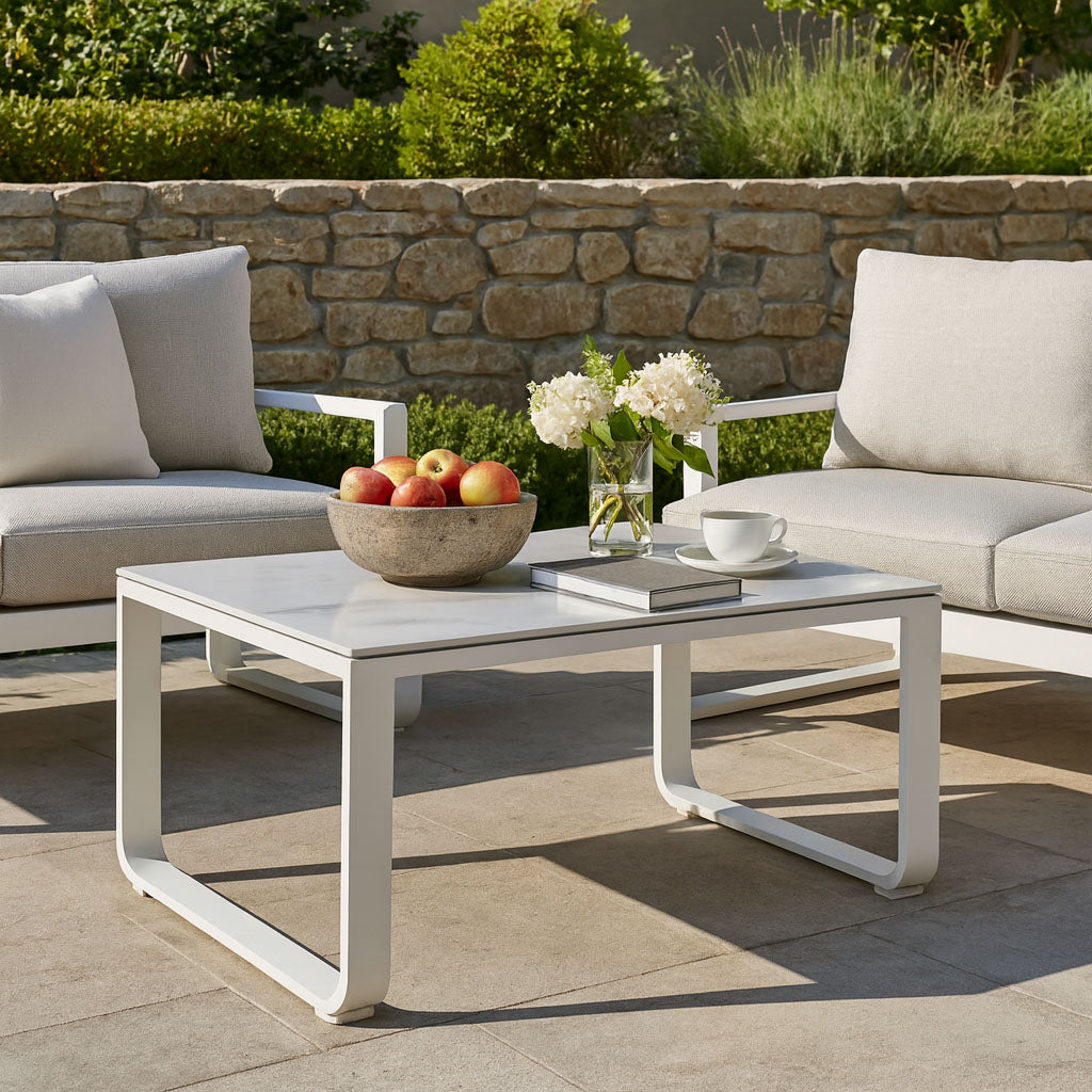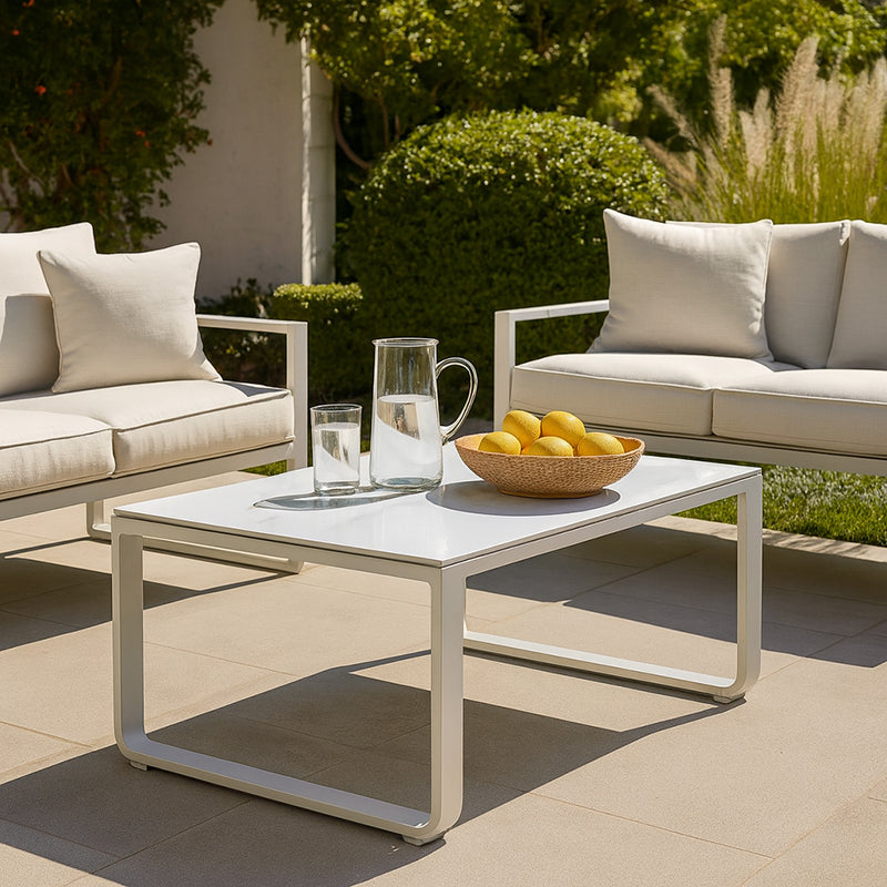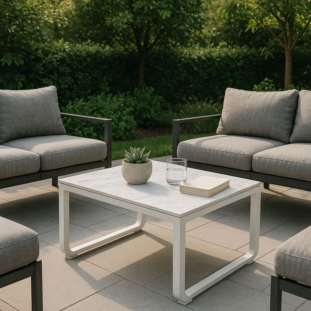 This outdoor coffee table showcases a sleek, modern design with a durable aluminum alloy frame and a robust stoneware tabletop. The corrosion and oxidation-resistant aluminum ensures long-lasting durability without rust. The spacious surface provides ample room for drinks and other essentials. Coated with a high-temperature textured powder finish, it offers superior waterproof and corrosion resistance, making it perfect for outdoor conditions. Its simple rectangular shape and clean lines add a contemporary flair to any patio or garden, blending style with functionality.