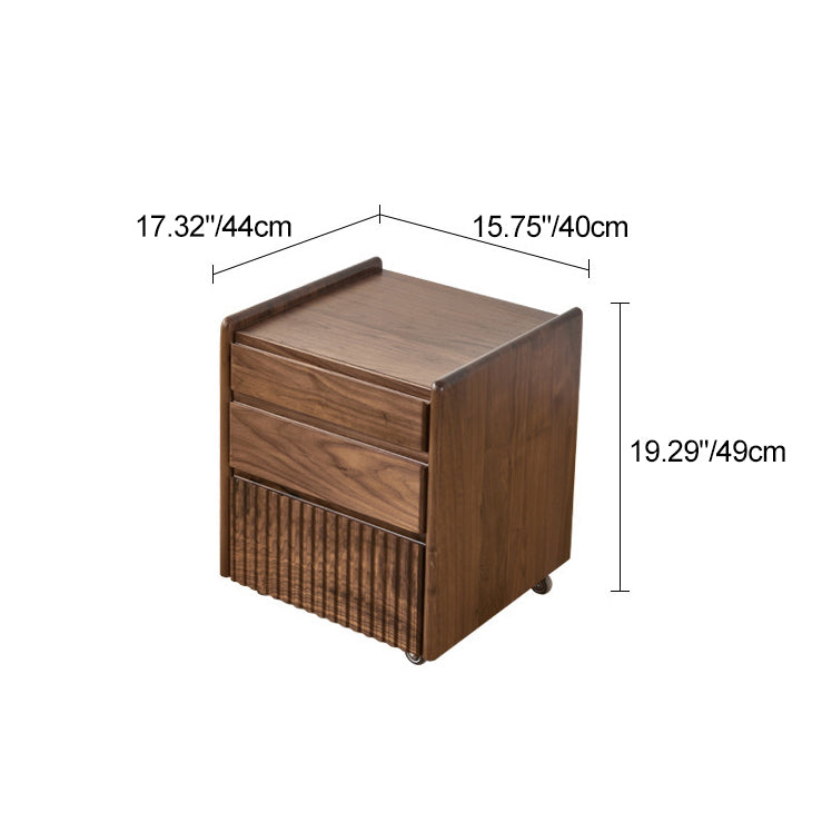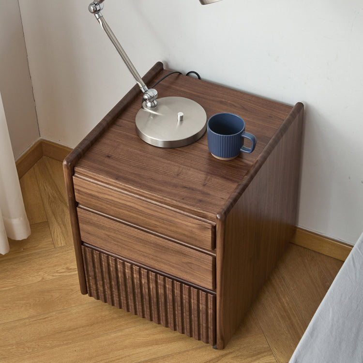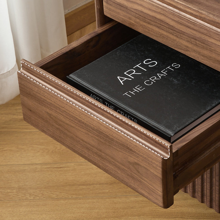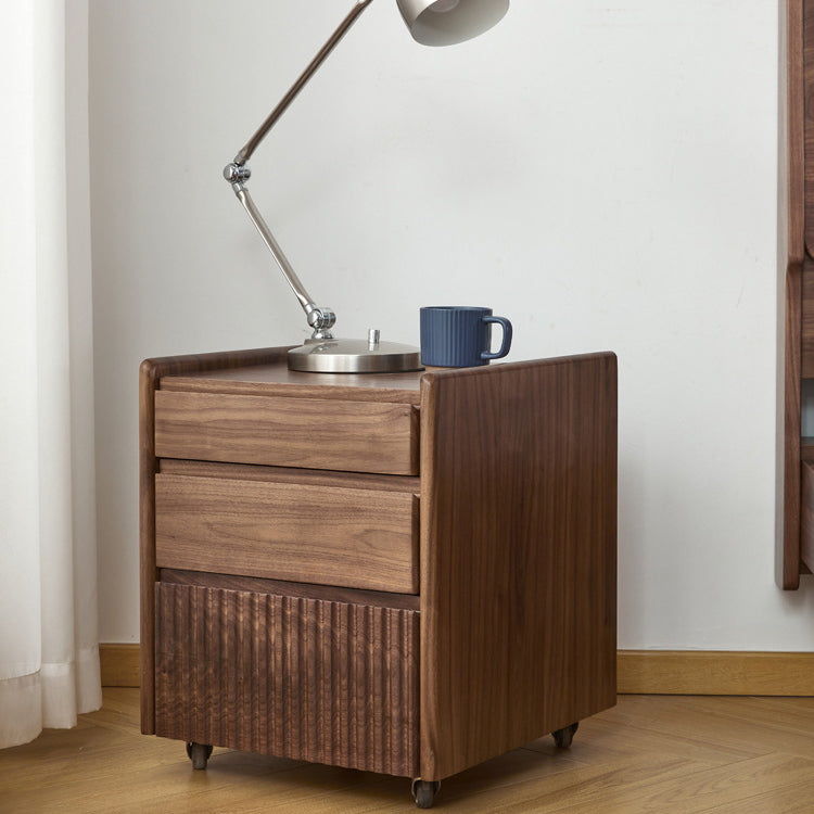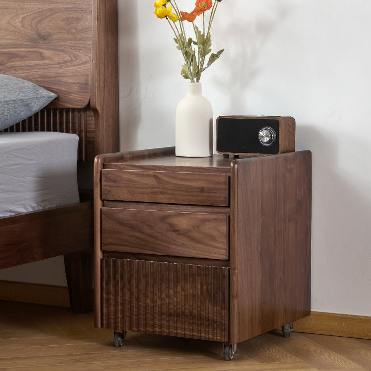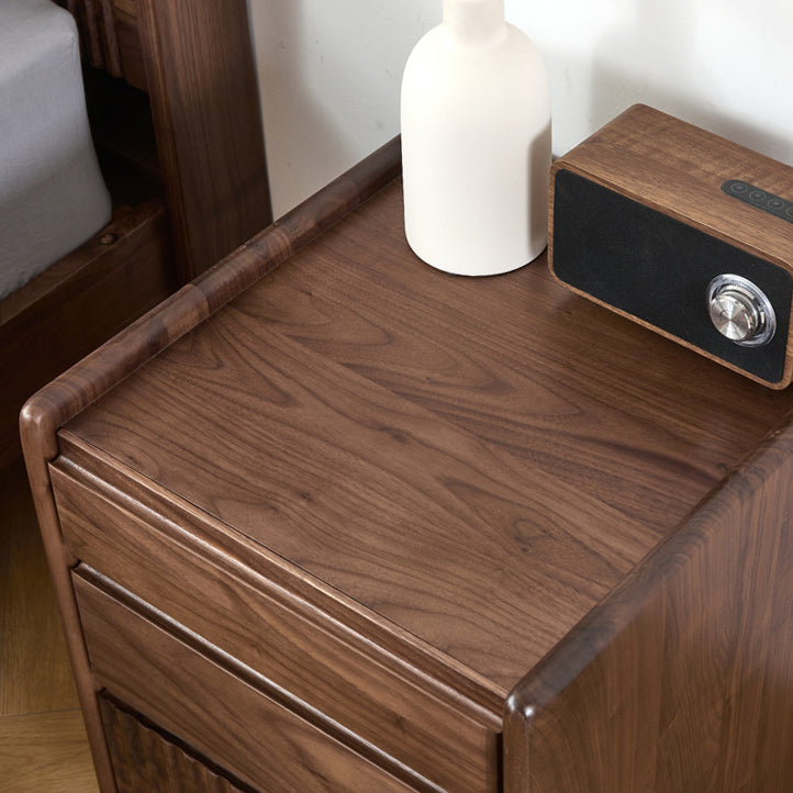 Gefertigt aus reichhaltigem Walnussholz, bietet dieser traditionelle Vintage-Nachttisch ein einzigartiges Klaviertasten-Design, drei geräumige Schubladen und eine sanfte Beweglichkeit. Mit Zapfen- und Schlitzverbindungen und massiven Holzschienen gebaut, ist er eine langlebige und elegante Aufbewahrungslösung für jedes klassische Schlafzimmer