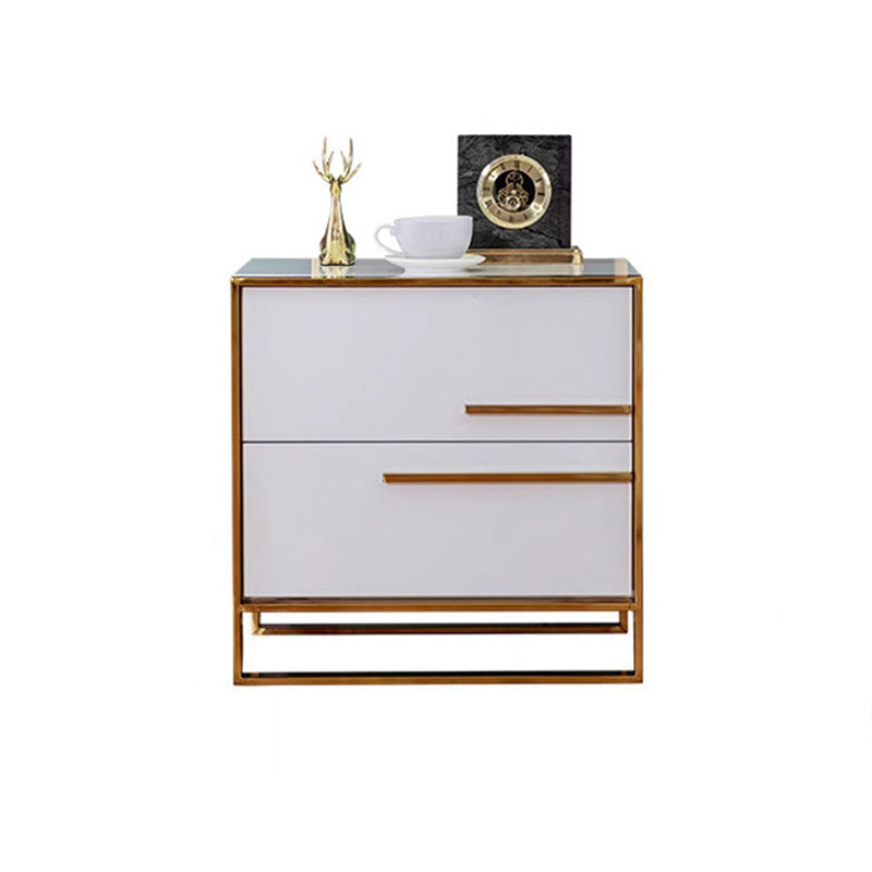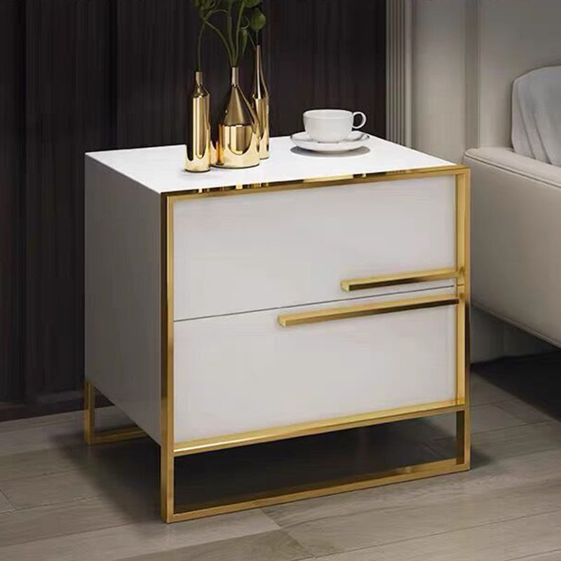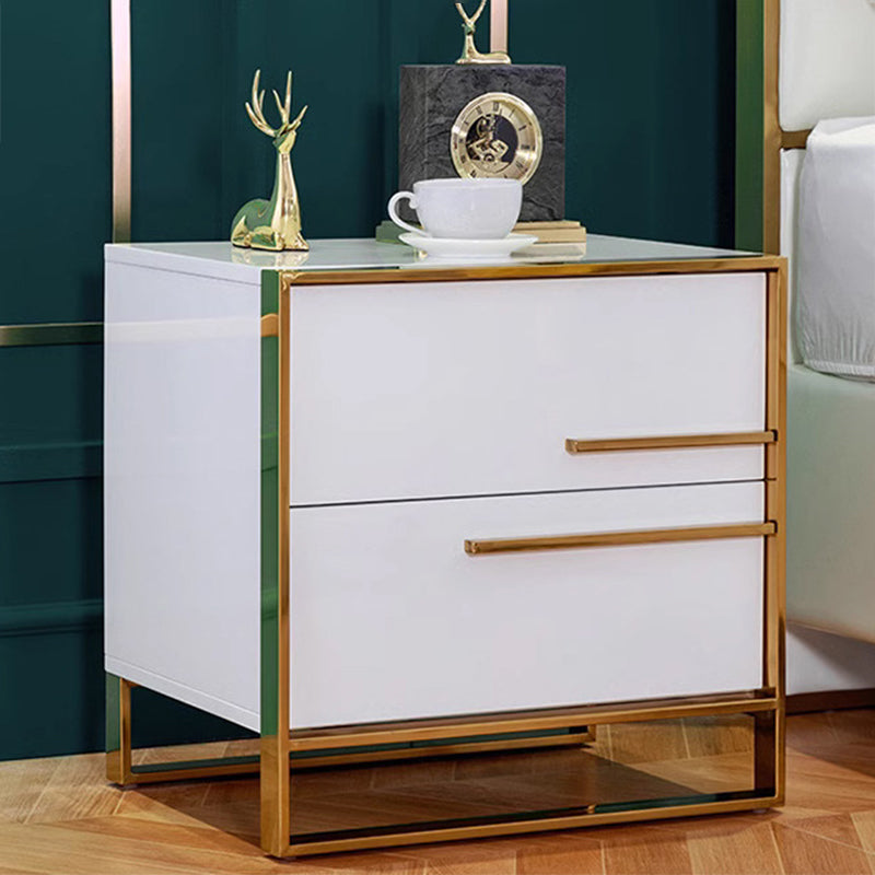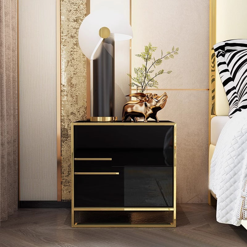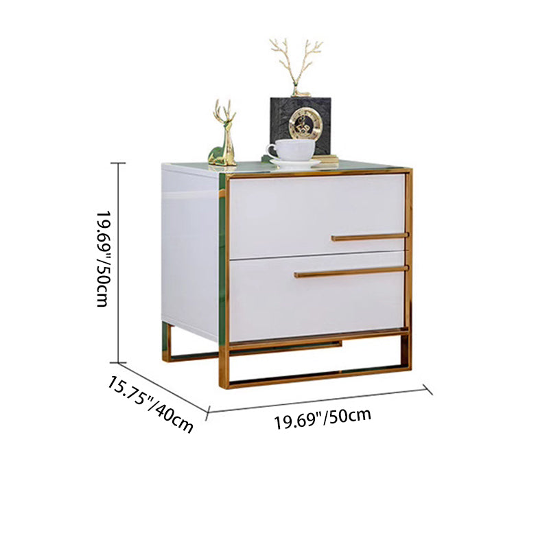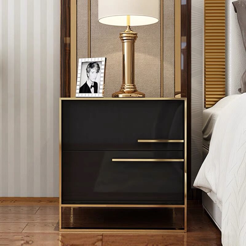 This contemporary luxury nightstand pairs stainless steel accents with engineered wood in a sleek rectangular silhouette, featuring two smooth-glide drawers for practical bedroom storage. Available in black, white, and gold, it offers a durable lacquered finish that is water-resistant, stain-resistant, and scratch-resistant, while maintaining excellent stability and long-lasting performance.