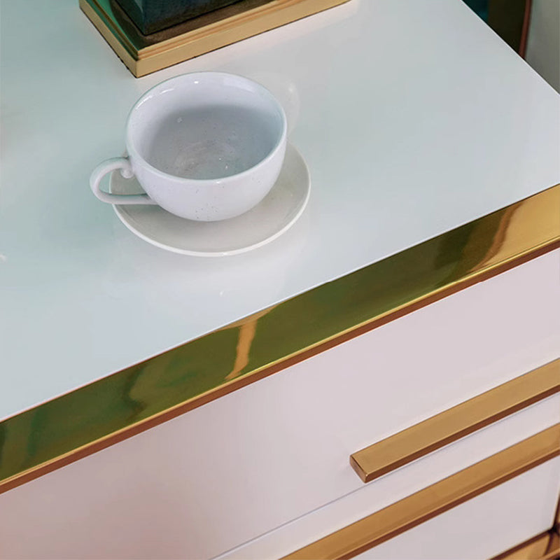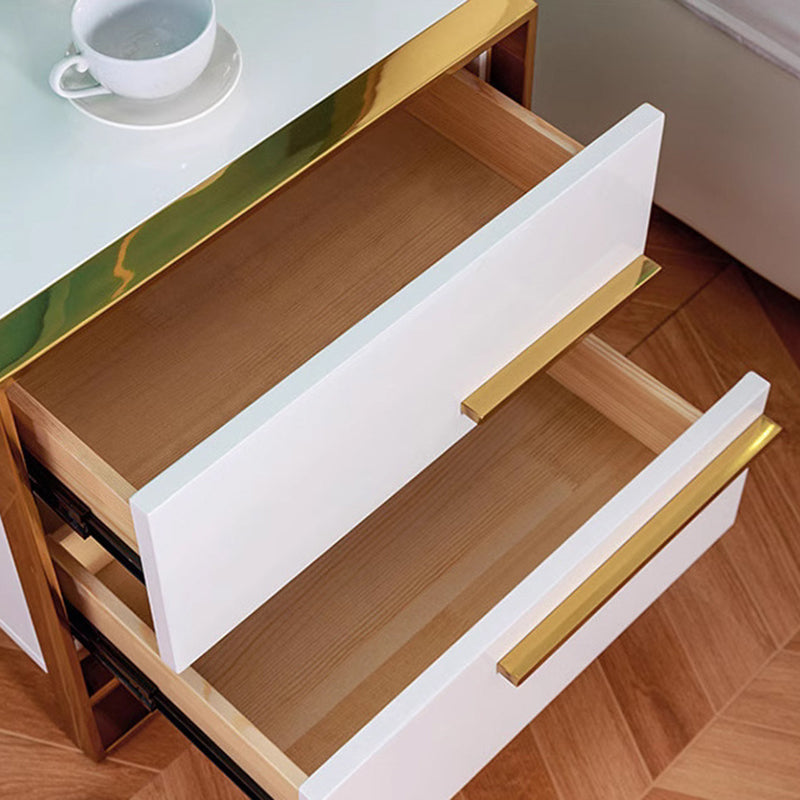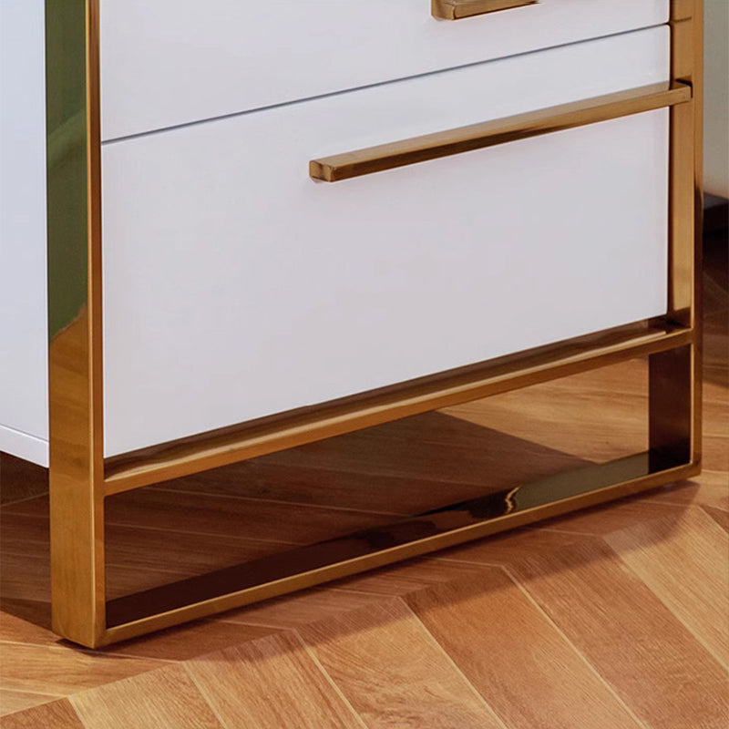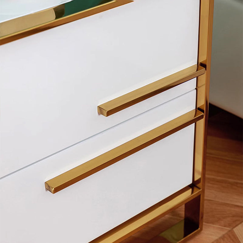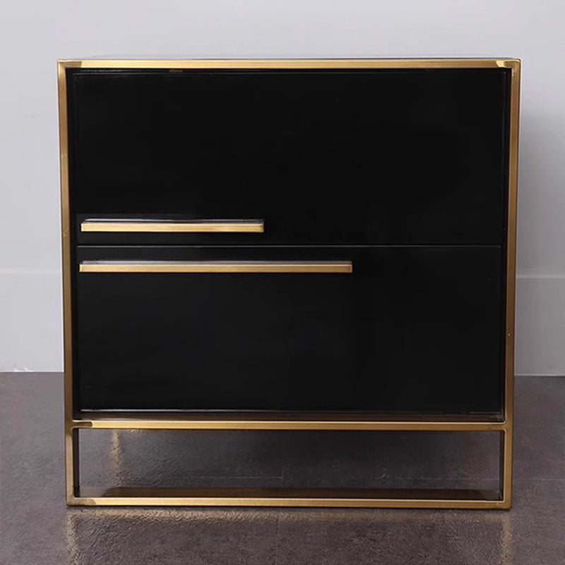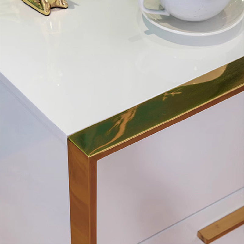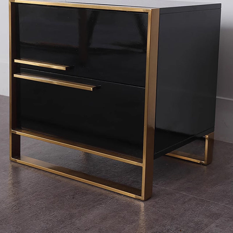 This contemporary luxury nightstand pairs stainless steel accents with engineered wood in a sleek rectangular silhouette, featuring two smooth-glide drawers for practical bedroom storage. Available in black, white, and gold, it offers a durable lacquered finish that is water-resistant, stain-resistant, and scratch-resistant, while maintaining excellent stability and long-lasting performance.