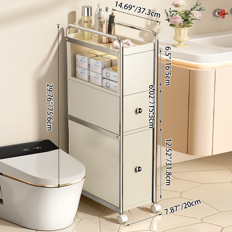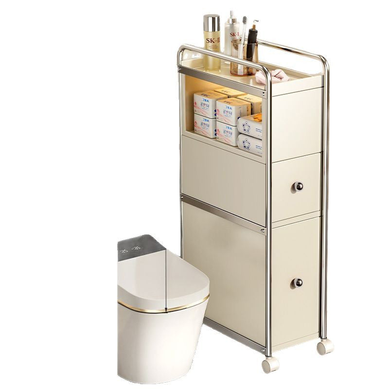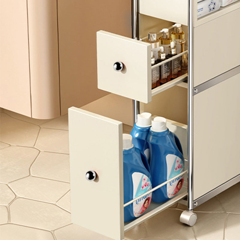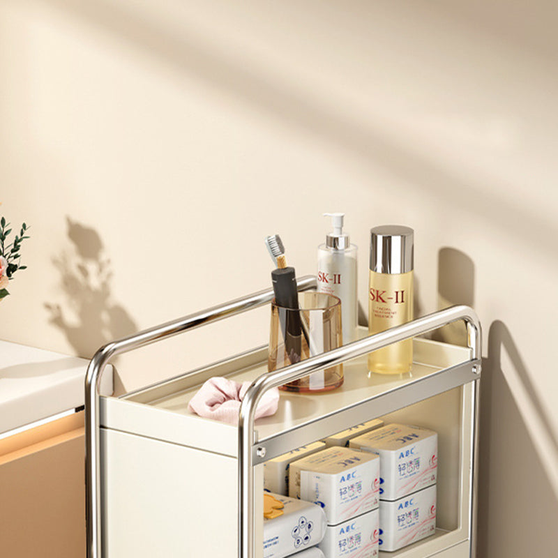This modern minimalist side table, made of durable carbon steel, features two drawers and two open tiers for flexible storage and display. Available in cream white, its rectangular design offers smooth mobility and a sleek look perfect for organizing small spaces in the living room, bathroom, or hallway.