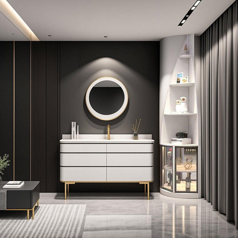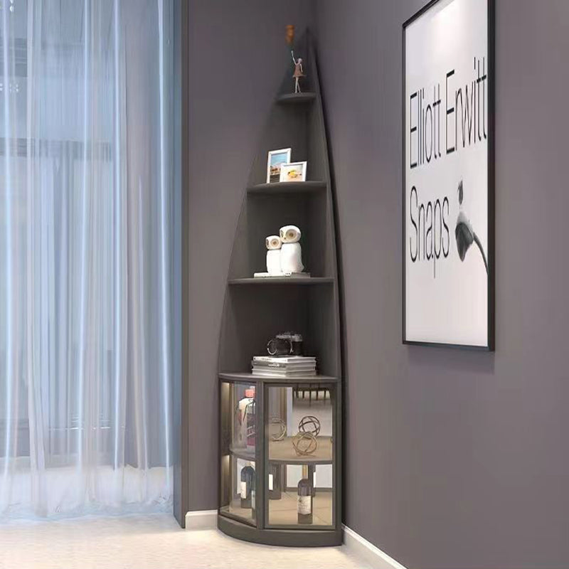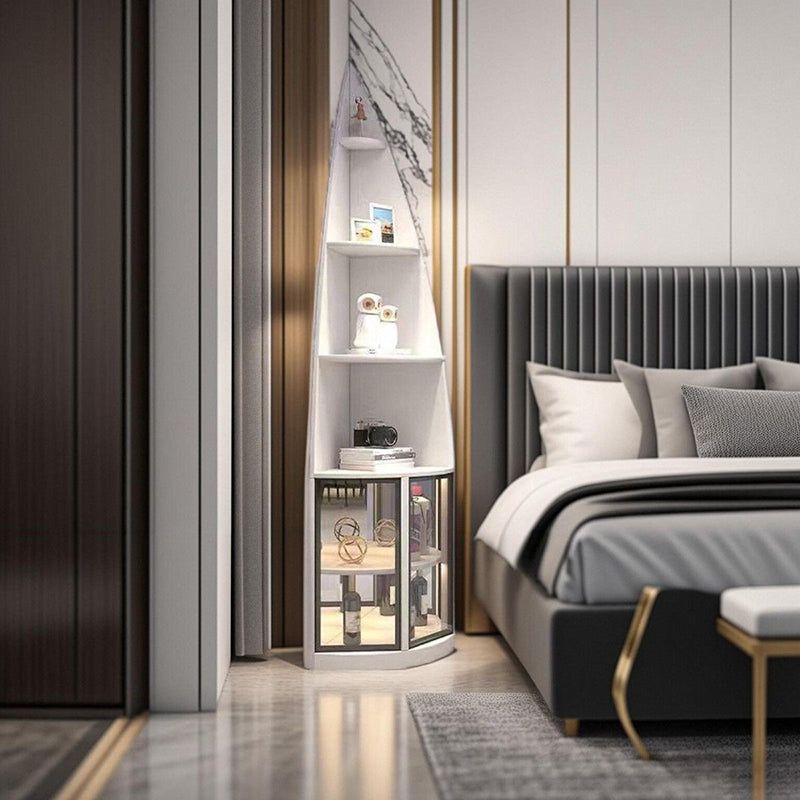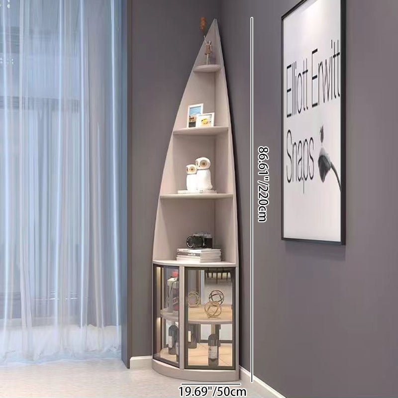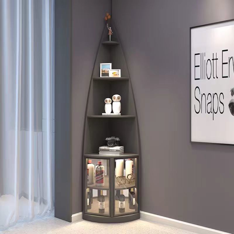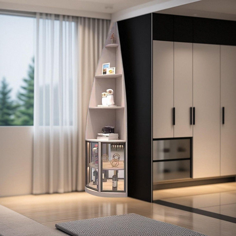 This modern luxury corner shelf unit features a sleek 6-tier design with a unique waterdrop shape, crafted from particleboard, aluminum, and tempered glass. Available in khaki, white, and dark gray, it perfectly fits into any corner with its 90° right-angle design, making it an ideal addition to your living room. The elegant design not only offers ample storage but also elevates the sophistication of your space. Ideal for modern living rooms looking to combine style and function.