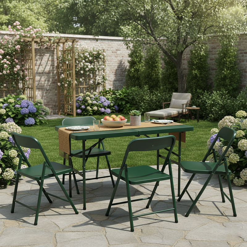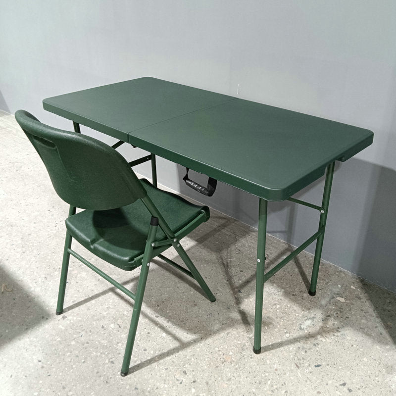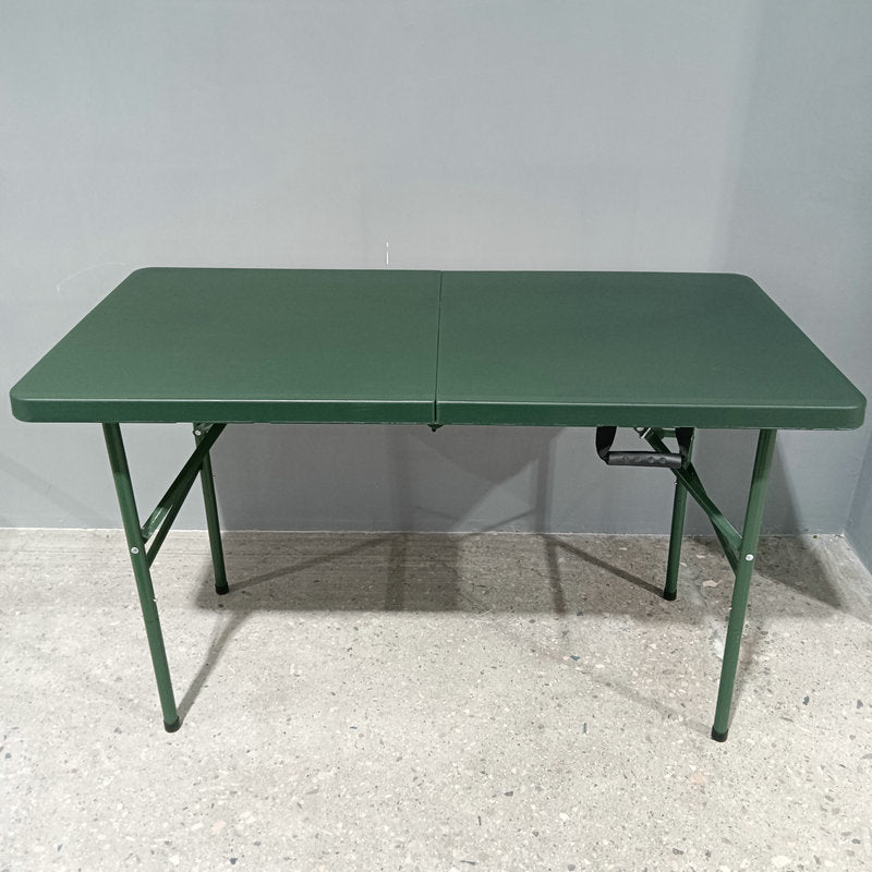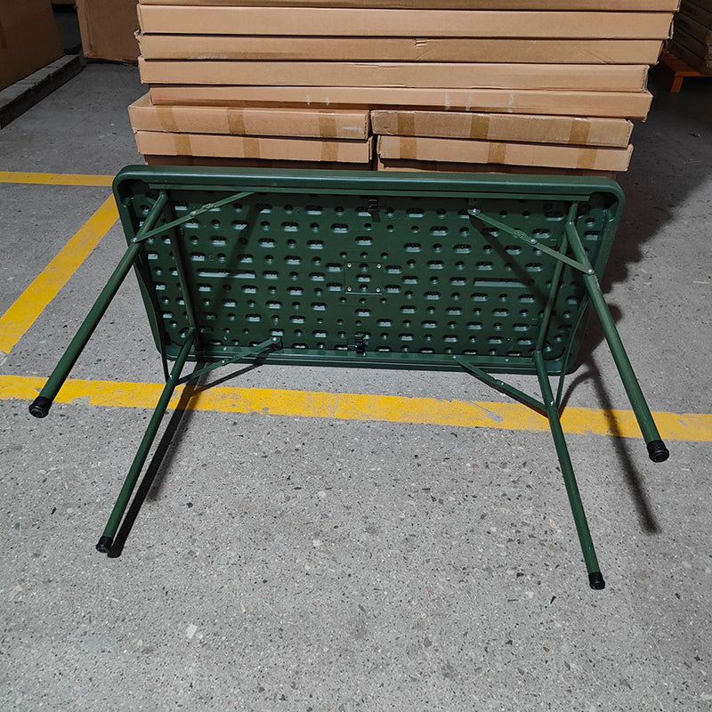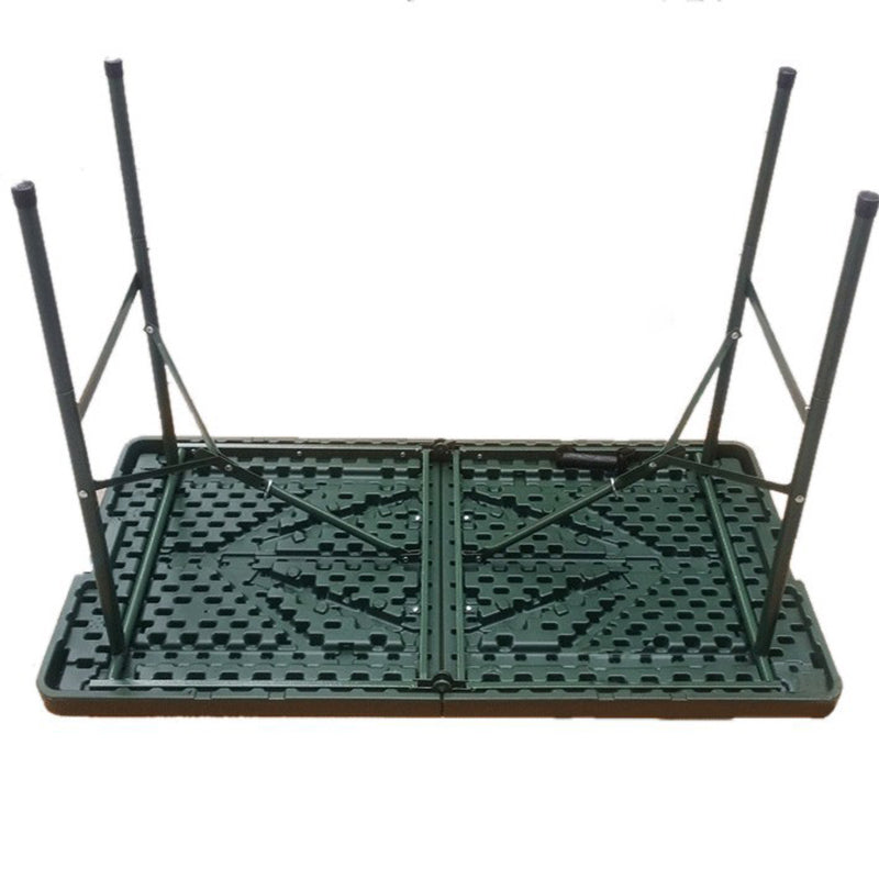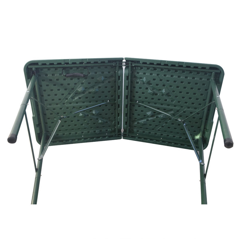 This modern minimalist folding dining table combines a durable plastic tabletop with a sturdy steel frame, featuring a versatile rectangular shape perfect for various environments. Finished in a vibrant green, this wear-resistant and stable table is specifically designed for patio dining, camping, and training, offering a portable and reliable solution for backyard gatherings and everyday outdoor use.
