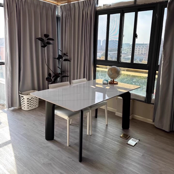 Engineered for both "timeless elegance and everyday practicality," the table is supported by sleek, high-grade carbon steel legs, providing a stable, heavy-duty foundation that comfortably seats your guests. Its streamlined footprint makes it an exceptional choice for small apartments, dedicated dining rooms, or open-concept living spaces. Available in versatile finishes including pristine White, rich Walnut, or bold Black, this table is a space-efficient centerpiece designed to anchor any contemporary interior. Optimized for North American consumers searching for sintered stone dining tables, French modern rectangular tables, small space dining solutions, and carbon steel leg kitchen furniture.