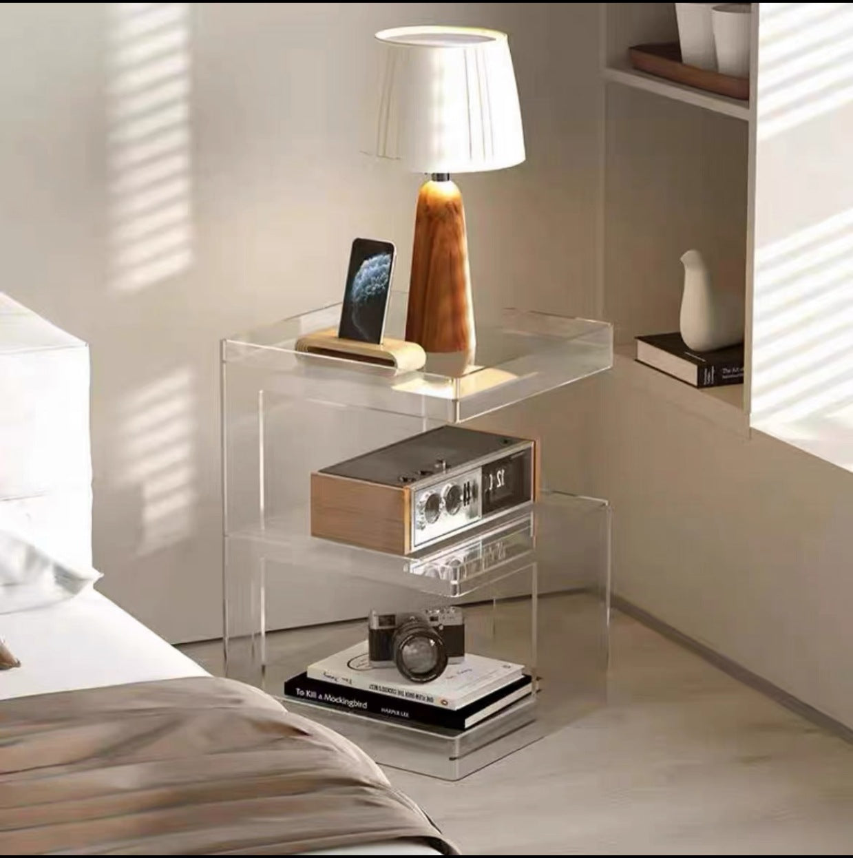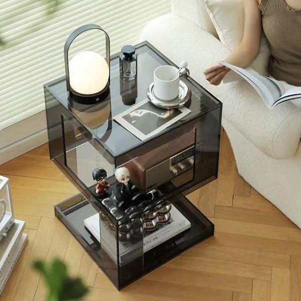 This Contemporary Scandinavian side table is made from high-quality acrylic, featuring a 3-tier open storage design that keeps daily items neatly organized and easy to access. Available in coffee, transparent, and gray finishes, it highlights a square E-shaped silhouette, non-slip raised edges, and smooth rounded corners, making it a stylish and functional choice for living rooms, balconies, sofa areas, and window-side spaces.