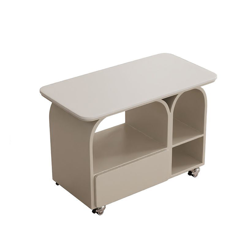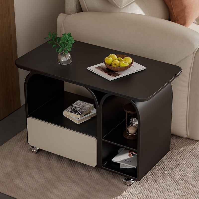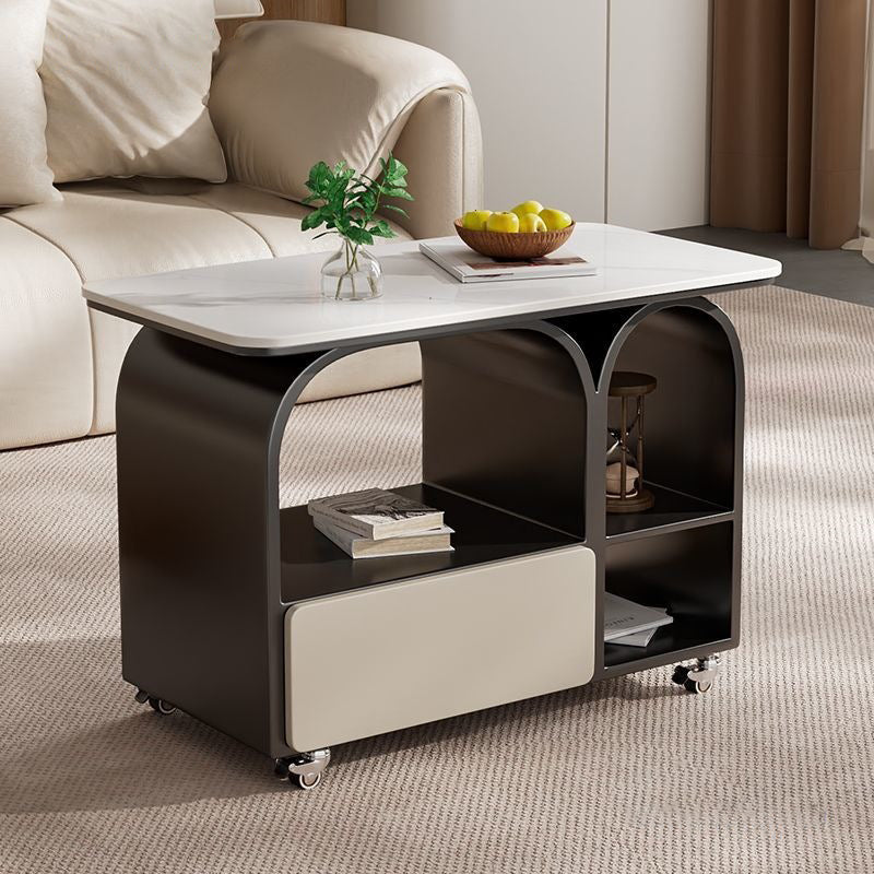 This contemporary Scandinavian coffee table combines sintered stone, iron, and solid wood in a rounded rectangular mobile design with 3-tier storage for efficient organization. Available in black, gray, white, and cream white, it features 360° lockable casters and a high-capacity storage drawer, making it ideal as a sofa-side table or compact living room solution.