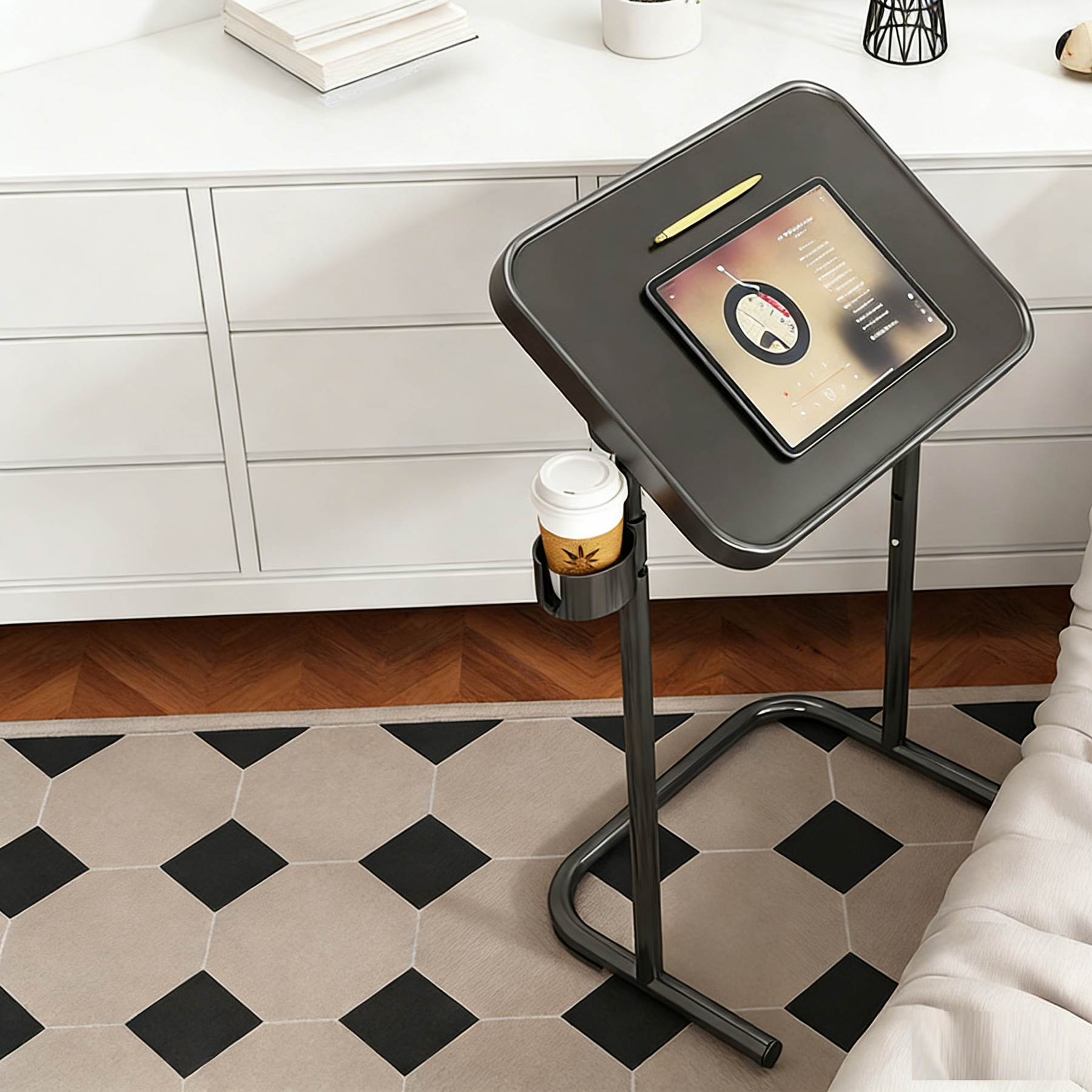 This modern minimalist carbon steel side table features a curved rectangular silhouette with a single-tier open design, ideal for sofa-side use and compact living rooms. Available in ivory white, cream yellow, or black, it offers a wide magnetic tabletop surface with dual-direction 0â€?0° tilt adjustment, delivering flexible placement, easy organization, and sleek everyday functionality in a clean modern form.