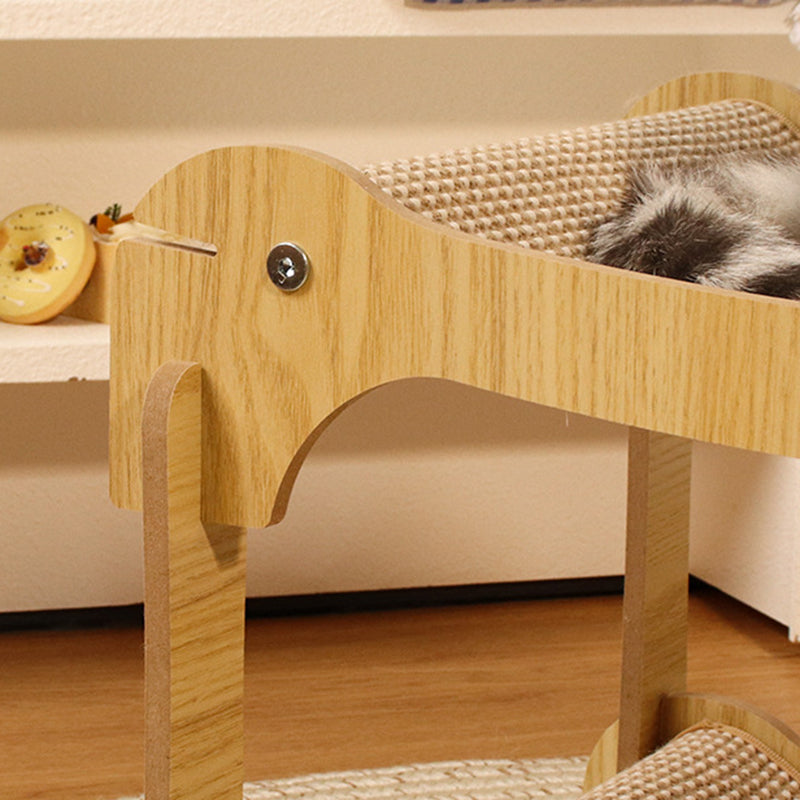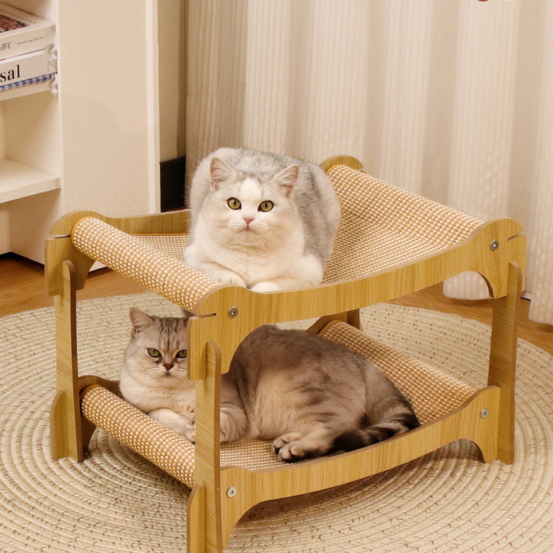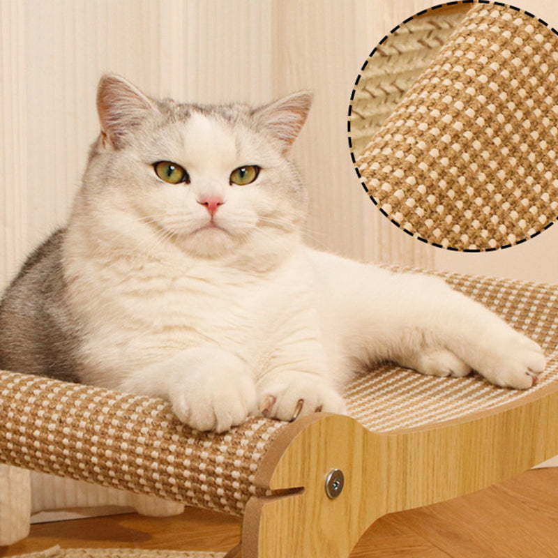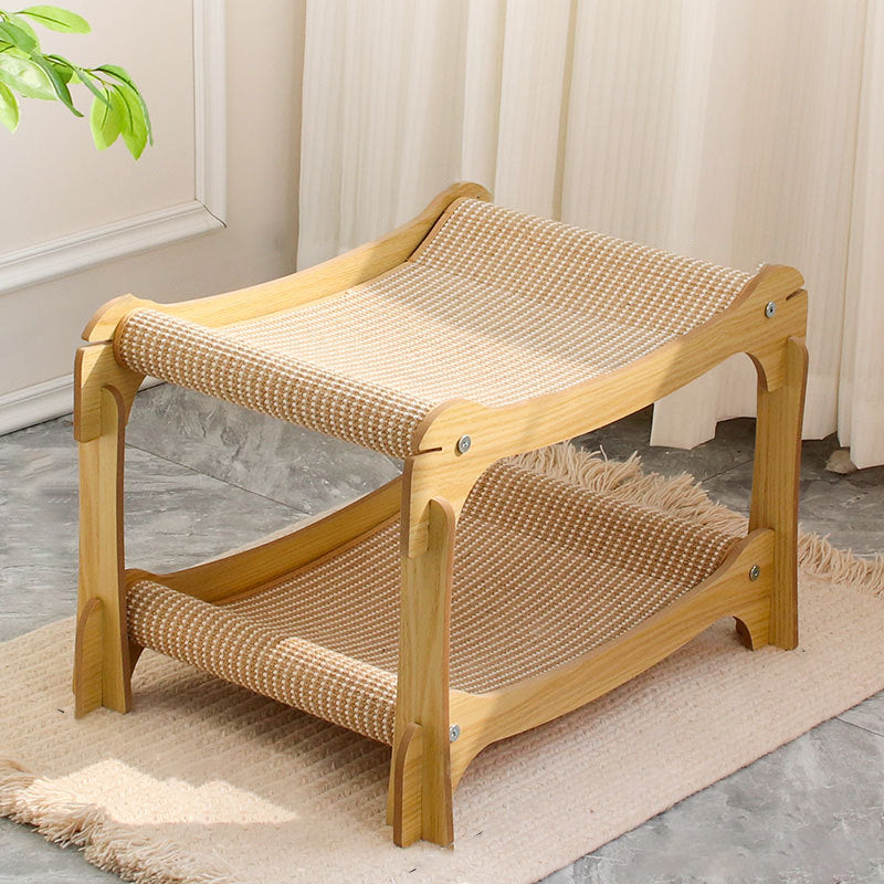 This modern minimalist cat scratcher and nest is expertly crafted from wear-resistant sisal mats and sturdy density boards, featuring a unique curved design that provides a superior scratching experience. Its innovative double-layer stackable structure not only saves space but also significantly enhances durability. With a natural wood finish that blends seamlessly into any living room, this practical and long-lasting piece serves as the ideal rest and grooming area for your cat.