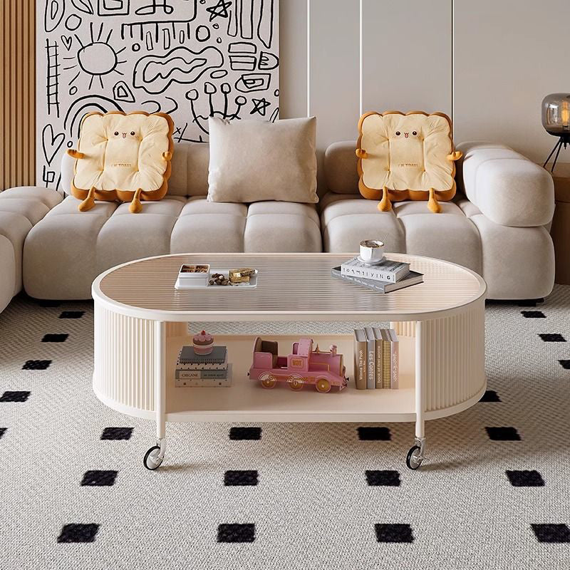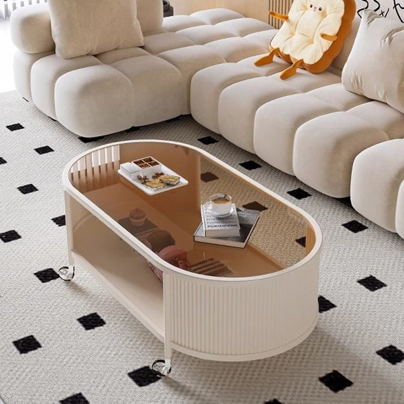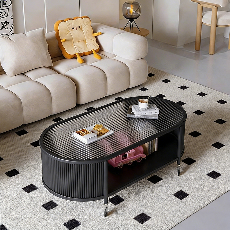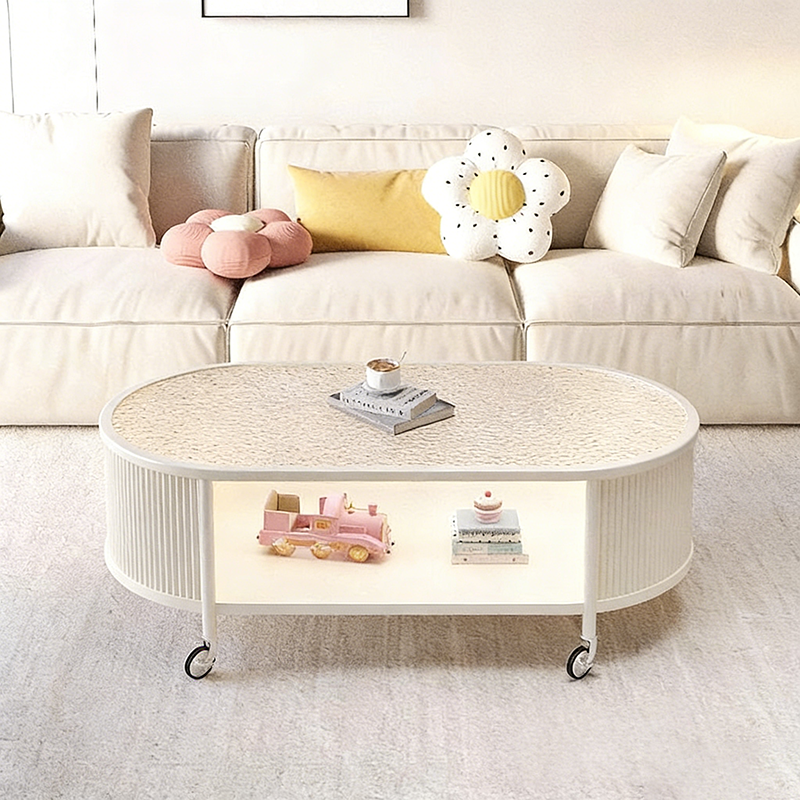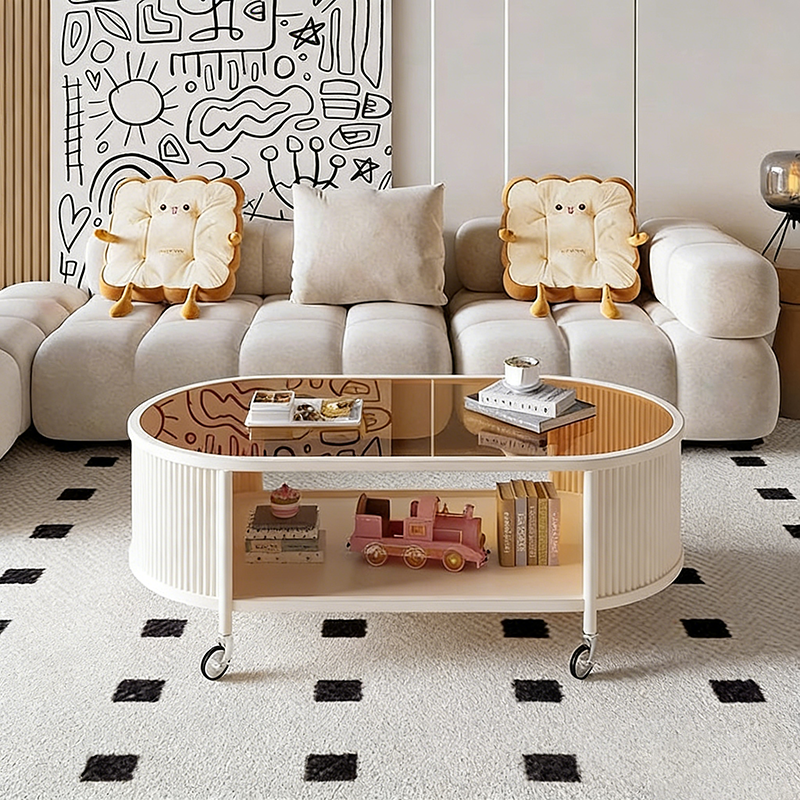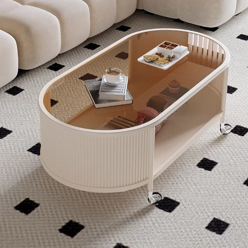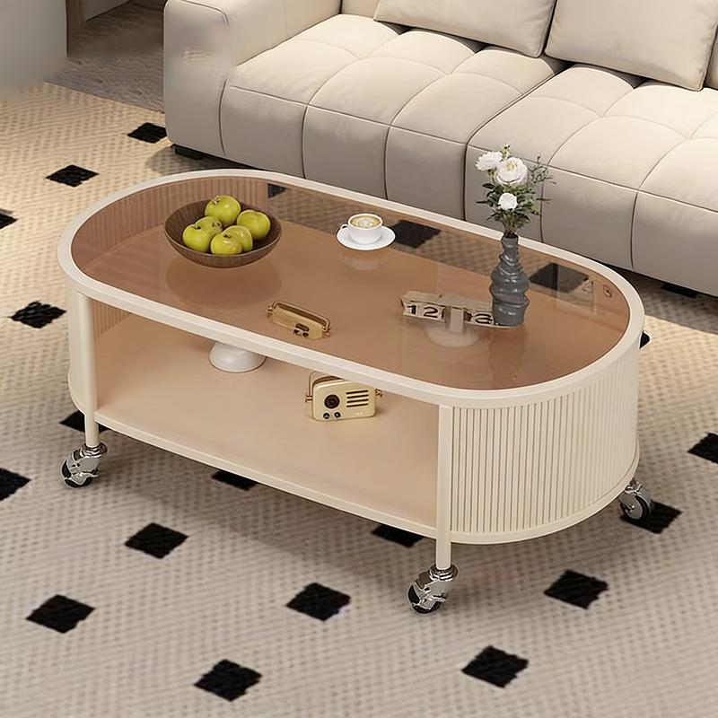 This modern minimalist movable coffee table features an elegant elongated oval silhouette crafted from glass and metal, designed for small living rooms and contemporary homes. Finished in cream or black, it offers a 2-tier open structure and 360° smooth-rolling caster wheels that move effortlessly without damaging floors, blending French cream–inspired softness with clean, functional modern design.