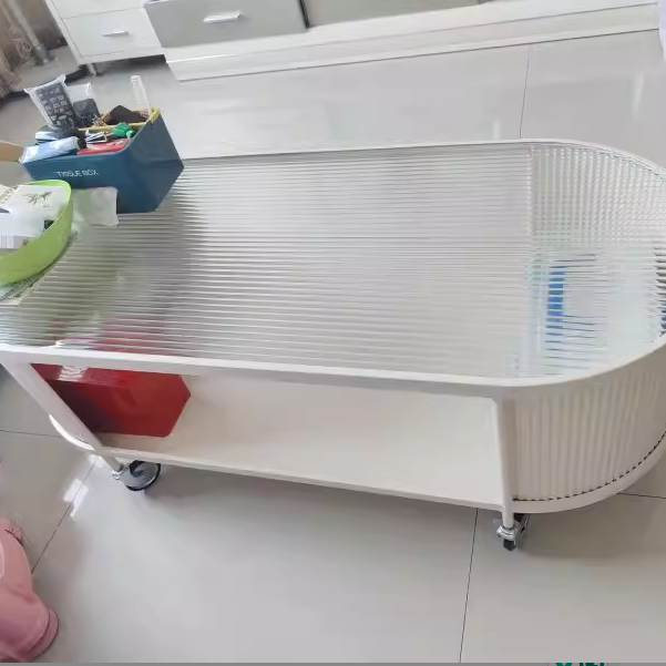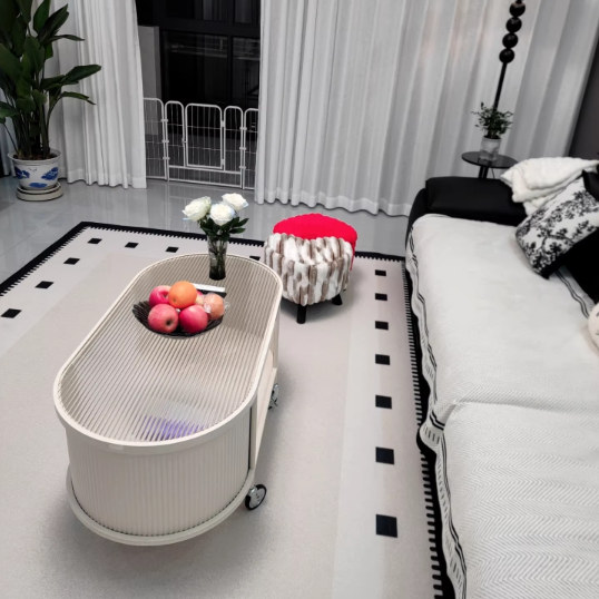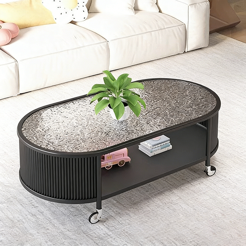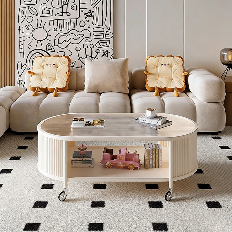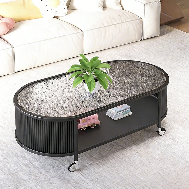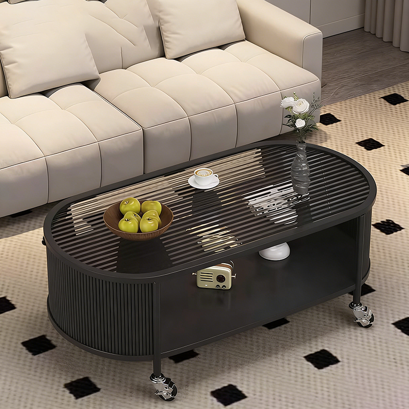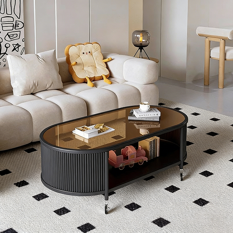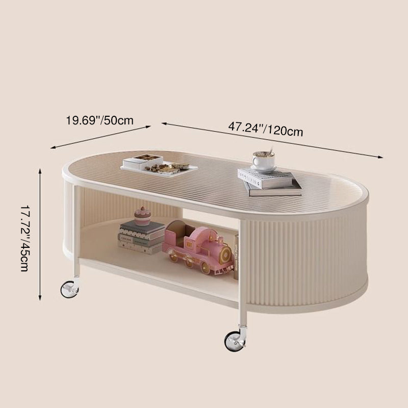 This modern minimalist movable coffee table features an elegant elongated oval silhouette crafted from glass and metal, designed for small living rooms and contemporary homes. Finished in cream or black, it offers a 2-tier open structure and 360° smooth-rolling caster wheels that move effortlessly without damaging floors, blending French cream–inspired softness with clean, functional modern design.