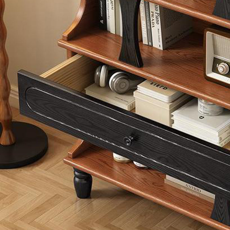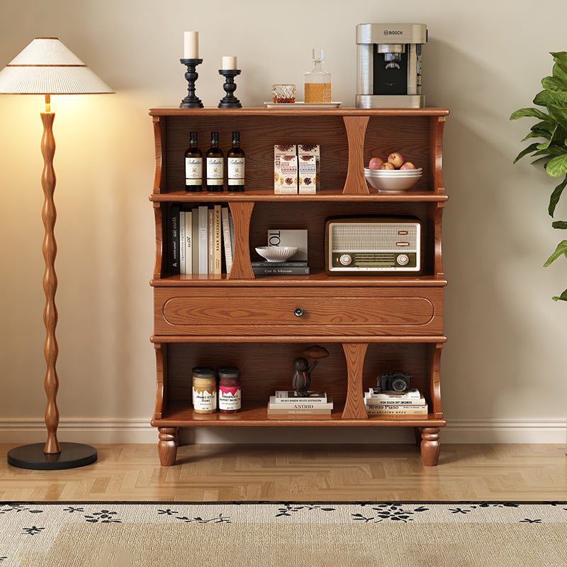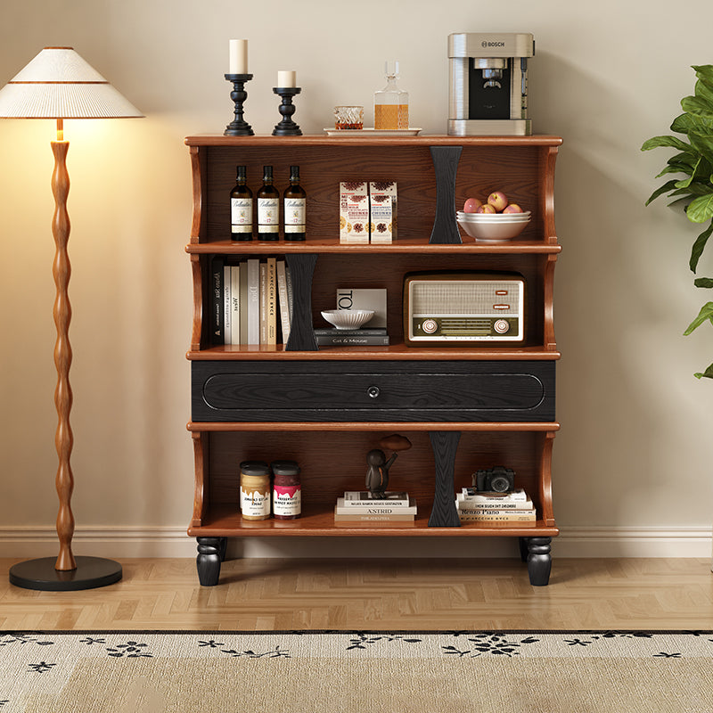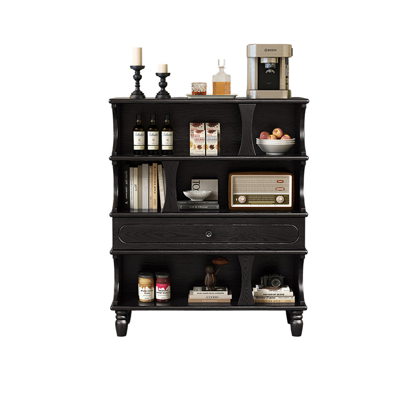 This Traditional French display cabinet is crafted from solid ash wood and features a Roman column rectangular design in elegant vintage and black finishes. With four tiers, including three open storage shelves and a large-capacity drawer, it offers versatile display and organized storage, making it ideal for living rooms, corners, and wall-placed interiors.