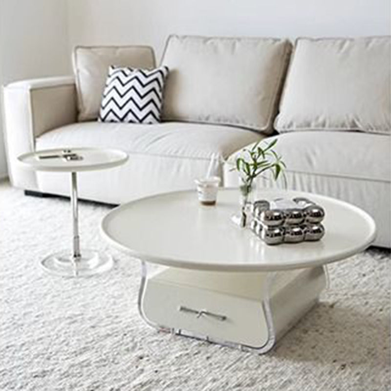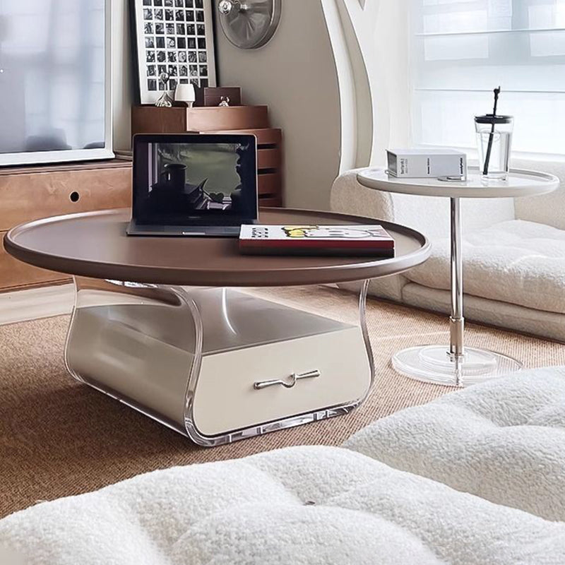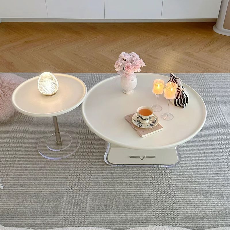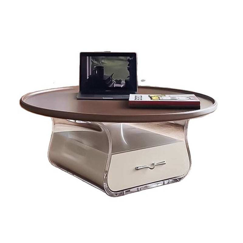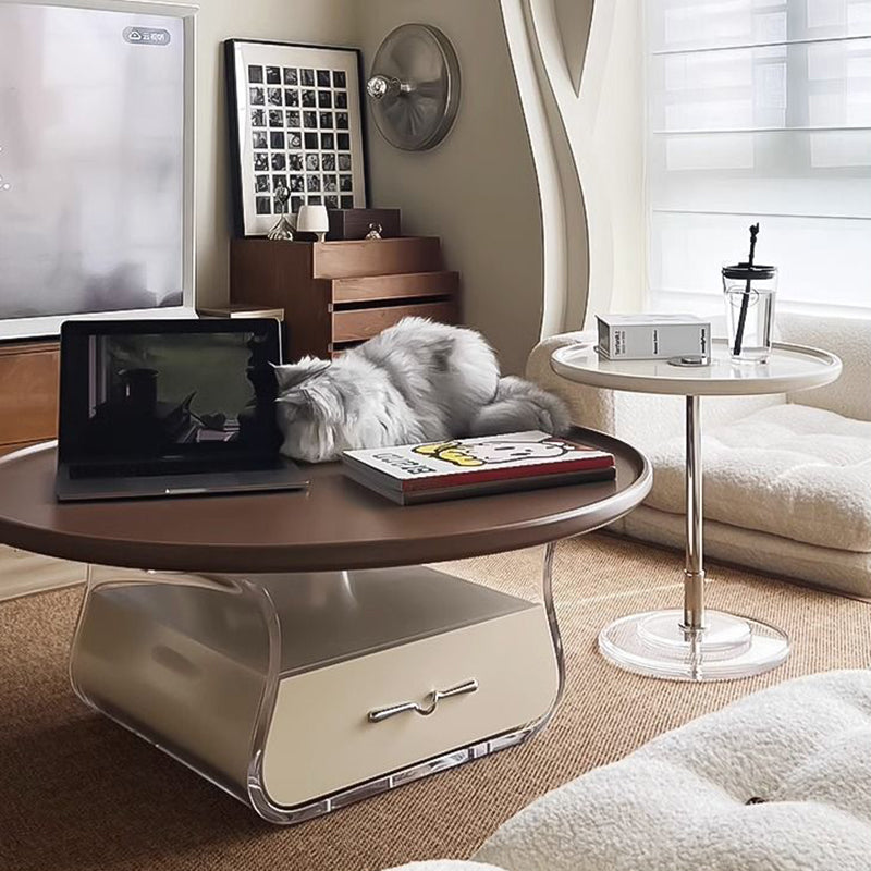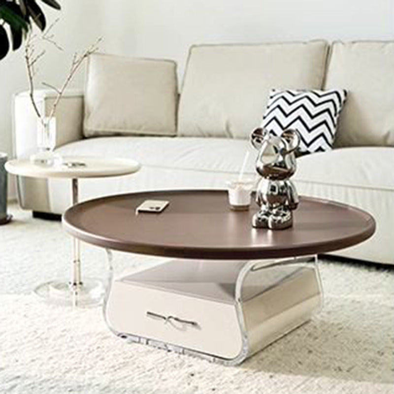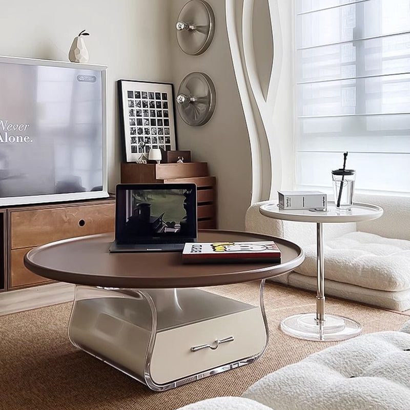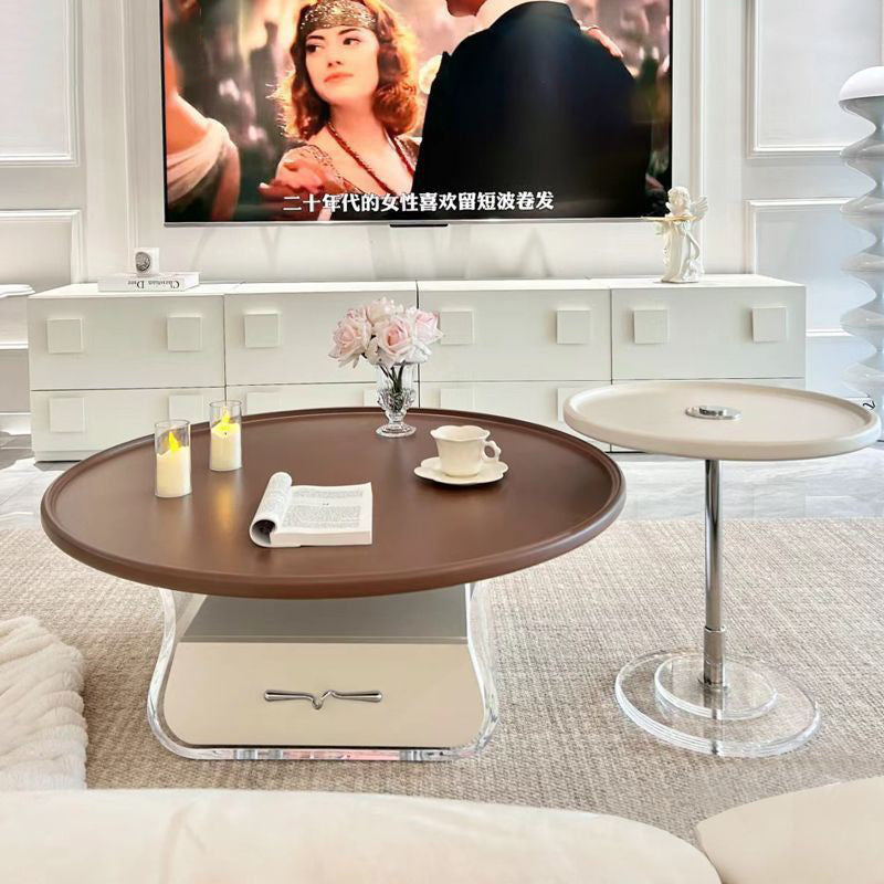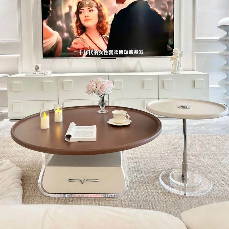 This Traditional French cream-style coffee table features a round curved silhouette crafted from engineered wood, acrylic, and stainless steel, designed for modern small living rooms. Finished in cream white or coffee brown, it offers a 2-tier storage layout, smooth rounded edges with fine polishing, refined stainless steel handles, and silent soft-close drawer slides, delivering light luxury elegance with practical everyday functionality.