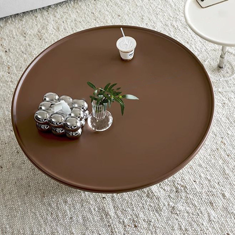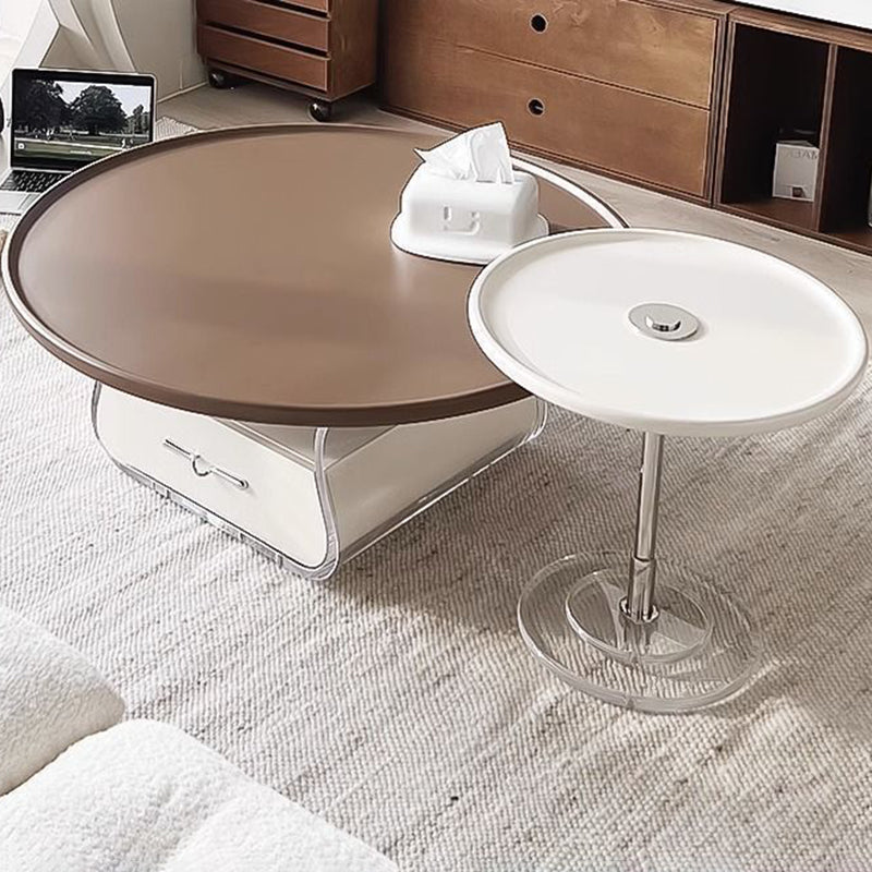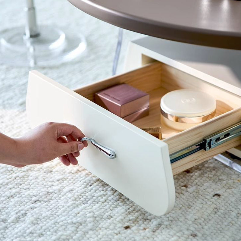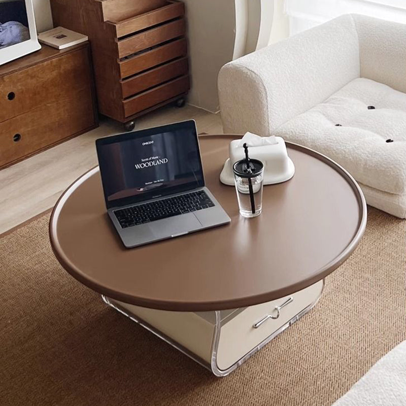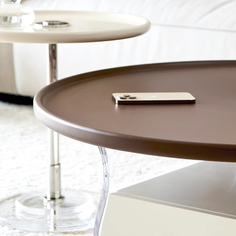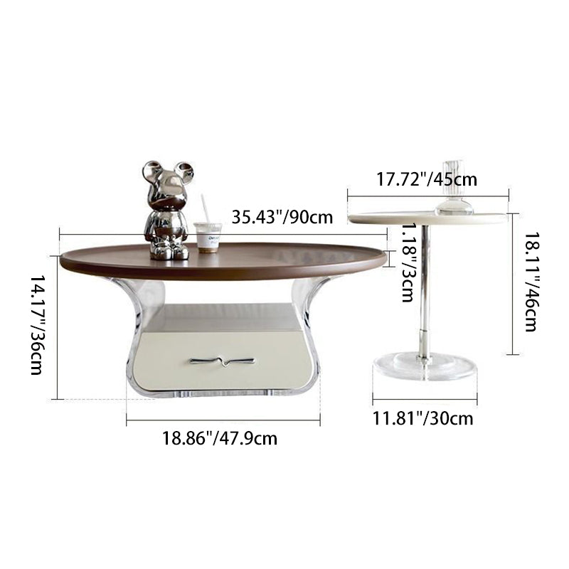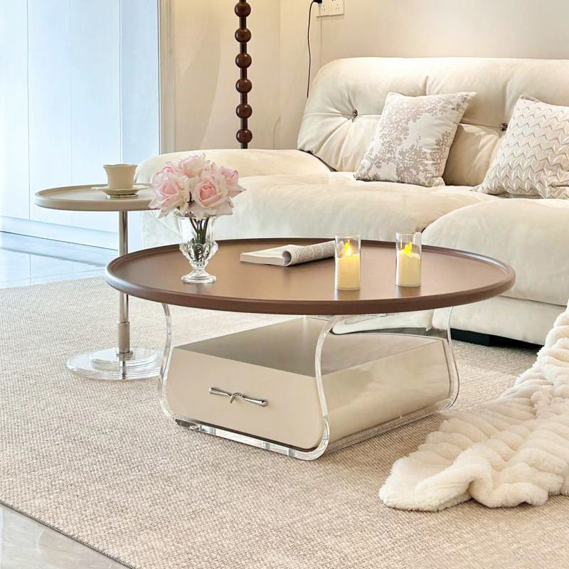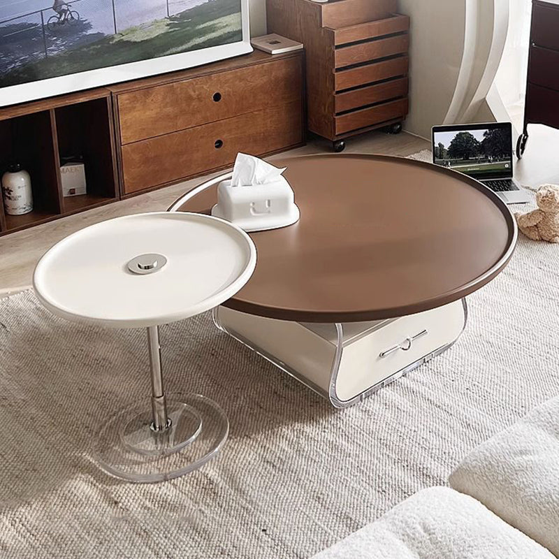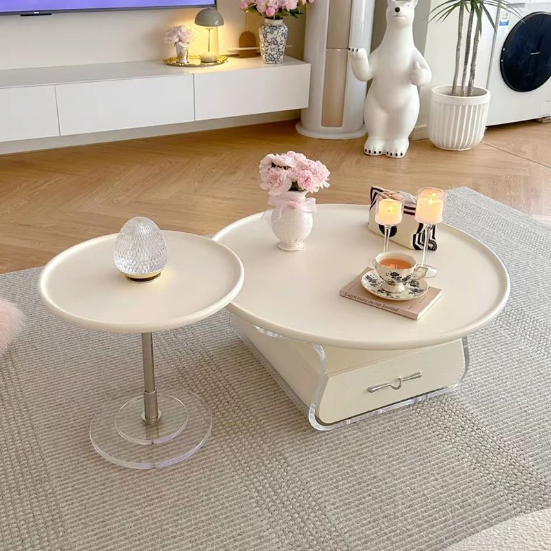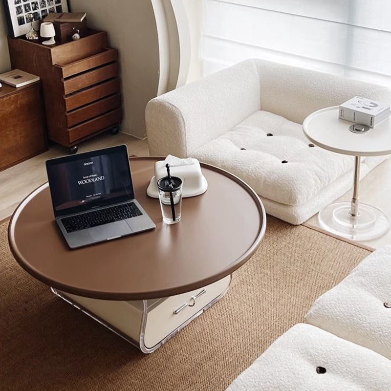 This Traditional French cream-style coffee table features a round curved silhouette crafted from engineered wood, acrylic, and stainless steel, designed for modern small living rooms. Finished in cream white or coffee brown, it offers a 2-tier storage layout, smooth rounded edges with fine polishing, refined stainless steel handles, and silent soft-close drawer slides, delivering light luxury elegance with practical everyday functionality.