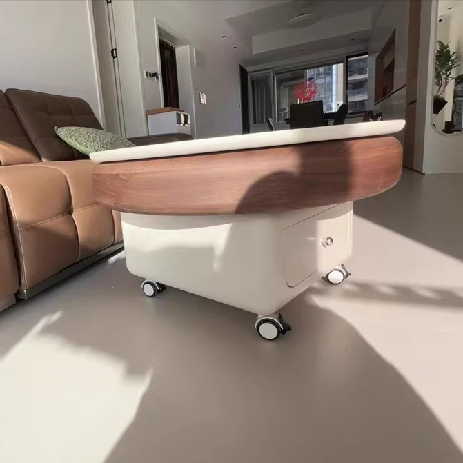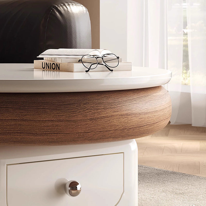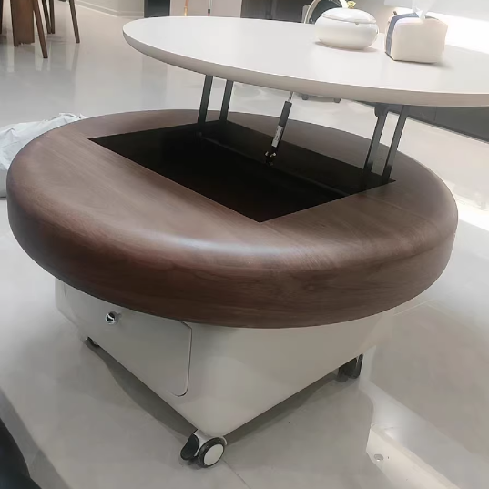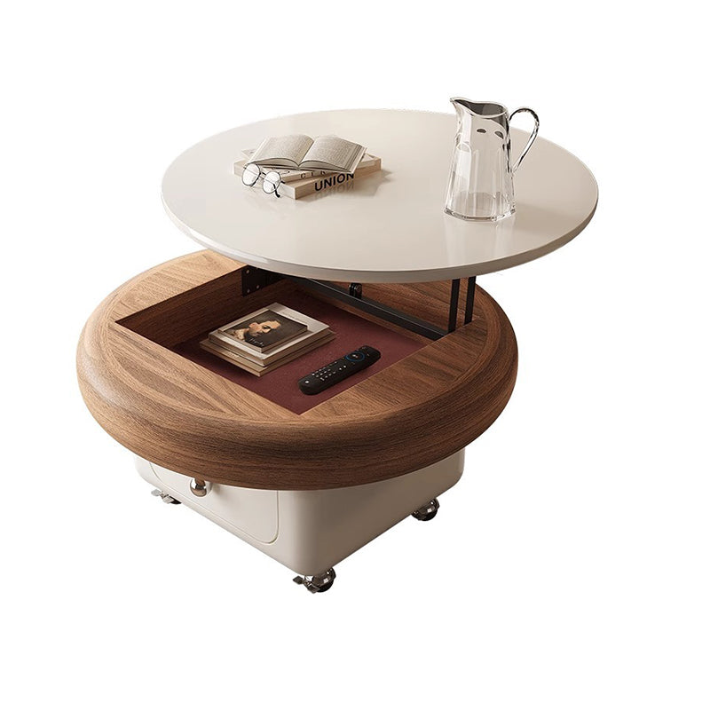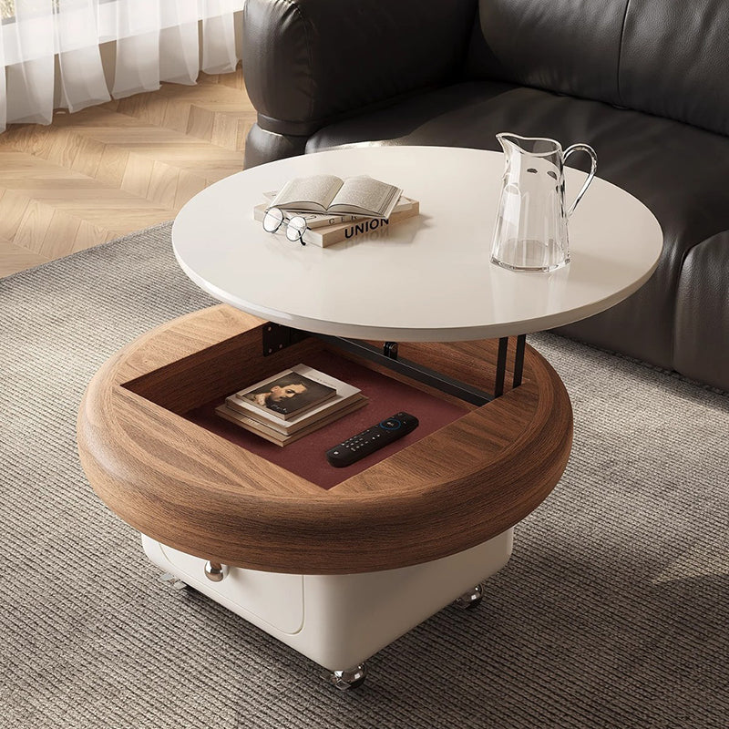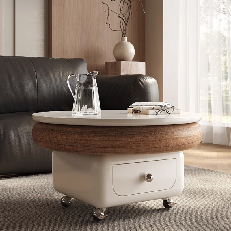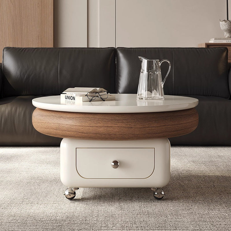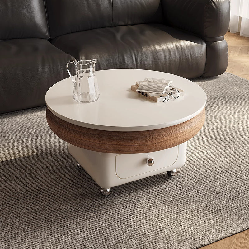 This Traditional French movable coffee table features a refined round and softly rounded square silhouette crafted from sintered stone, solid wood plywood, and metal, designed for elegant living rooms and small spaces. Finished in white or walnut, it includes one integrated drawer, a height-adjustable tabletop, and silent stainless steel caster wheels with brakes to protect floors from scratches, offering smooth mobility, discreet storage, and cream-style light luxury appeal.
