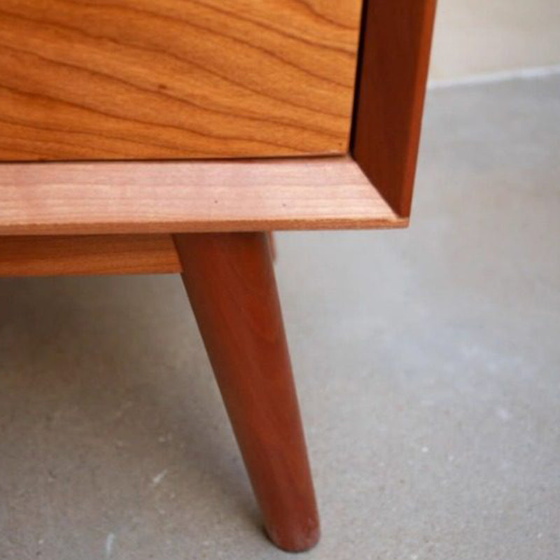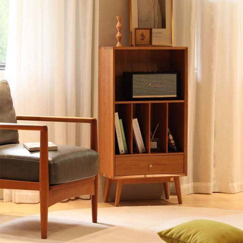 This Japanese-style pine wood storage shelf is designed for vinyl records, books, and magazines, featuring a solid mortise-and-tenon structure for enhanced stability and long-lasting durability. Finished in walnut and cherry tones, with a smoothly polished rectangular frame and cylindrical details, it includes one practical drawer for concealed storage—ideal as a vinyl record cabinet, magazine rack, floor-standing bookshelf, or living room display shelf, blending minimalist aesthetics with warm vintage character.