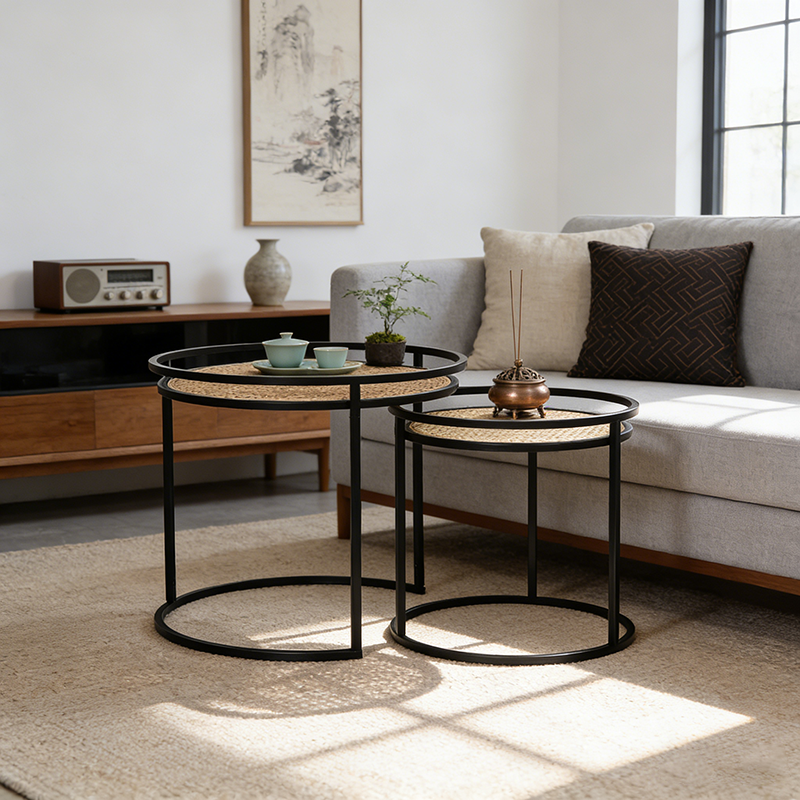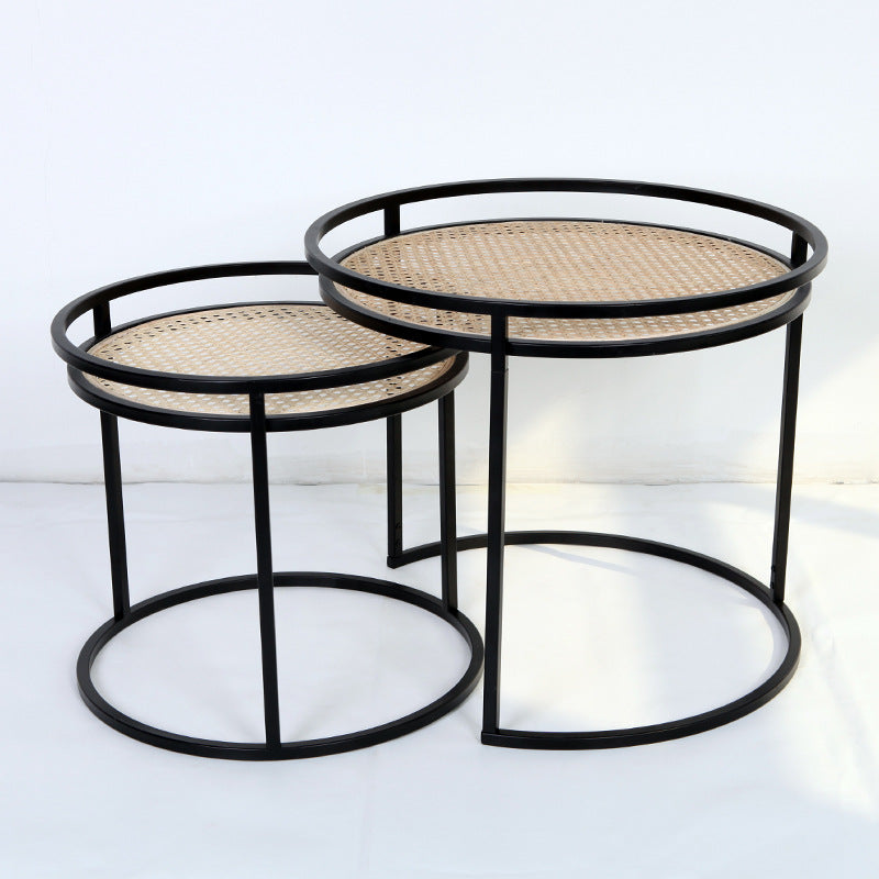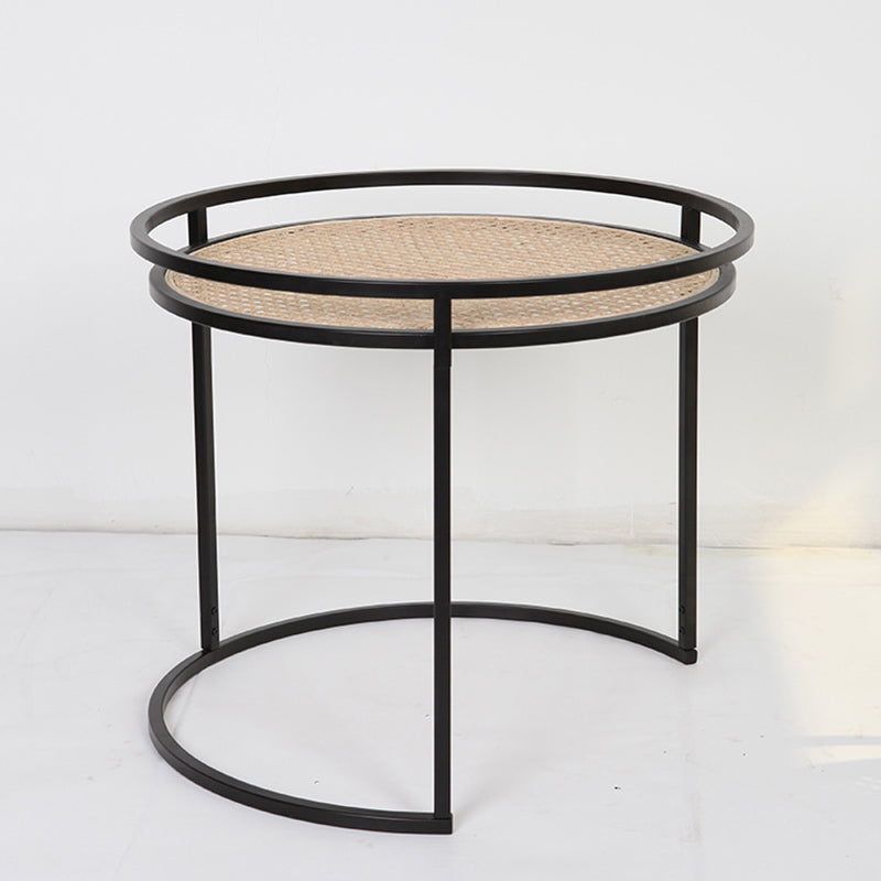 Exuding vintage-inspired character, this round nesting coffee table set pairs sleek black metal tops with natural rattan surfaces to create a captivating layered visual interest. The ingenious two-piece design offers ultimate versatility, allowing the tables to be stacked as a space-saving set or separated for coordinated placement across your living room, balcony, or study. Built on sturdy iron frames for lasting support, each piece features handwoven rattan that infuses the industrial silhouette with organic warmth and breathability. Whether used to host afternoon tea or display your favorite books and plants, this set masterfully combines retro charm with modern practicality, adapting effortlessly to the rhythms of flexible living.