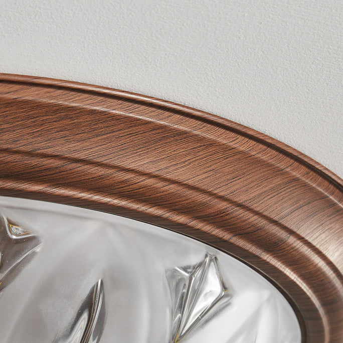 This traditional Chinese semi-dome flush mount ceiling light combines high-transparency glass with sturdy iron in a warm walnut finish. Featuring a soft, full-spectrum LED glow with a gentle textured design, it brings a cozy, vintage charm to any bedroom.