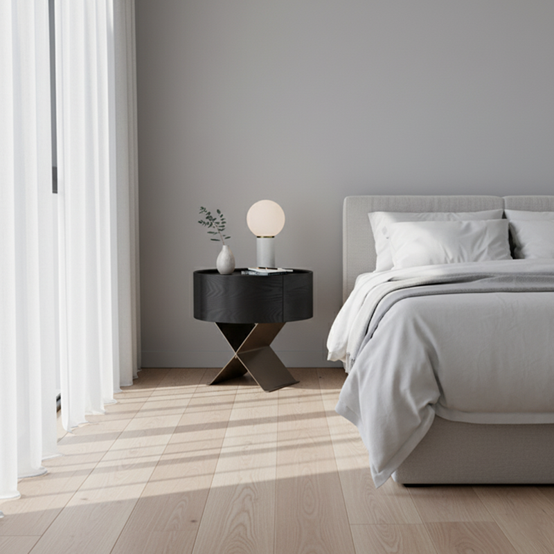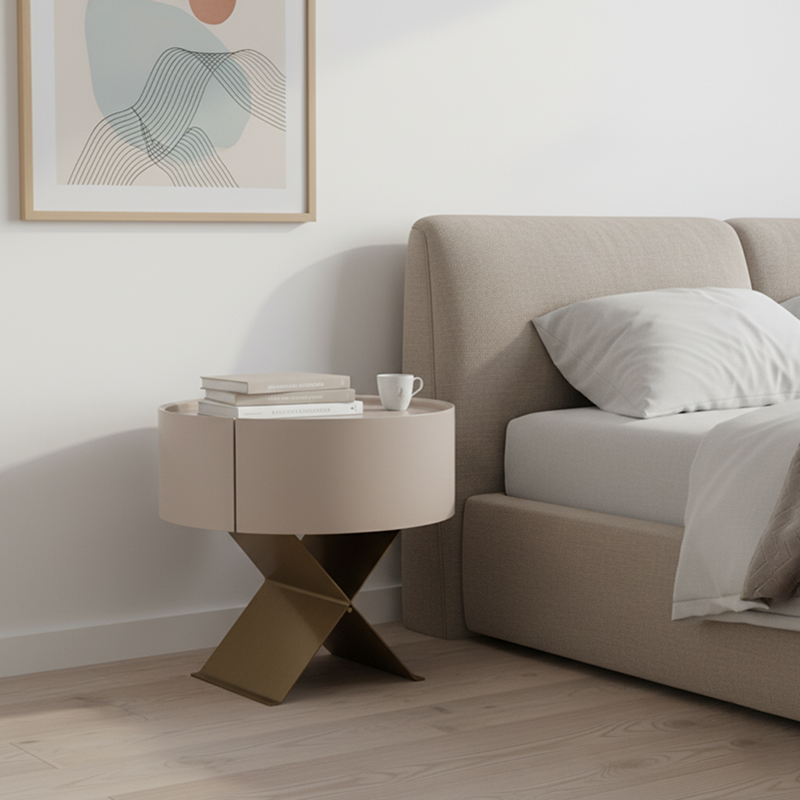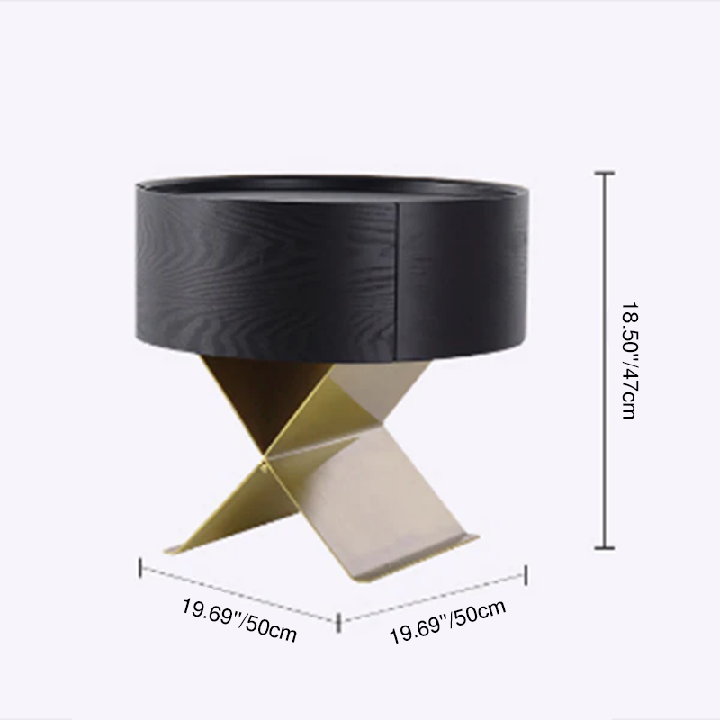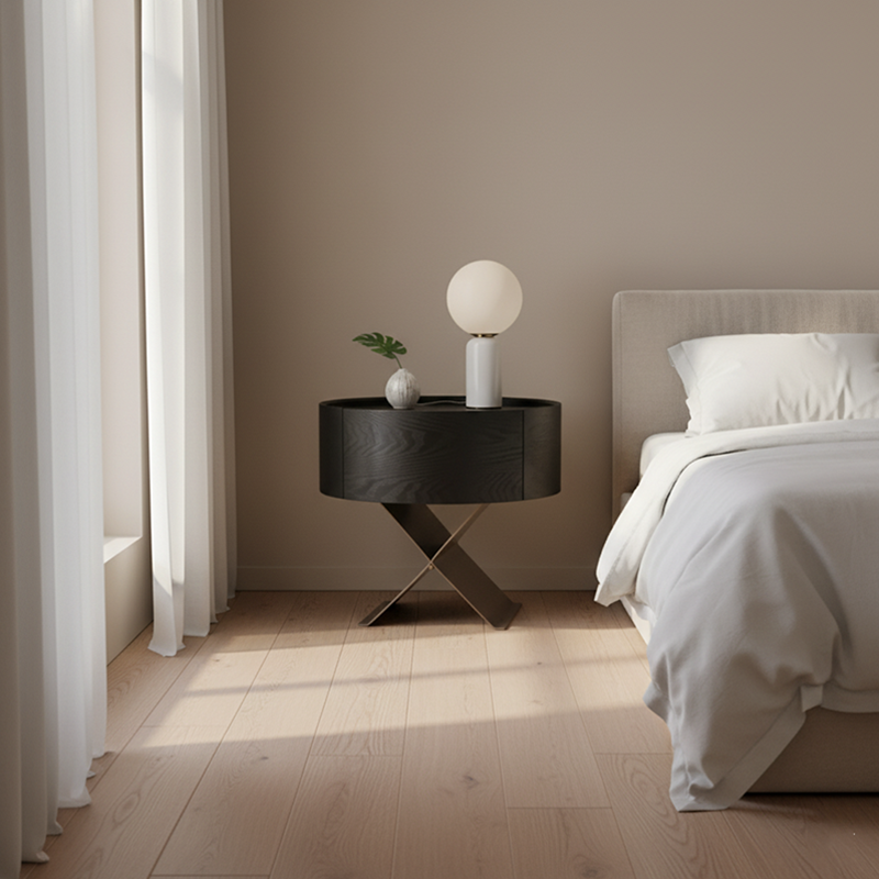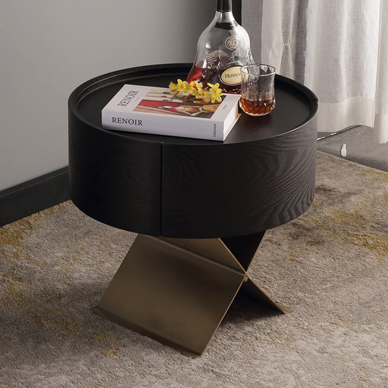 The sophistication of contemporary industrial style is embodied in this nightstand. The smoked wood veneer top displays natural wood grain, with a clear and elegant texture that exudes luxury; the cabinet is made of high-quality solid wood multi-layer board, a sturdy material that balances durability and eco-friendliness, free from harmful pollution and suitable for healthy home scenarios. The circular drawer is fitted with smooth tracks, sliding without any jamming, saving space while neatly storing bedtime essentials; the brushed champagne gold iron base is wear-resistant and corrosion-resistant, stably supporting the cabinet, hiding strong load-bearing capacity under its lightweight appearance, adding an industrial-style light luxury vibe to the bedroom.