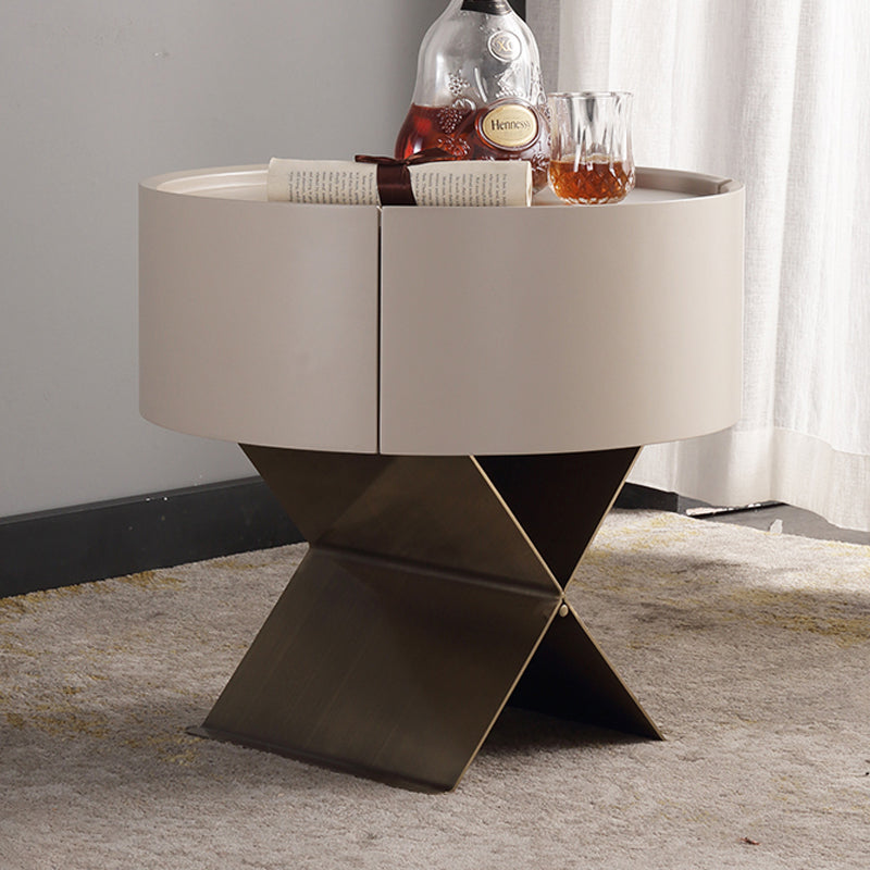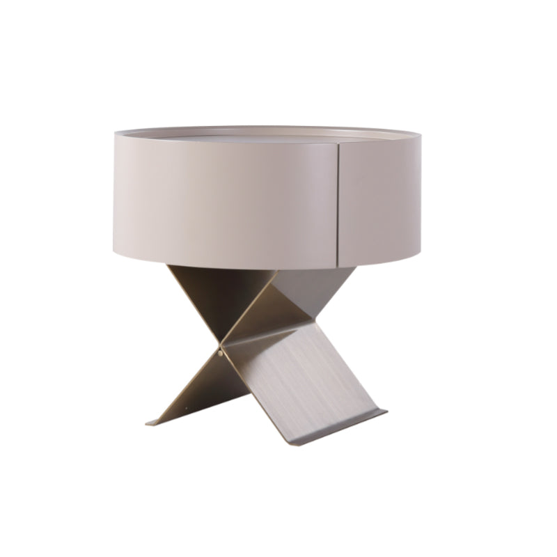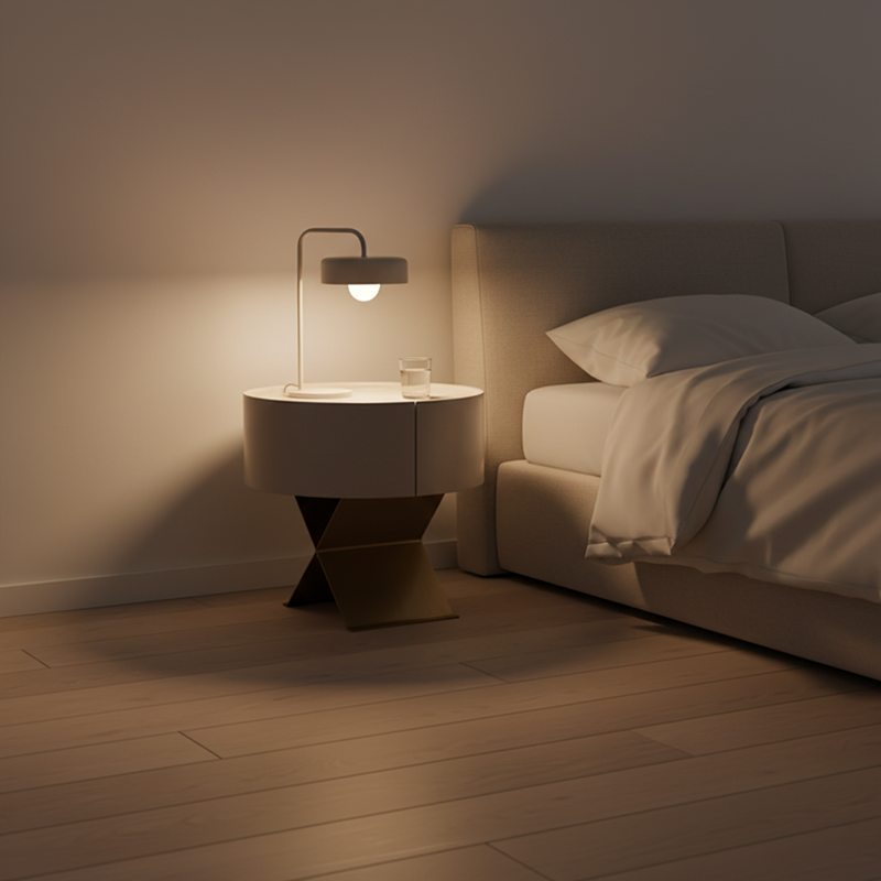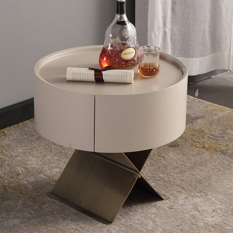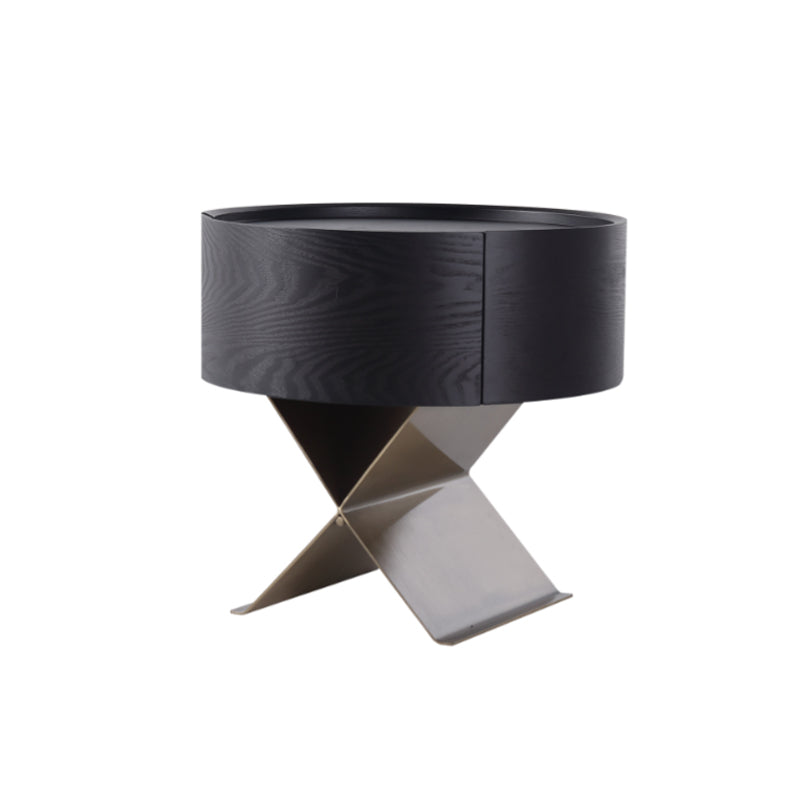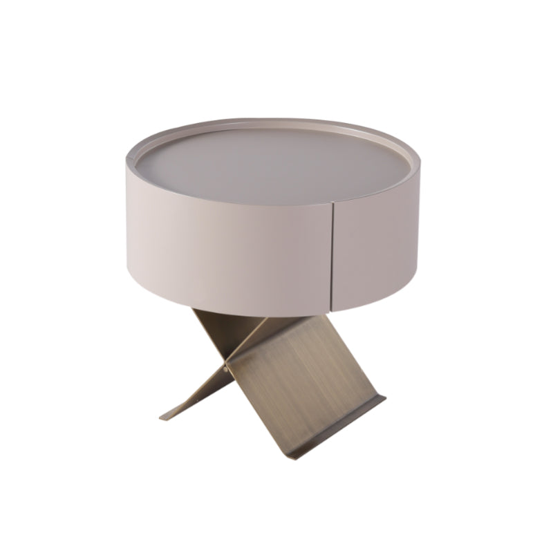 The sophistication of contemporary industrial style is embodied in this nightstand. The smoked wood veneer top displays natural wood grain, with a clear and elegant texture that exudes luxury; the cabinet is made of high-quality solid wood multi-layer board, a sturdy material that balances durability and eco-friendliness, free from harmful pollution and suitable for healthy home scenarios. The circular drawer is fitted with smooth tracks, sliding without any jamming, saving space while neatly storing bedtime essentials; the brushed champagne gold iron base is wear-resistant and corrosion-resistant, stably supporting the cabinet, hiding strong load-bearing capacity under its lightweight appearance, adding an industrial-style light luxury vibe to the bedroom.