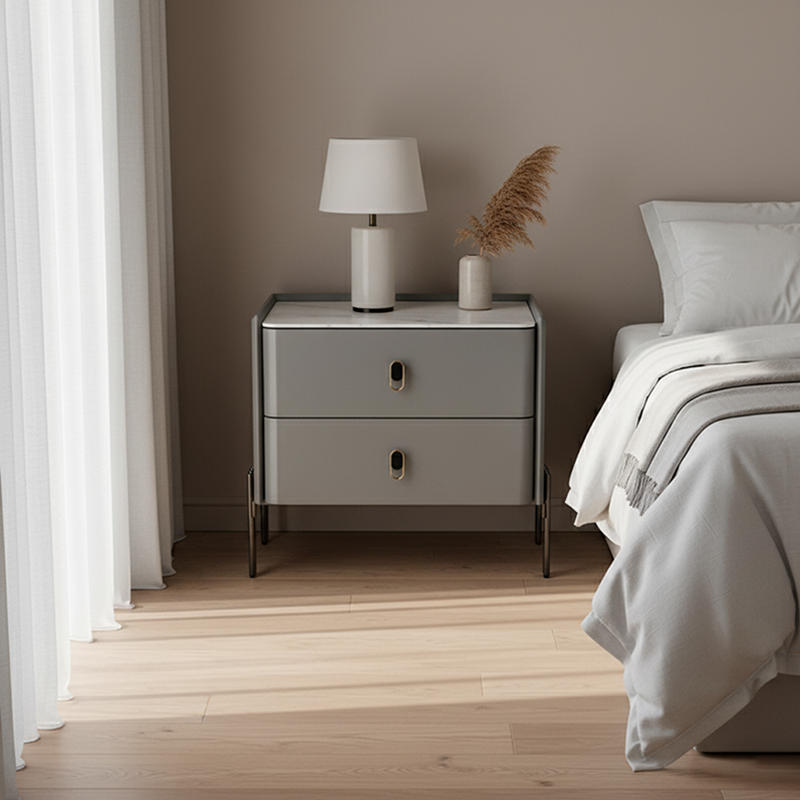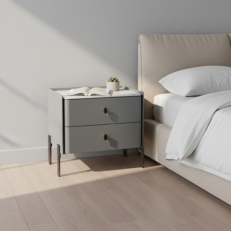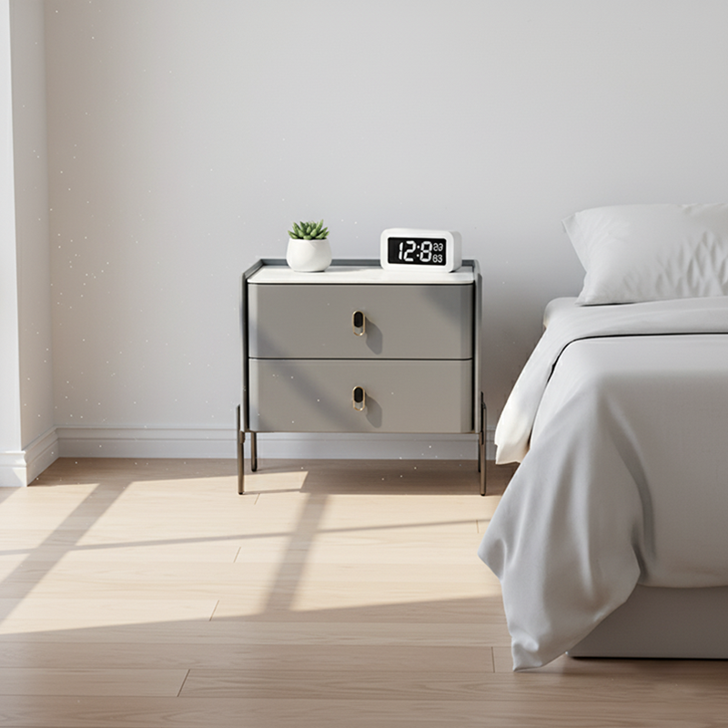 This contemporary Scandinavian nightstand is a minimalist bedroom standout. Its hard, wear-resistant rock slab top wipes clean instantly; its cool texture adds subtle Scandinavian luxury. Made with E1 eco-friendly MDF, it’s formaldehyde-free, balancing health and durability. Two large drawers with smooth rails glide effortlessly, organizing personal and daily items neatly. Slim, corrosion-resistant stainless steel legs support stably, fitting Scandinavian minimalism while merging simplicity and practicality.