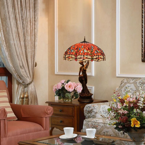 Tiffany Deko-Göttin Libelle Harz Buntglas 3-Licht Tischlampe