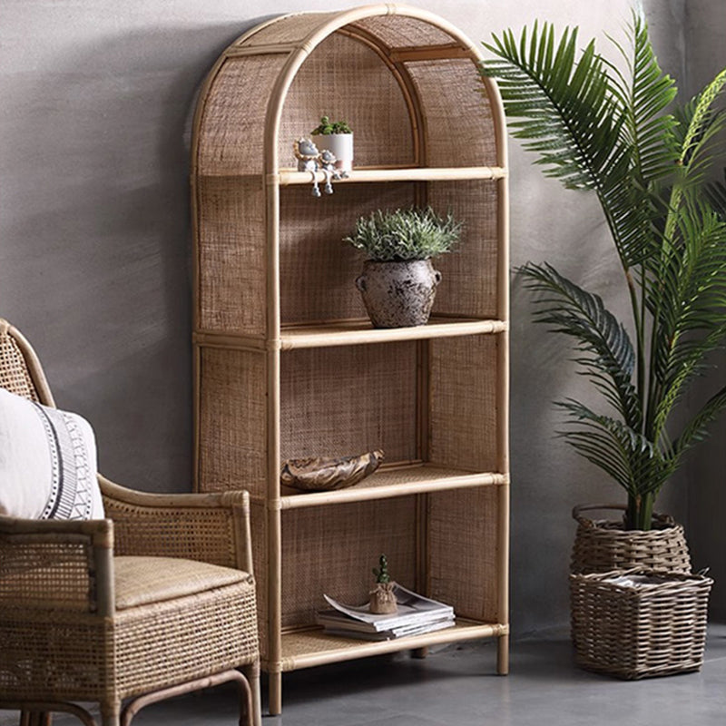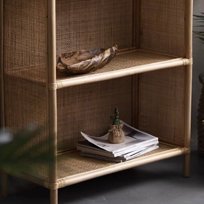 Open shelving with four spacious tiers allows easy organization and display of books, décor, plants, or garden tools—combining storage and presentation in one open rattan shelving unit. -