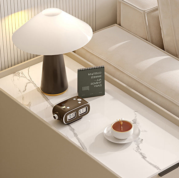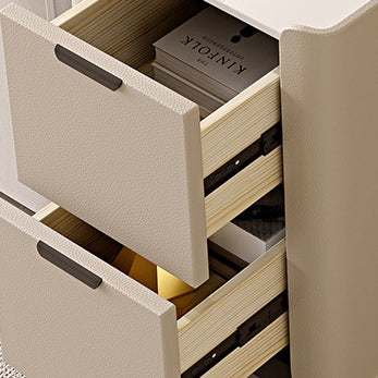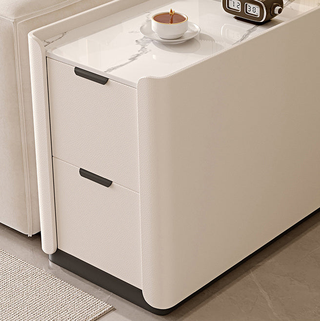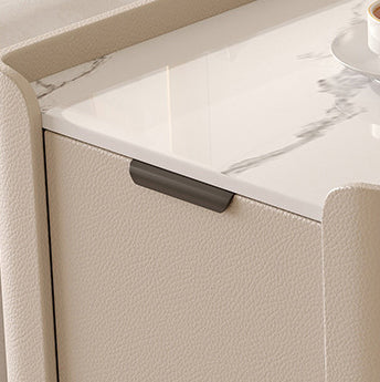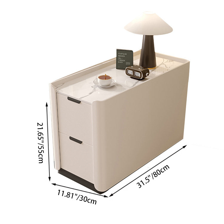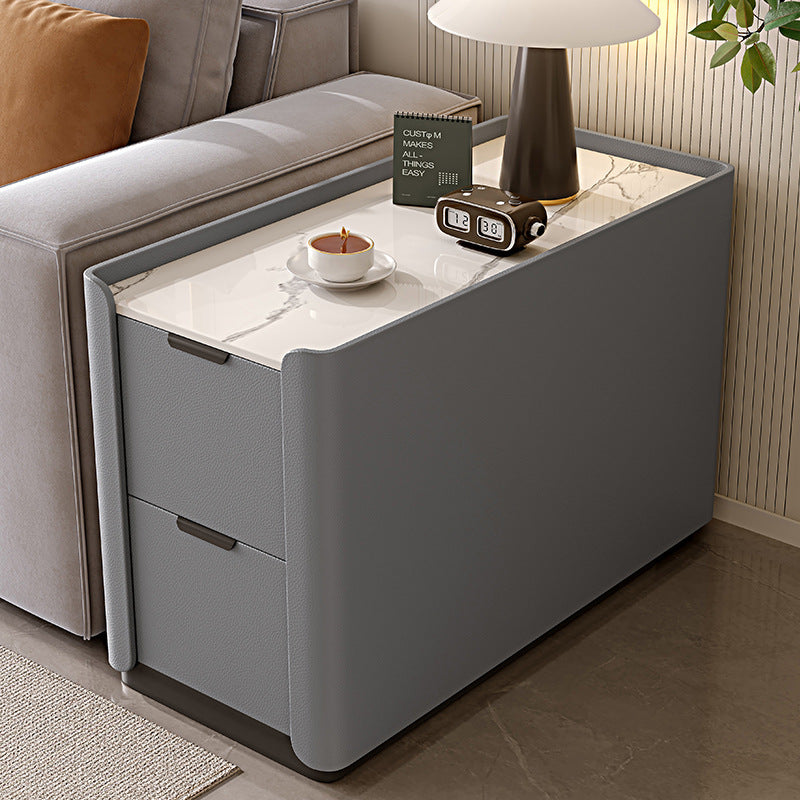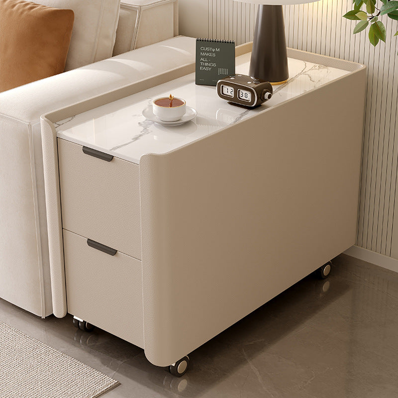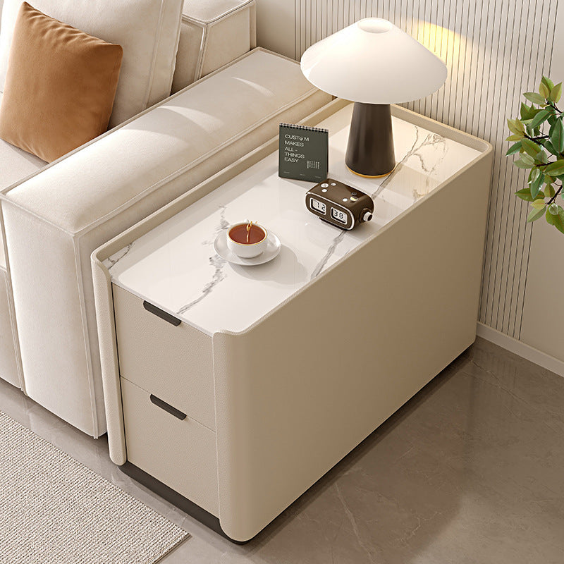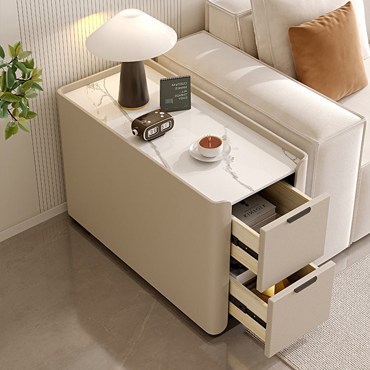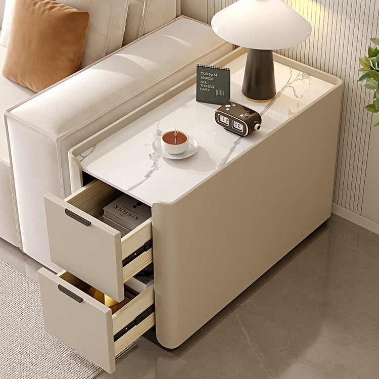 This Contemporary Scandinavian nightstand features a durable sintered stone top, faux leather accents, and a rounded rectangular profile for a clean, modern look. Built with a stable fire- and heat-resistant structure, it offers two smooth drawers and comes in khaki, off-white, orange, light gray, dark gray, and deep coffee, making it a practical and stylish storage solution for the bedroom.