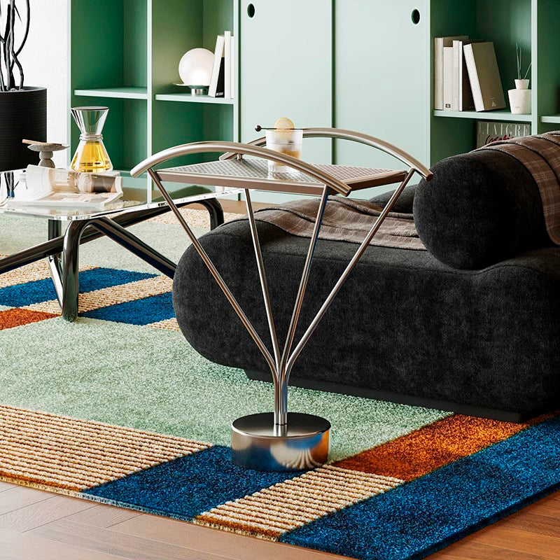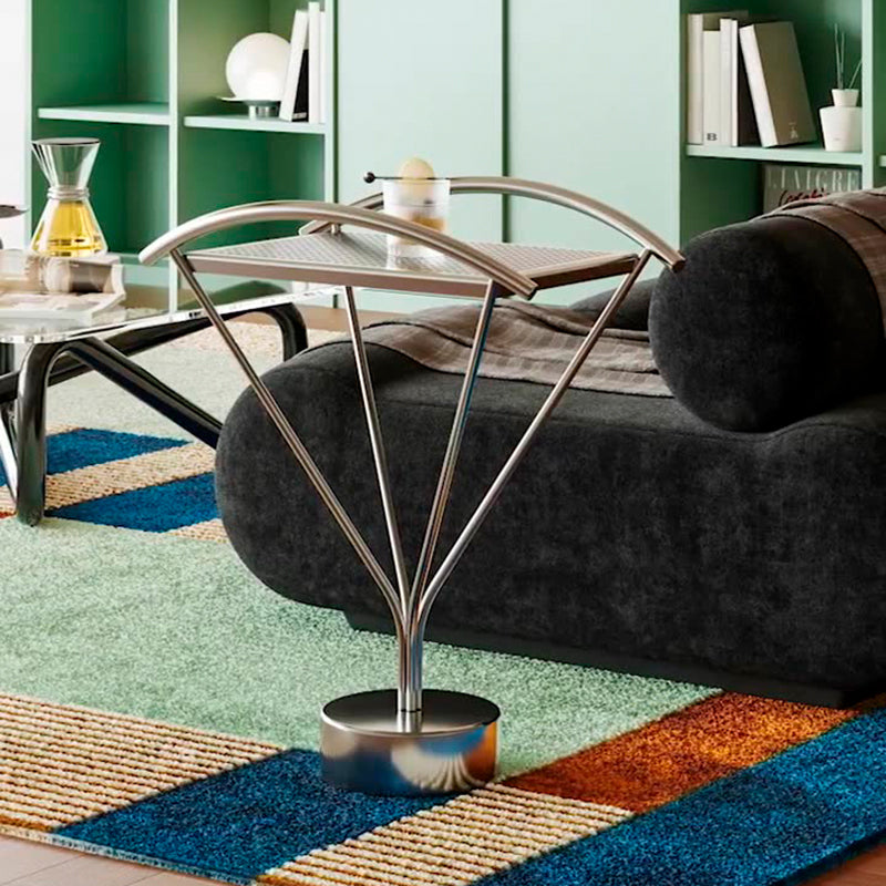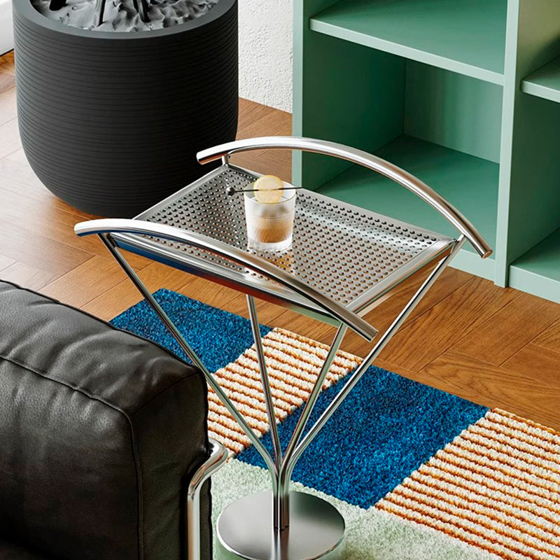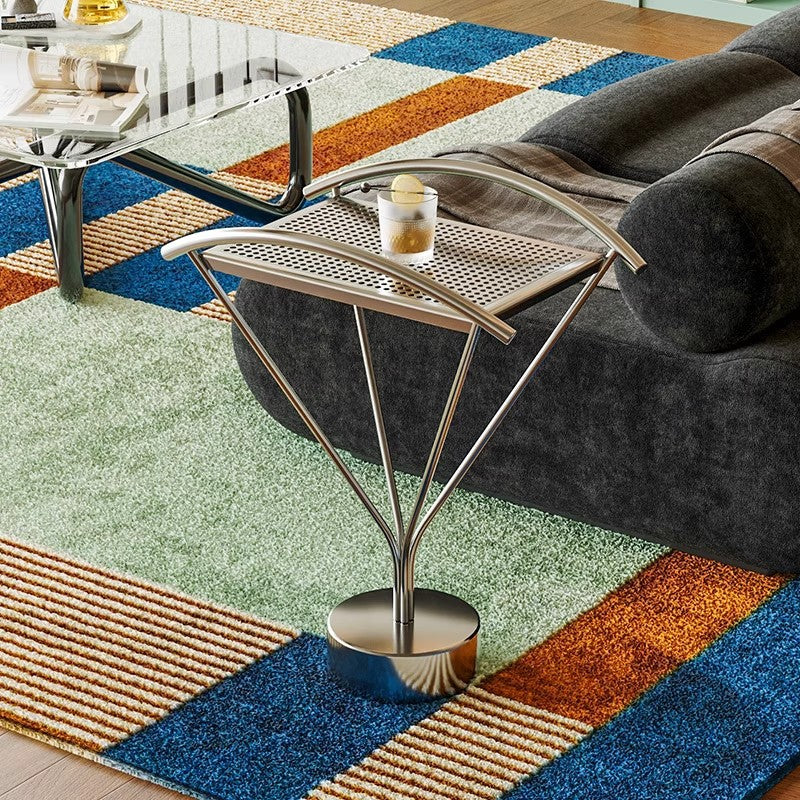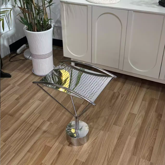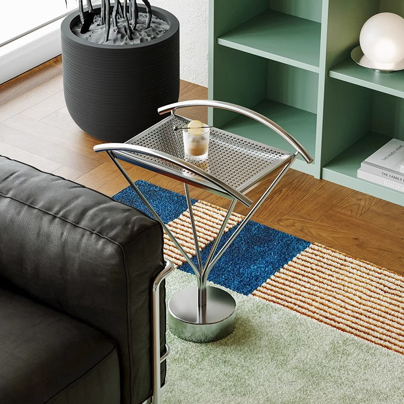This contemporary creative side table features a stainless steel curved and hollow square design with a solid weighted base for stability and a built-in curved handle for easy portability. The sleek silver finish and 1-tier structure make it a stylish, functional accent piece for modern living rooms.