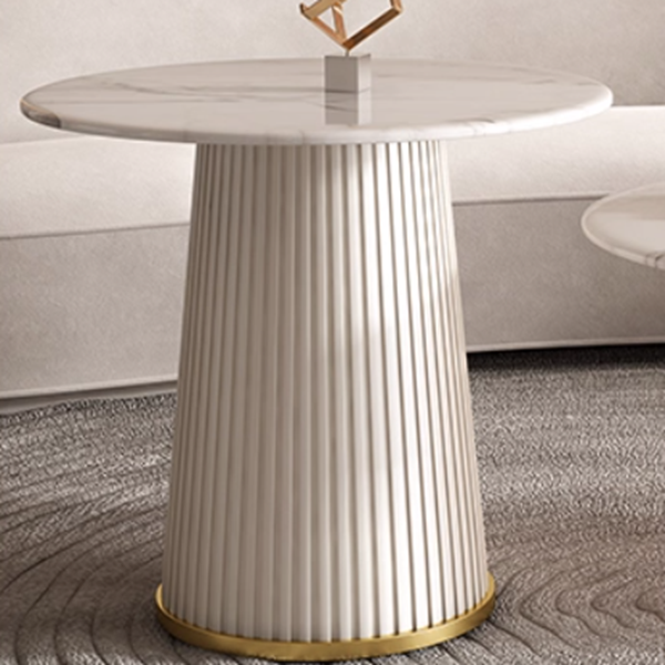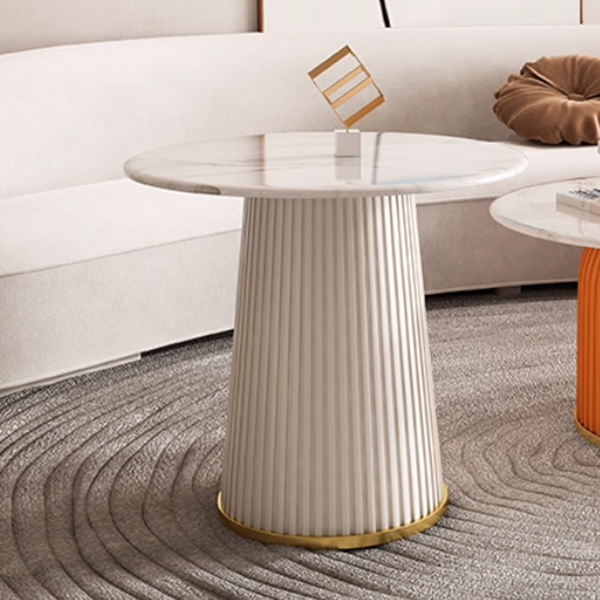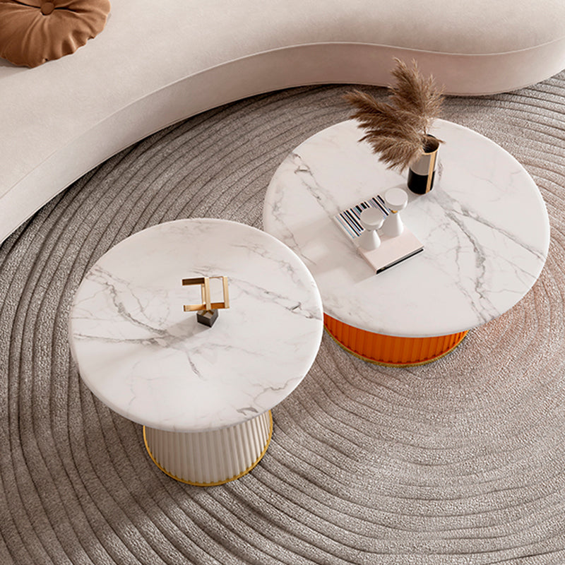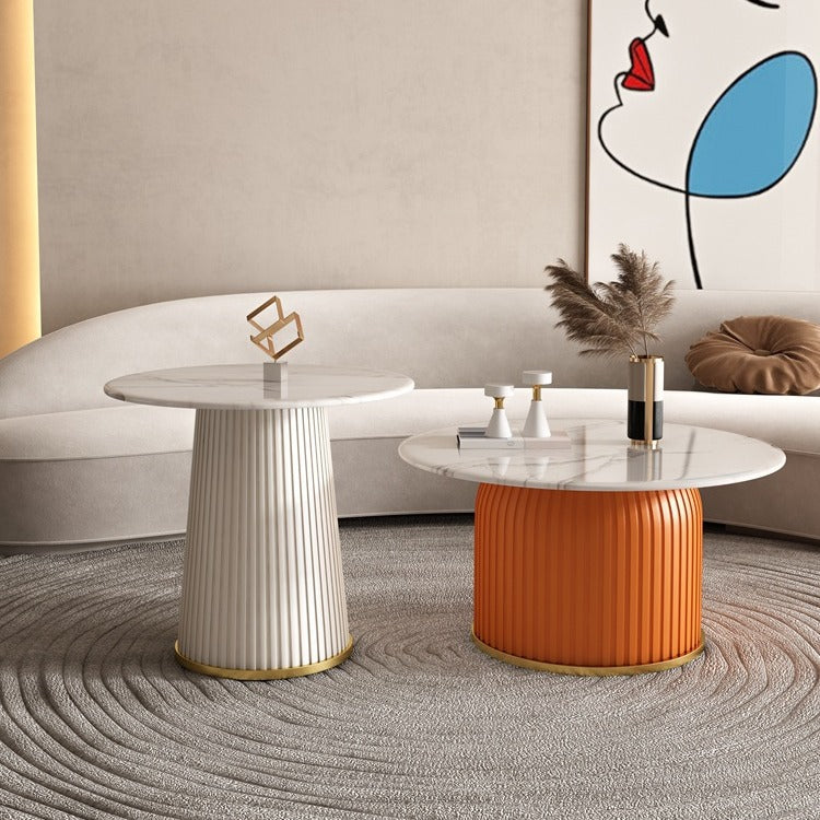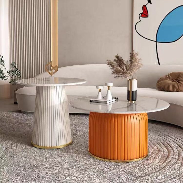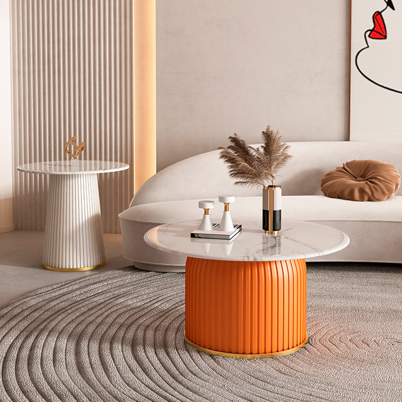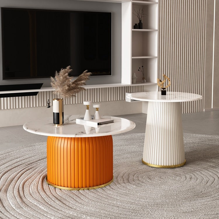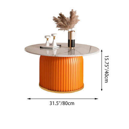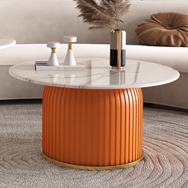 This Contemporary Scandinavian coffee table features a round tabletop with a cylindrical base, crafted from sintered stone and metal for a clean yet luxurious look. Designed as a 1-tier table, it offers heat resistance, scratch resistance, corrosion protection, and fade-free eco-friendly performance, finished in orange or white, making it an ideal choice for modern living rooms and small apartments with a refined, designer appeal.