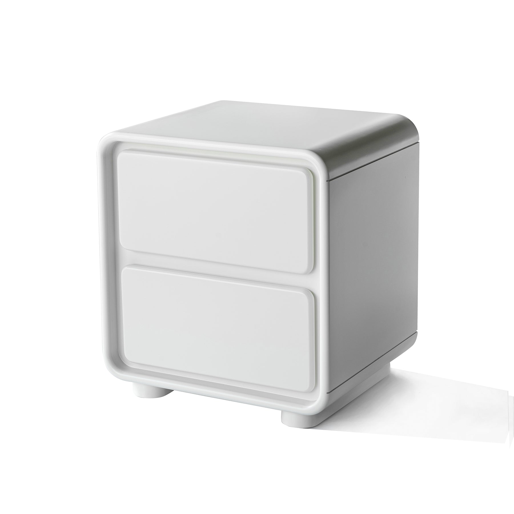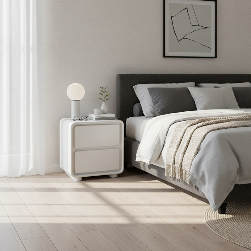 This modern minimalist nightstand features a clean rectangular silhouette crafted from E1 eco-friendly MDF, offering durability, stability, and a safe, odor-free experience for the bedroom. The smooth white finish pairs beautifully with its rounded corner design, reducing bumps and enhancing comfort in daily use. With two enclosed drawers supported by smooth sliding rails and built-in recessed handles, it ensures effortless access and neatly organized storage. The open tabletop provides convenient space for lamps, décor, or nighttime essentials, making it an ideal bedside companion for modern homes.