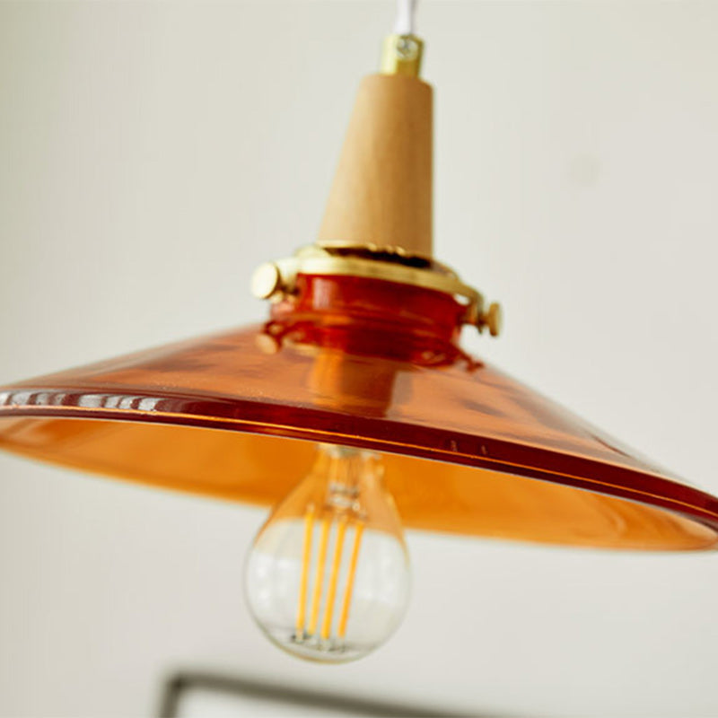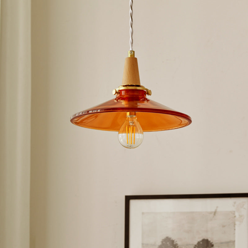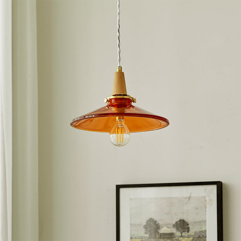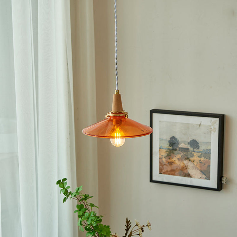 Traditionelle Vintage Pendelleuchte aus Messing, massivem Holz und Glas mit konischem Schirm, 1-flammig, für das Schlafzimmer