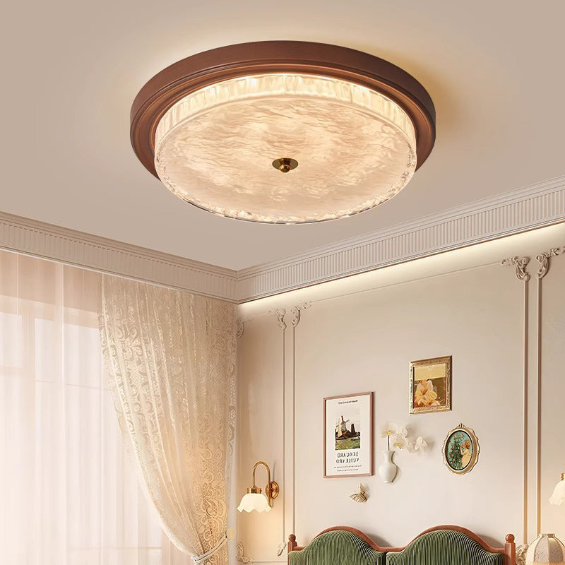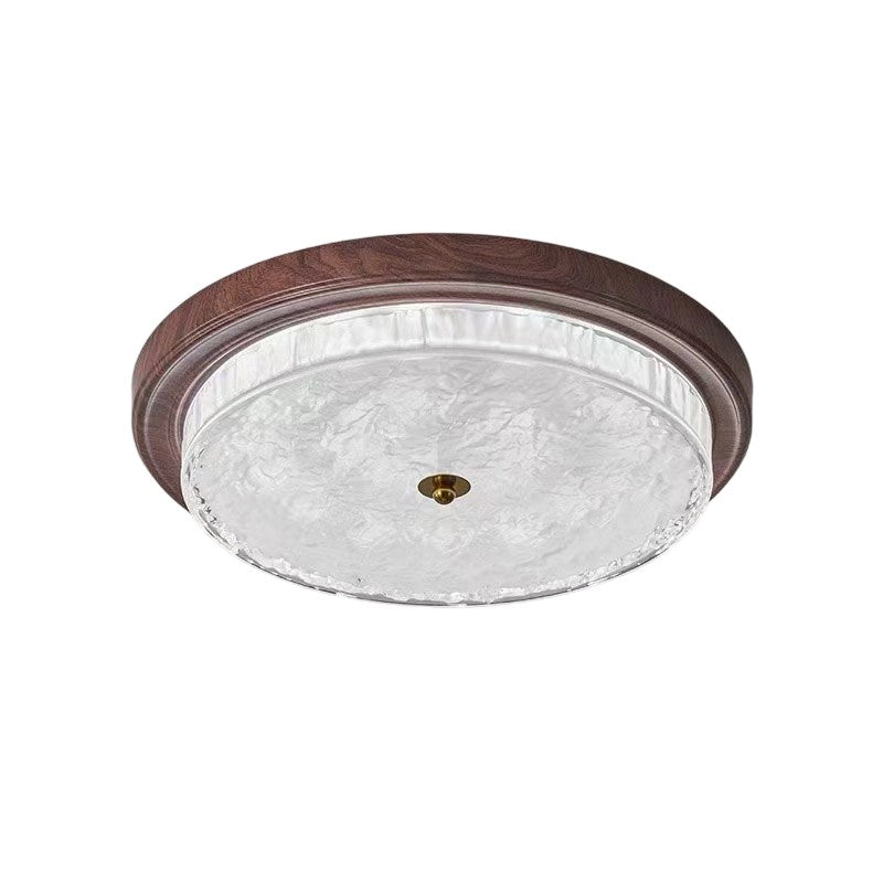 Diese traditionelle, vintage Deckenleuchte mit bündiger Montage verfügt über einen Glasschirm mit Wasserwellenmuster und einen robusten Eisenrahmen in Walnussoptik. Ihre LED-Beleuchtung liefert ein weiches, augenfreundliches Leuchten mit gleichmäßiger Textur—ideal für eine gemütliche Schlafzimmeratmosphäre.