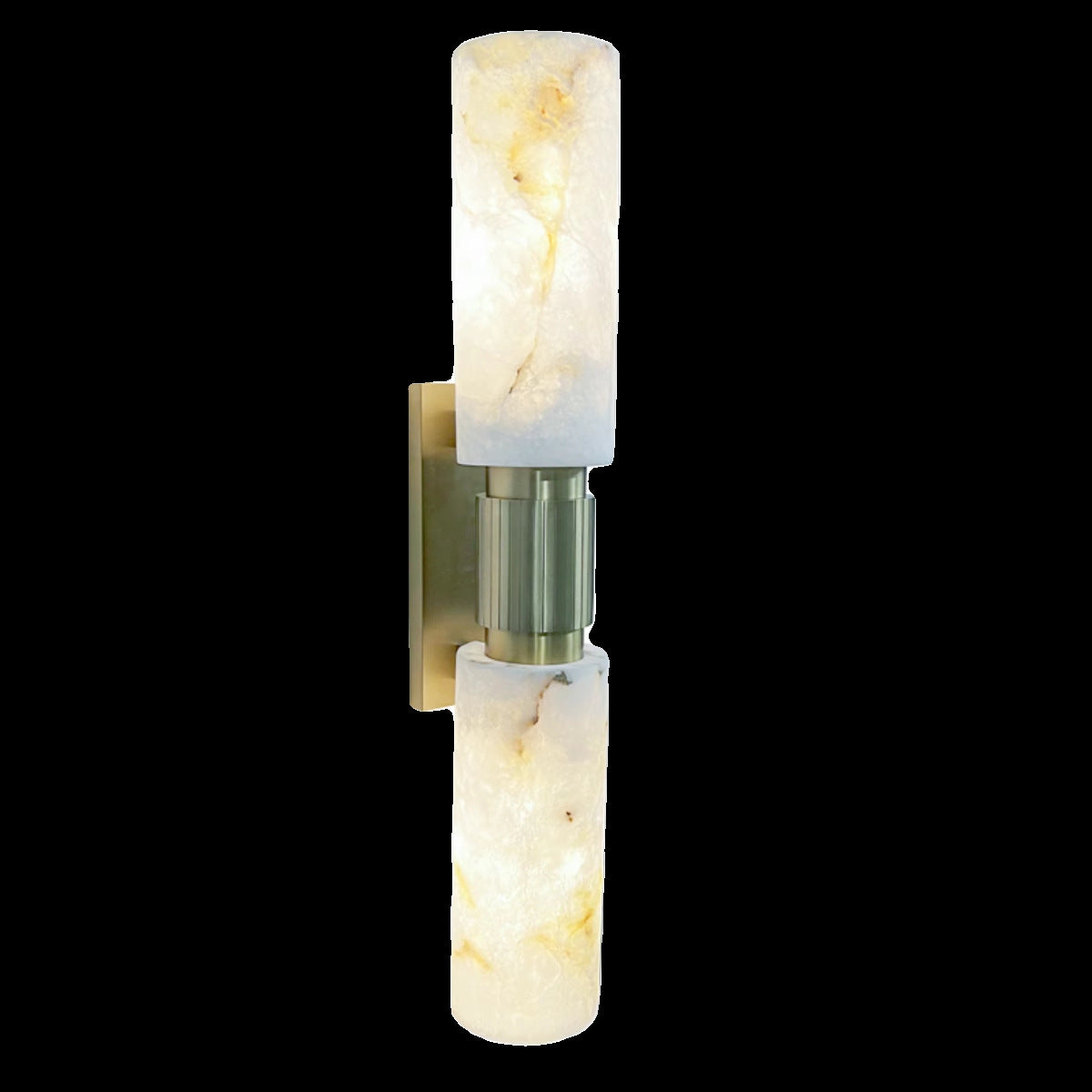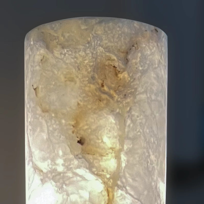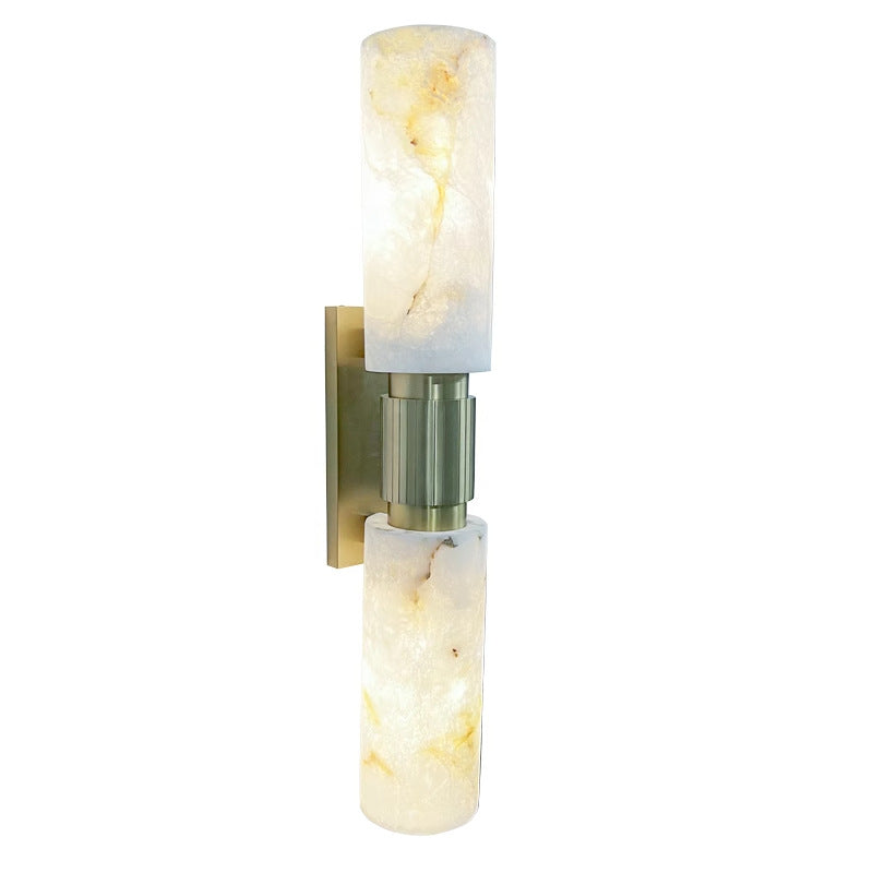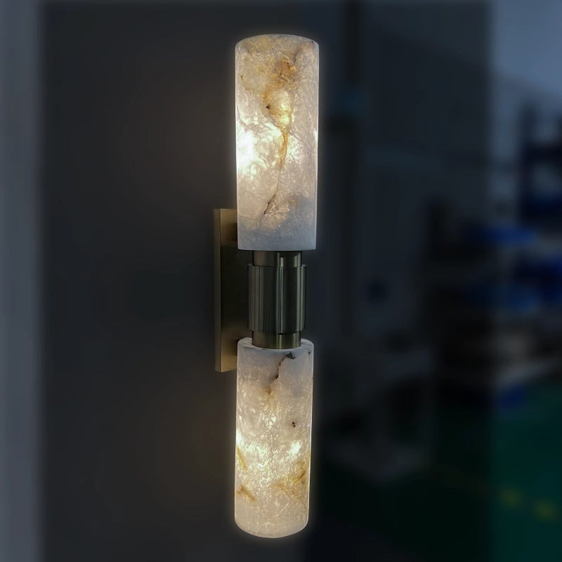 Diese traditionelle, vintage-inspirierte Wandleuchte aus natürlichem Marmor und Messing verfügt über eine zylinderförmige Silhouette mit zwei Glühbirnen, die ein weiches, ambientes Licht werfen, ideal für Schlafzimmer und Wohnzimmer. Ihr kupferfarbener Finish und die hochwertigen Steinelemente verleihen jedem Raum zeitlose Eleganz und gemütliche Wärme.