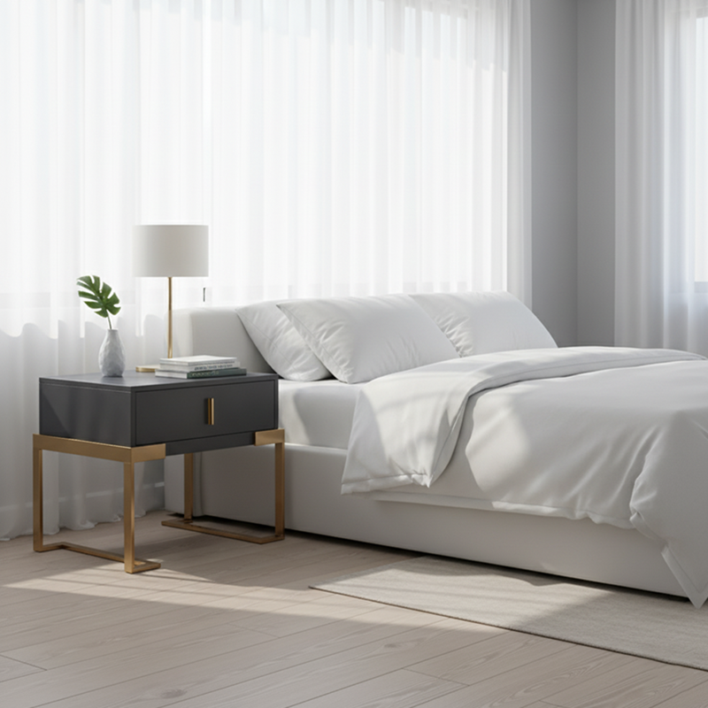 Elevate your space with this contemporary industrial-style bedside table. Boasting a streamlined rectangular form, it features a robust E1 eco-friendly board frame, premium solid wood drawers for effortless storage, iron legs, and a luxuriously smooth baked paint finish. Its crisp lines exude sophisticated yuppie elegance, serving as a distinctive bedroom storage centerpiece and iconic industrial design touch, fusing rugged character with polished refinement.