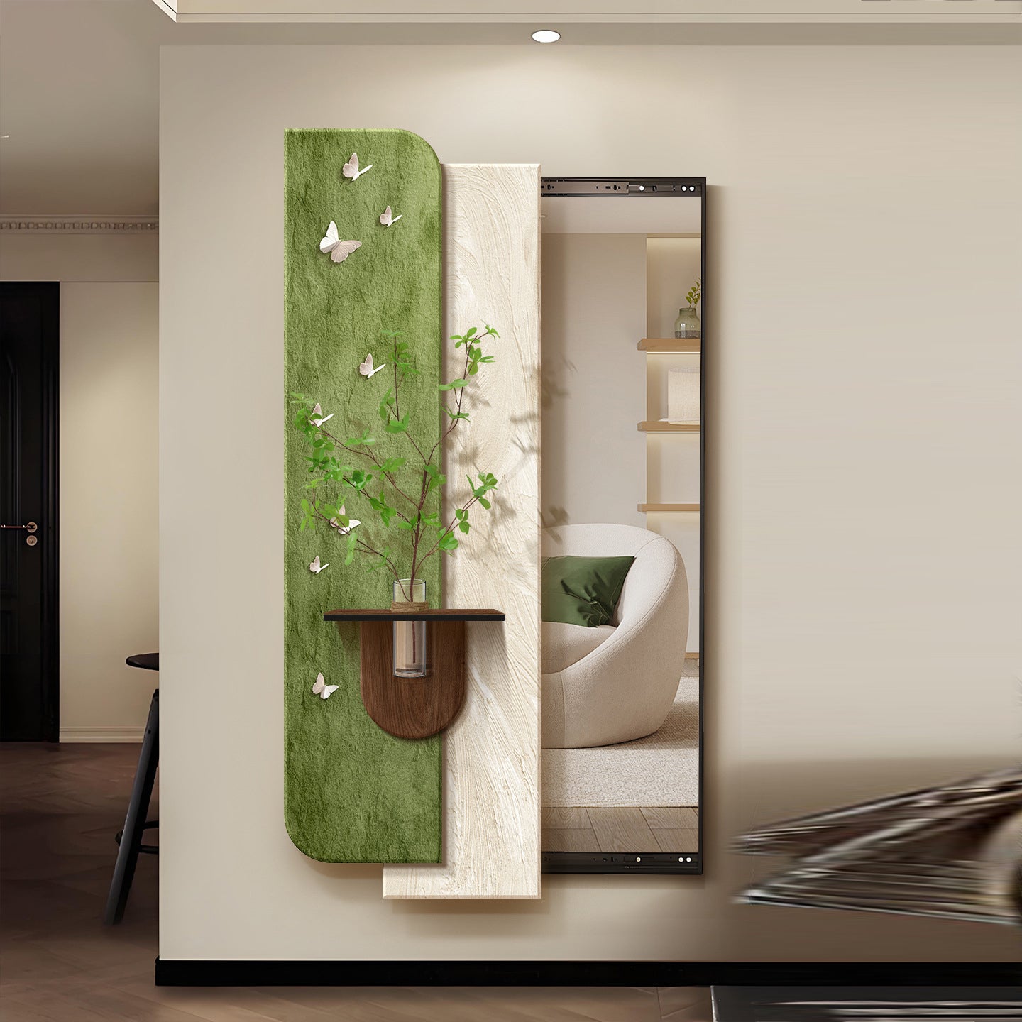 This mirror is an indispensable, multi-functional piece for modern living. Behind the sliding surface, you'll find a hidden single storage shelf, perfect for discreetly organizing keys, cosmetics, or accessories. Available in two sophisticated color pairings—elegant Cream & Walnut or fresh Cream & Green—it serves as a perfect decorative accent, a sliding dressing mirror, or a stylish hallway storage solution. Optimized for North American consumers searching for Art Deco full-length mirrors, sliding storage mirrors, and mirrors with integrated plant holders for entryways and bedrooms.