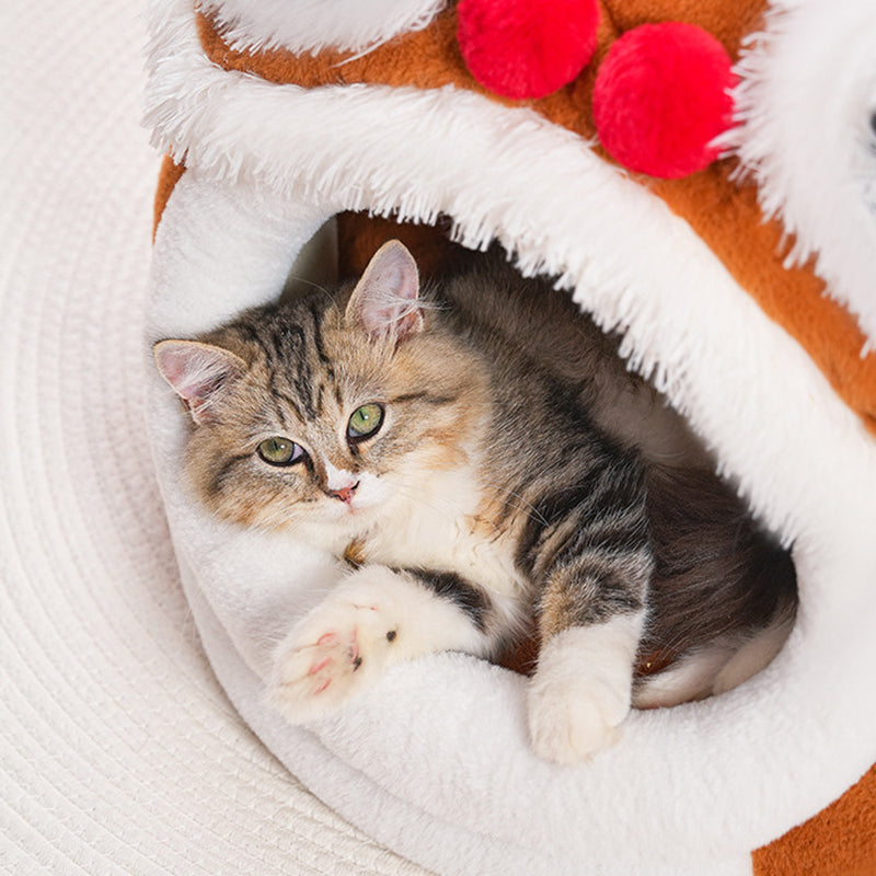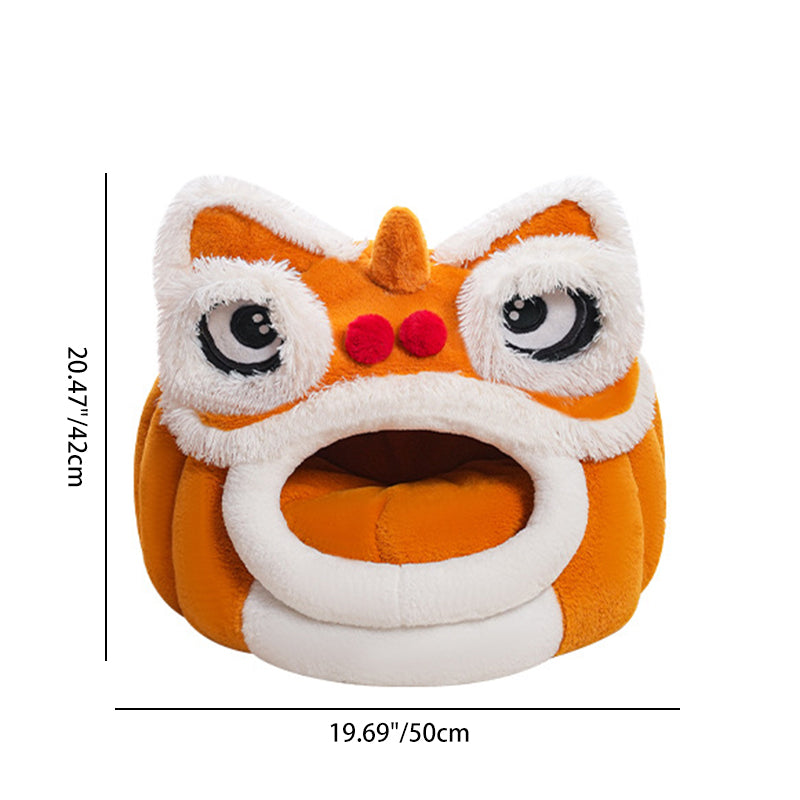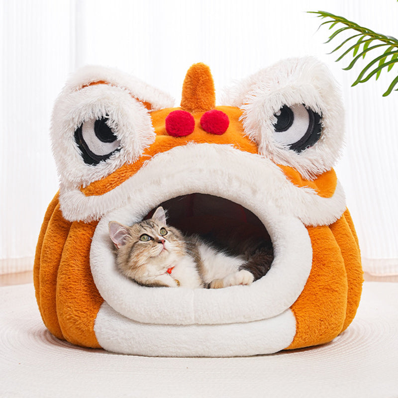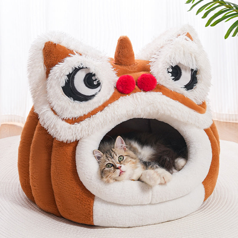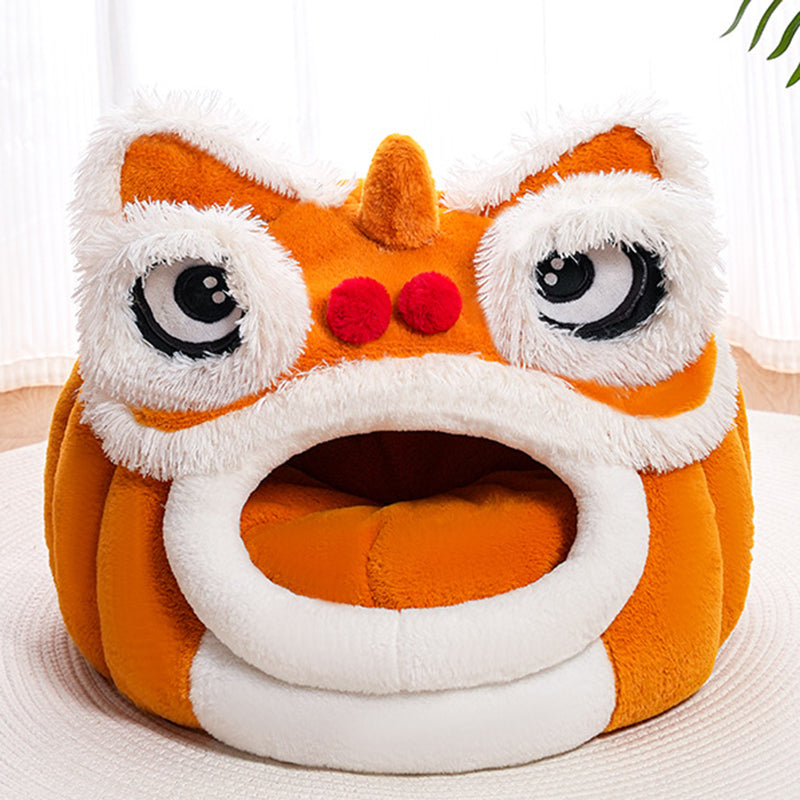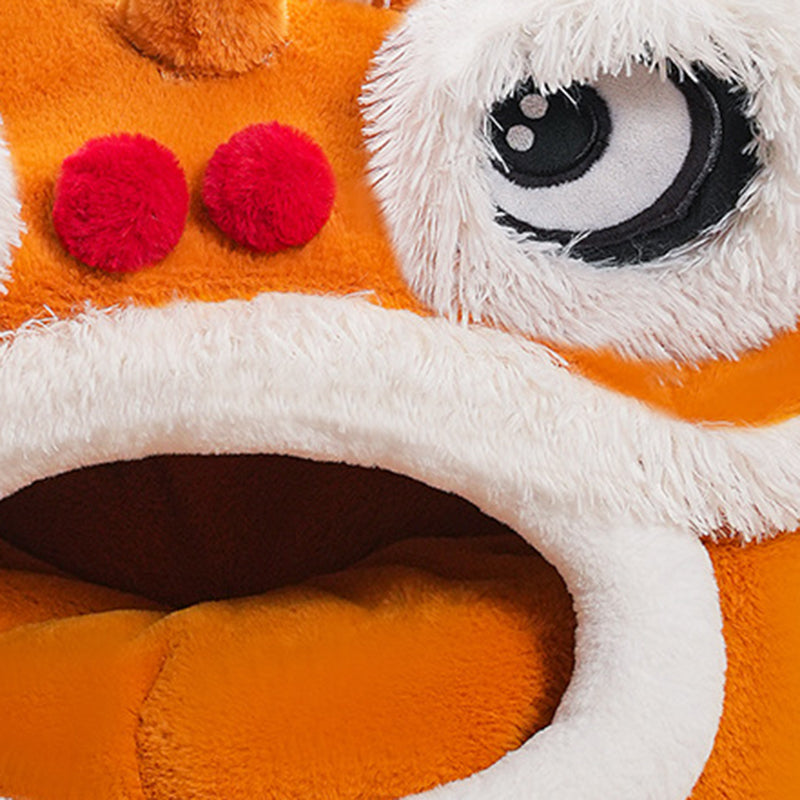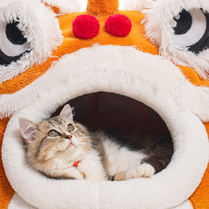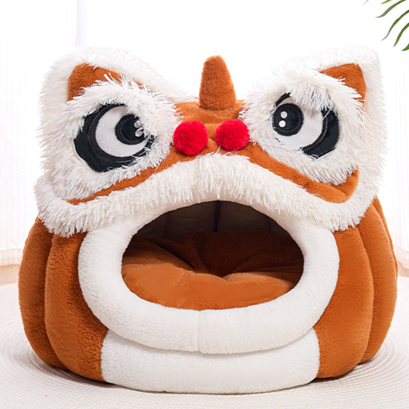 Celebrate your pet with this contemporary creative pet bed, featuring a unique lion-dance–inspired design that brings a touch of artistry to your home. Crafted from soft plush fabric and silky fiber filling, it offers year-round warmth and comfort. The semi-enclosed structure and thickened cushioned base create a spacious interior that provides a secure resting space without losing its form. Designed for convenience, it includes removable and easy-to-clean components and a non-slip beaded bottom for stability. Available in yellow-brown and dark brown, it is the perfect addition to bedrooms and cozy indoor environments for cats and small dogs.
