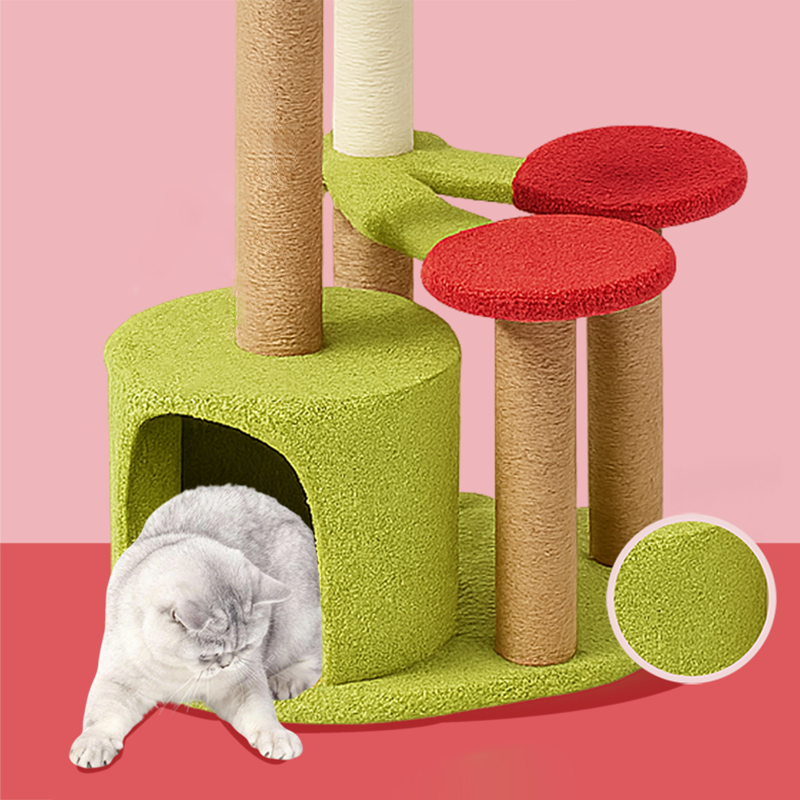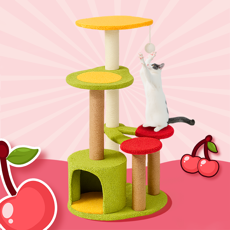 Add a splash of playful "Pop-Art" to your home with our cherry-inspired designer cat tree, a whimsical 3-tier sanctuary that tastes like summer all year round. This sculptural activity center features a vibrant Crimson Red and Forest Green palette, turning a standard pet utility into a chic statement piece for modern North American living rooms or bedrooms. The architecture includes a secluded, ground-floor "Pit" condo for high-security napping and a twin-perch "Cherry Lookout" that serves as the ultimate vantage point for birdwatching. It’s the perfect blend of "Cottagecore" charm and functional feline furniture, designed for pet parents who want to elevate their interior decor while satisfying their cat’s natural instincts.