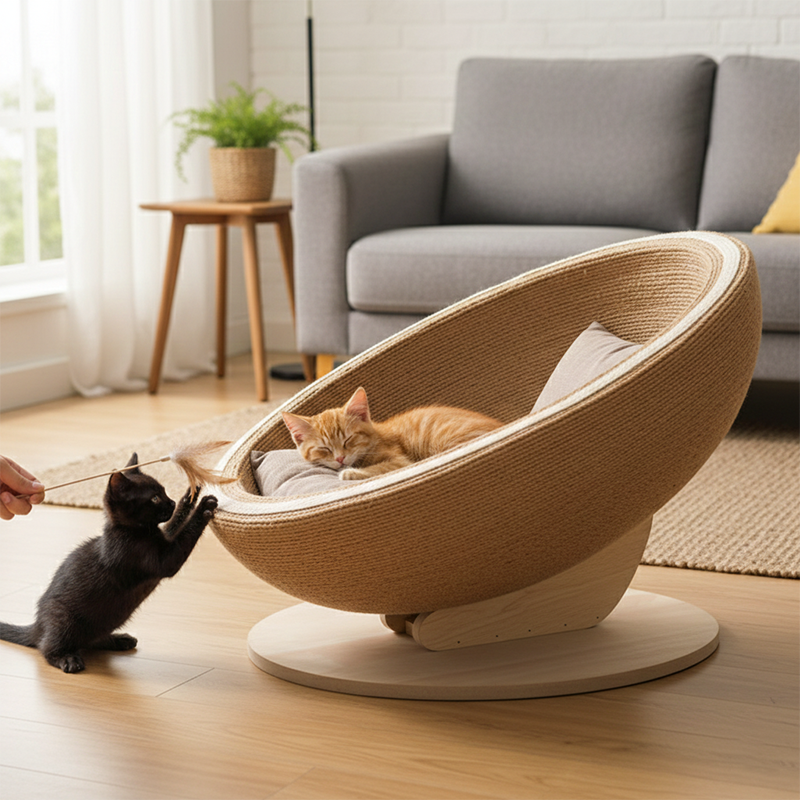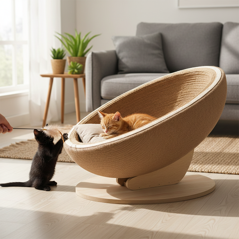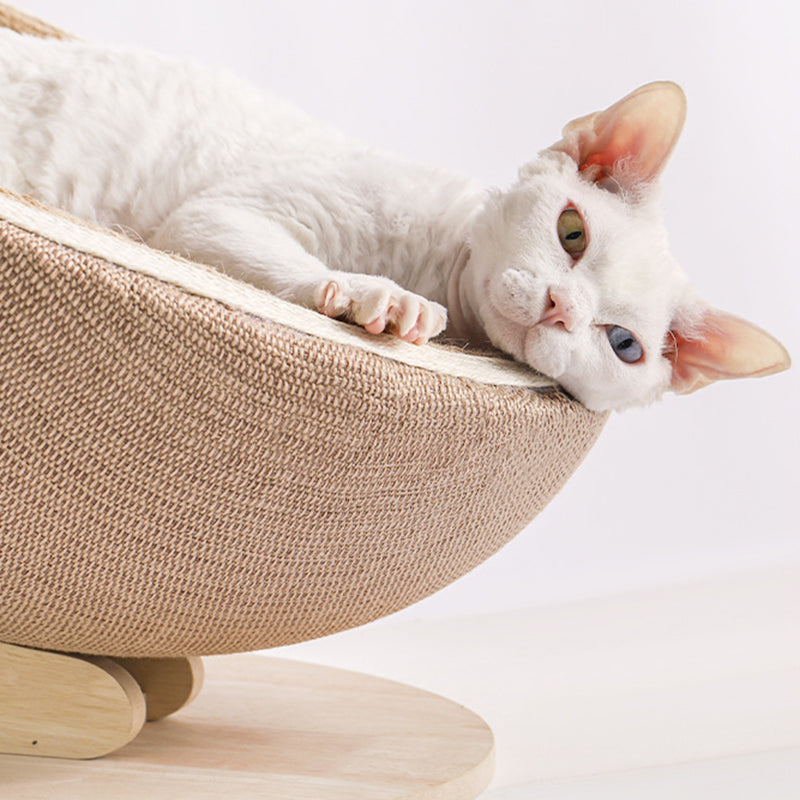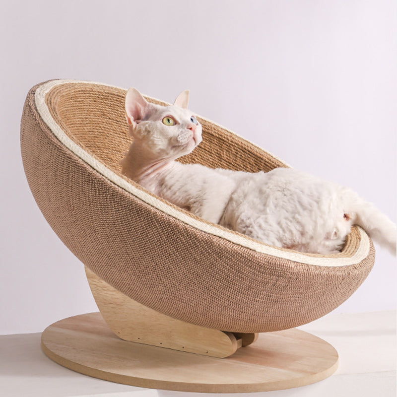 This Nordic-inspired cat bed seamlessly blends a cozy lounge with a functional scratching bowl, offering a sophisticated two-in-one solution for your pet. Constructed from rich brown MDF and wrapped in premium natural jute, the design is as durable as it is stylish. Its stable, supportive frame is built to accommodate cats of all sizes, making it a tasteful addition to any modern living space or bedroom.