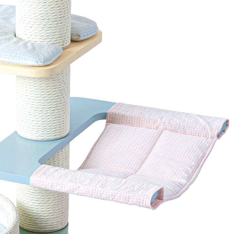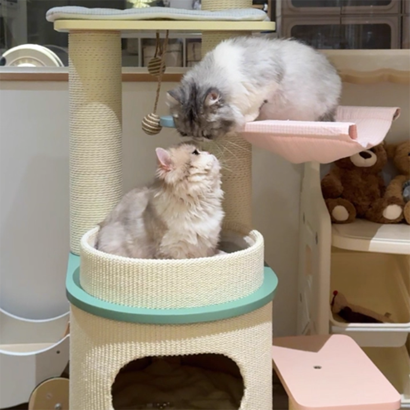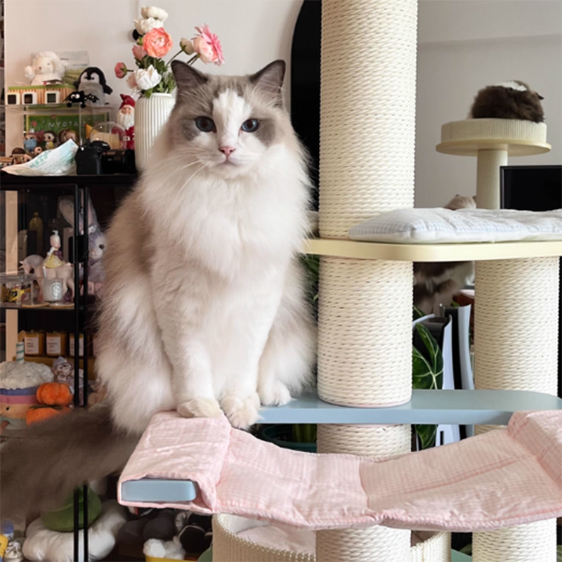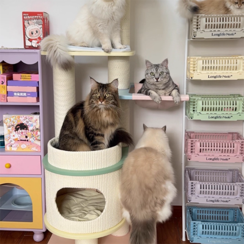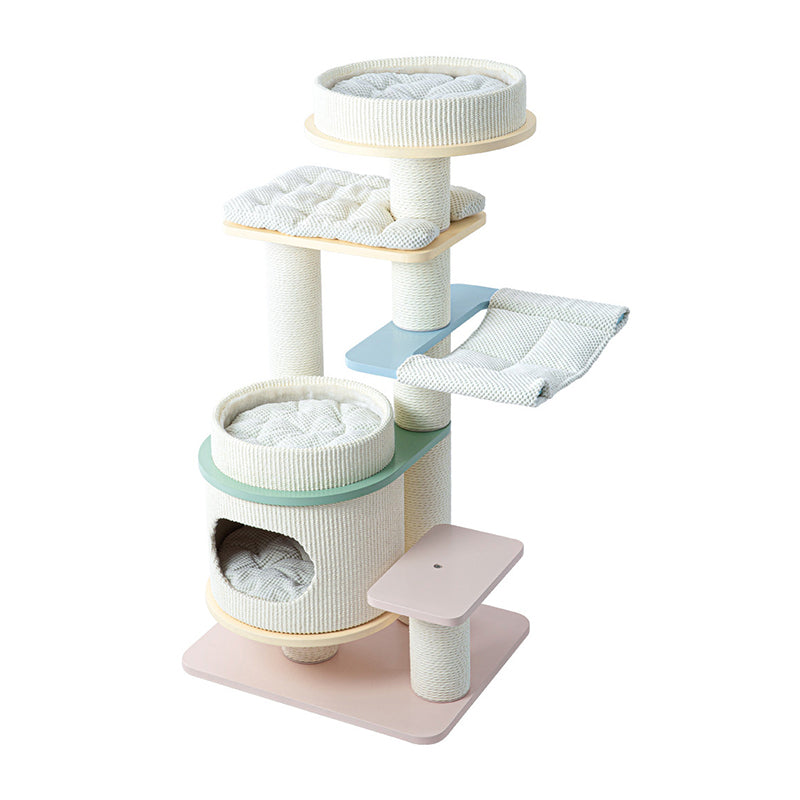 Engineered for the demands of a busy multi-cat household, the Macaron Meadow is a powerhouse of structural integrity. The reinforced solid wood foundation boasts an industry-leading weight capacity of up to 50 kg (110 lbs), providing a "Rock-Solid," wobble-free sanctuary that can comfortably accommodate 1 to 5 cats simultaneously. Each tier is strategically spaced to encourage healthy exercise, while the integrated scratching zones satisfy natural instincts and protect your designer furniture. This is the premier choice for North American shoppers seeking heavy-duty solid wood cat towers, large-capacity multi-cat trees, modern Scandi-style pet furniture, and aesthetic pastel cat climbers for large breeds.