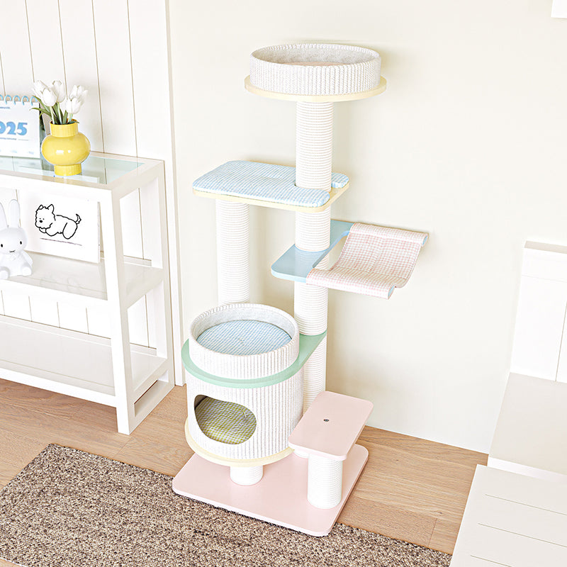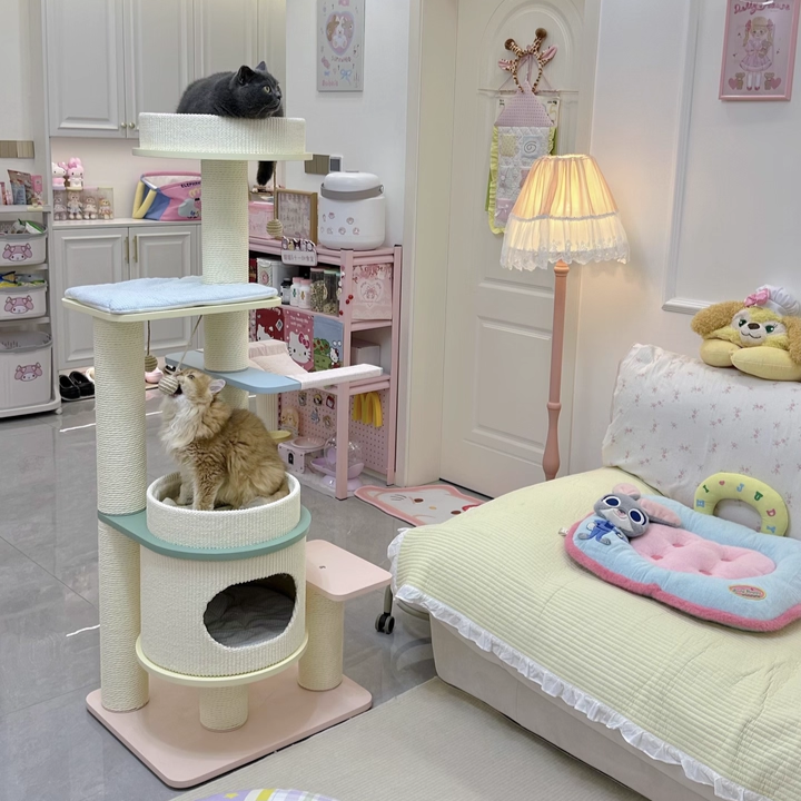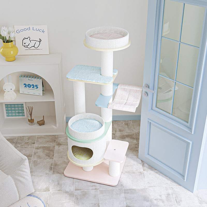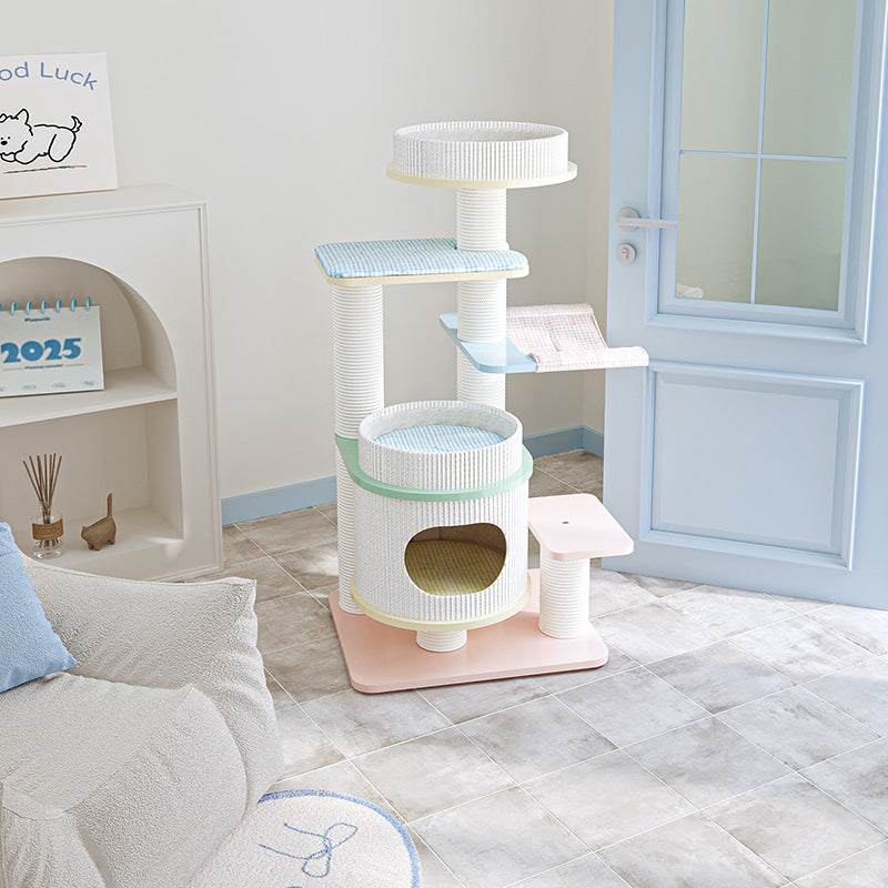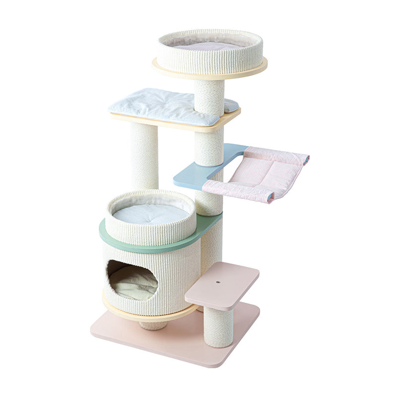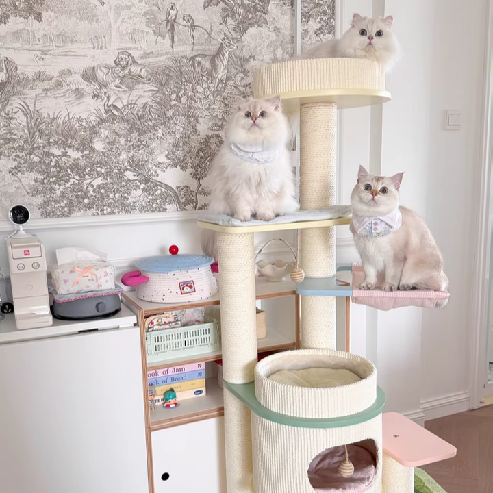 Elevate your home’s aesthetic with the Macaron Meadow, a breathtaking 5-tier solid wood cat tree that marries high-end Nordic design with feline luxury. Featuring a sophisticated, architectural round silhouette, this tower is finished in a dreamy "Dopamine Decor" palette of Soft Macaron White, Sky Blue, and Petal Pink. Unlike standard carpeted trees, this unit is crafted from furniture-grade solid wood, offering a clean, "Organic-Modern" look that enhances your living room or bedroom. Its expansive 5-level vertical layout provides a "High-Ground" playground for climbing, scratching, and napping, making it the ultimate designer statement piece for the stylish pet parent.