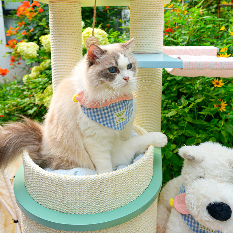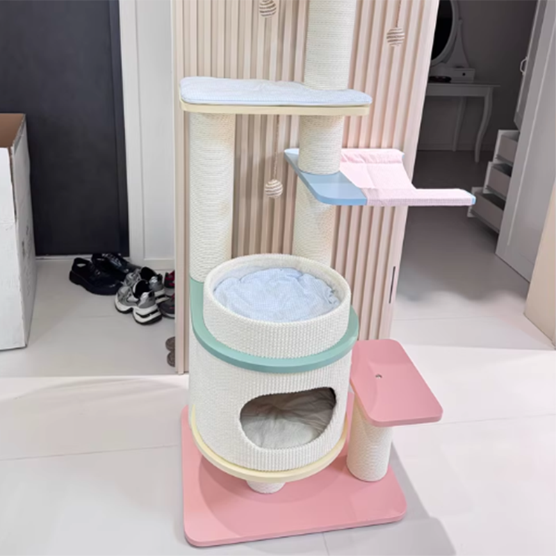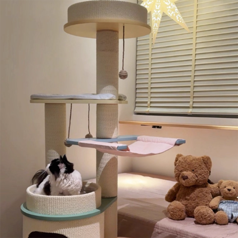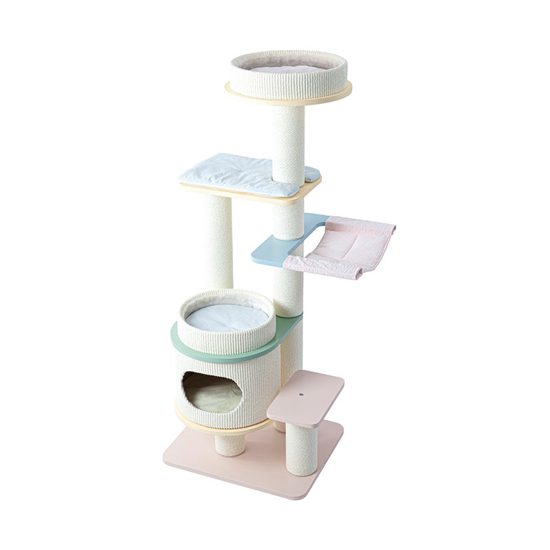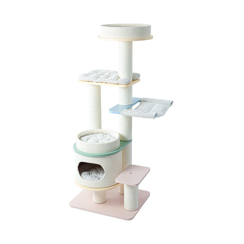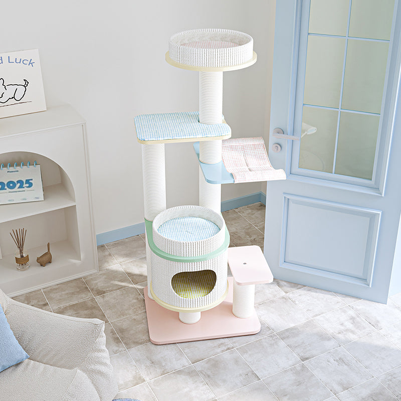 Elevate your home’s aesthetic with the Macaron Meadow, a breathtaking 5-tier solid wood cat tree that marries high-end Nordic design with feline luxury. Featuring a sophisticated, architectural round silhouette, this tower is finished in a dreamy "Dopamine Decor" palette of Soft Macaron White, Sky Blue, and Petal Pink. Unlike standard carpeted trees, this unit is crafted from furniture-grade solid wood, offering a clean, "Organic-Modern" look that enhances your living room or bedroom. Its expansive 5-level vertical layout provides a "High-Ground" playground for climbing, scratching, and napping, making it the ultimate designer statement piece for the stylish pet parent.