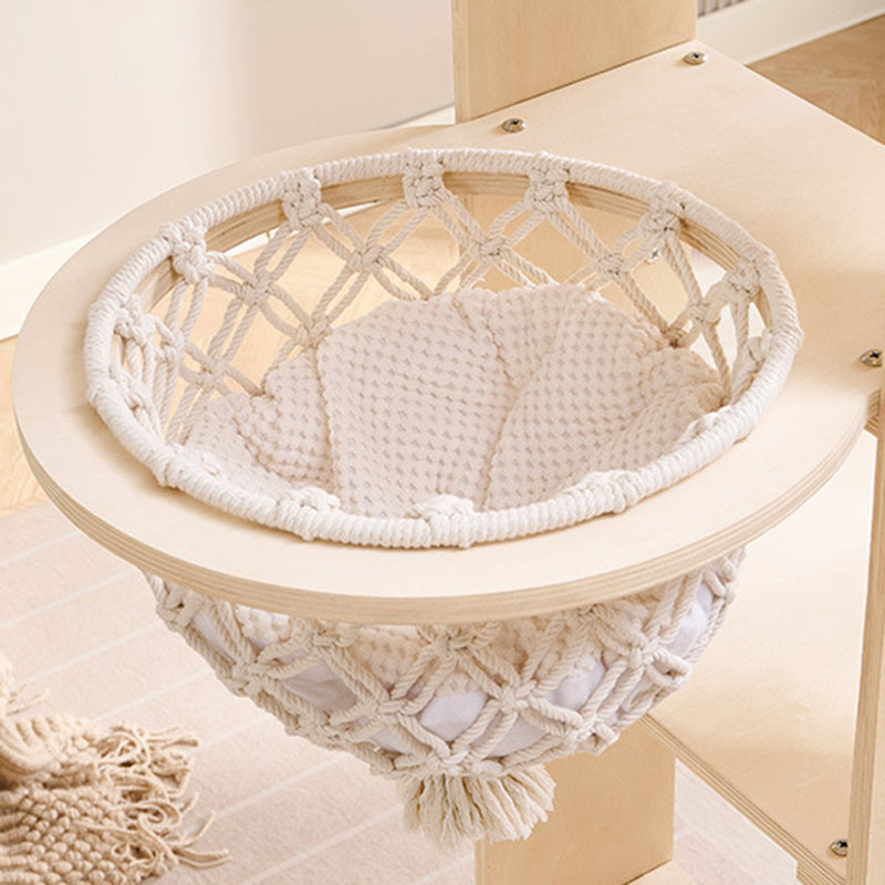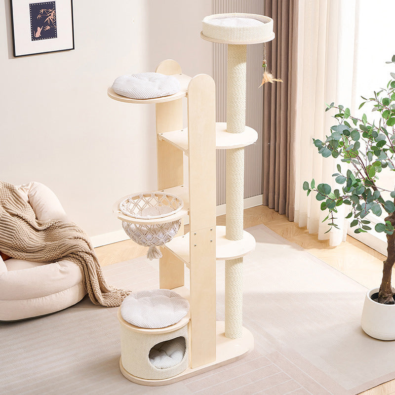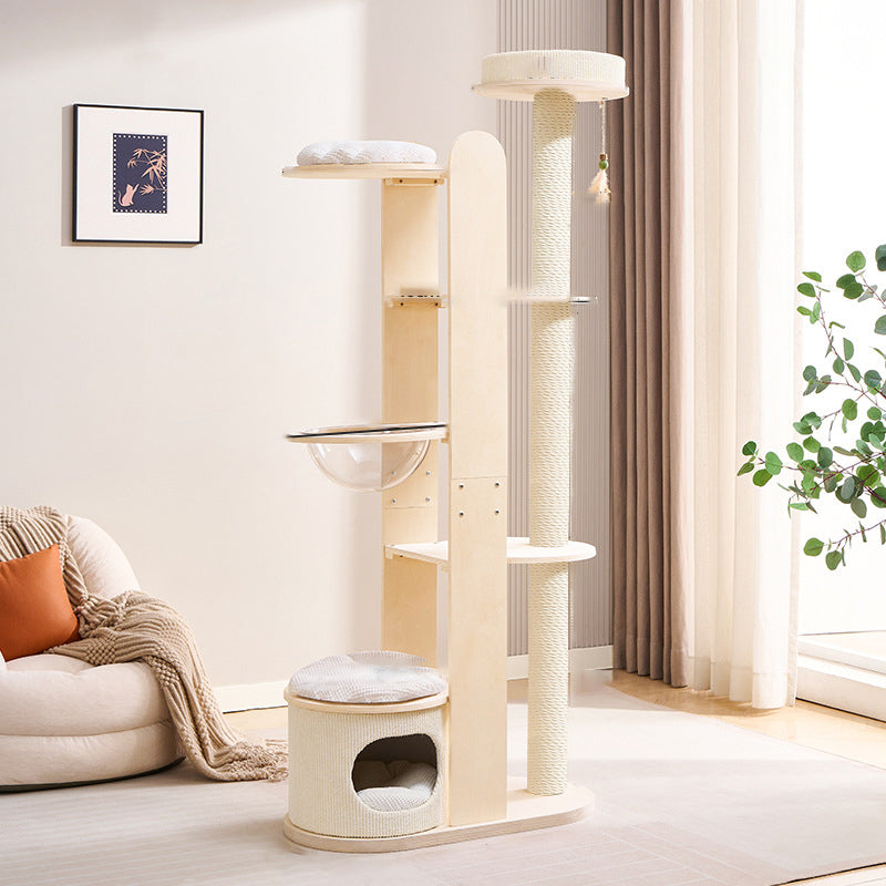 Elevate your feline’s lifestyle with our 6-level premium cat tree, the ultimate vertical playground designed specifically for multi-cat households. Crafted from high-quality solid wood, this tower offers a "rock-solid" stability that far surpasses standard carpet-tube alternatives, ensuring a wobble-free experience for even the most active climbers. The centerpiece features a futuristic acrylic "space capsule" bed, providing your pet with a cozy, 360-degree view while creating an adorable "floating" photo op for owners. Finished in a neutral soft beige, this sleek, circular design blends seamlessly into modern North American living rooms and bedrooms as a piece of "pet-centric" fine furniture.