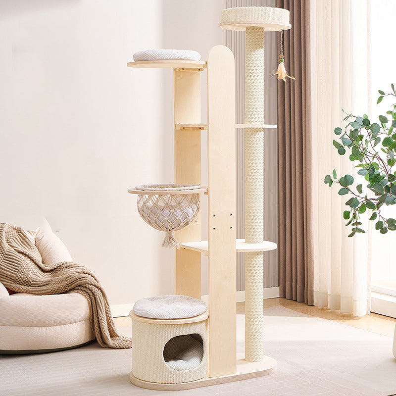 This multifunctional cat gym is a masterclass in feline enrichment, balancing intense play with restorative rest. Each level is strategically tiered to encourage natural jumping and climbing, while the natural sisal-wrapped scratching posts provide a durable outlet for clawing instincts—saving your sofas from damage. The tower is draped in ultra-plush, hypoallergenic fabric that is gentle on paws and perfect for mid-afternoon naps. Its compact vertical footprint makes it a "big-city" solution for apartments, providing massive horizontal fun without sacrificing floor space. This is the premier choice for shoppers seeking luxury solid wood cat trees, modern cat towers with space capsules, sisal scratching posts for large cats, and aesthetic multi-level cat furniture.