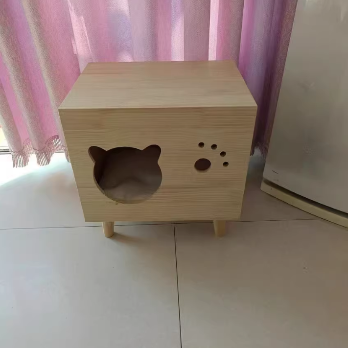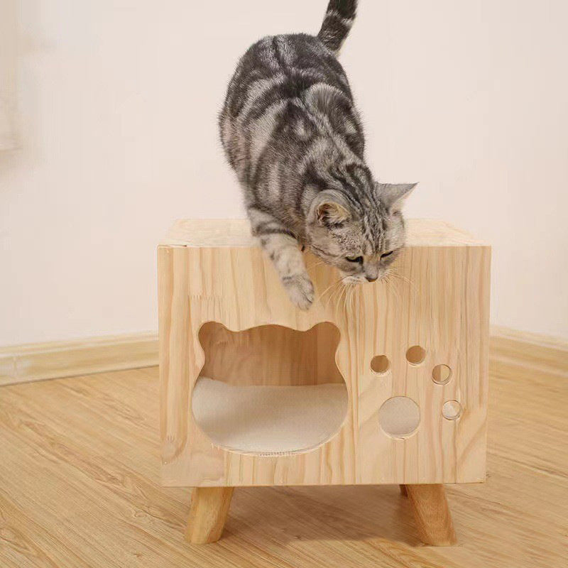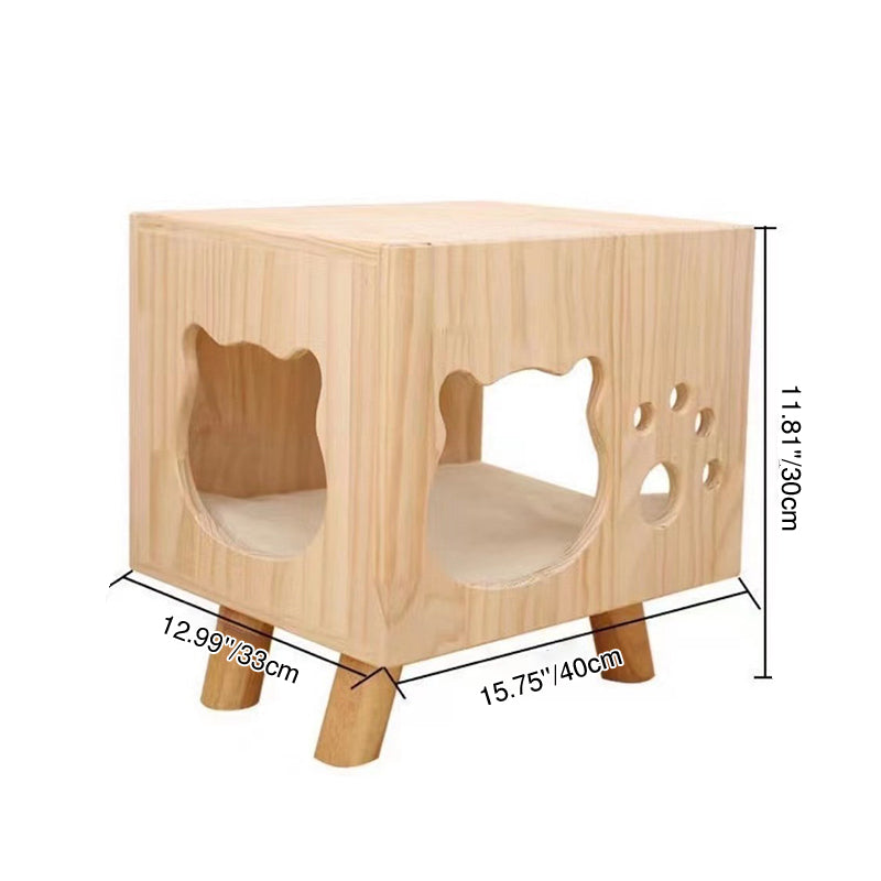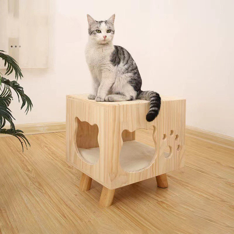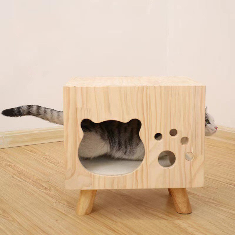 This modern minimalist solid wood cat house features a cylinder and square integrated design, serving as a cozy cat nest and functional bedroom accent. Crafted in a natural wood finish, it offers one built-in storage space, smooth rounded edges, and a sturdy structure—perfect for cats to rest, play, and feel secure in the bedroom.