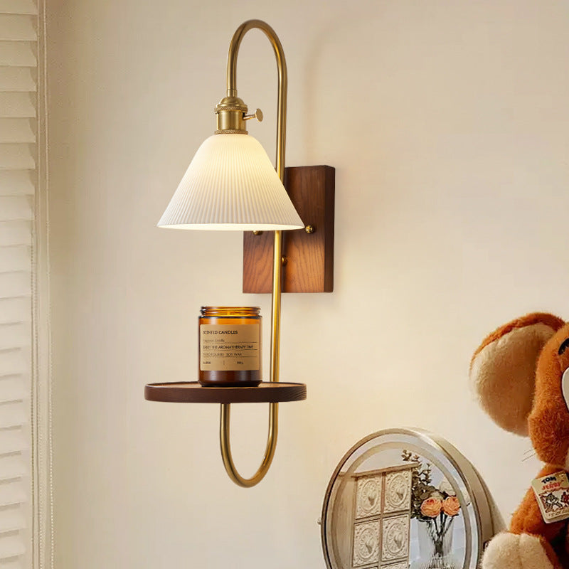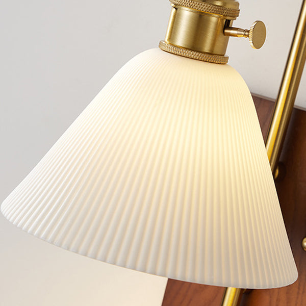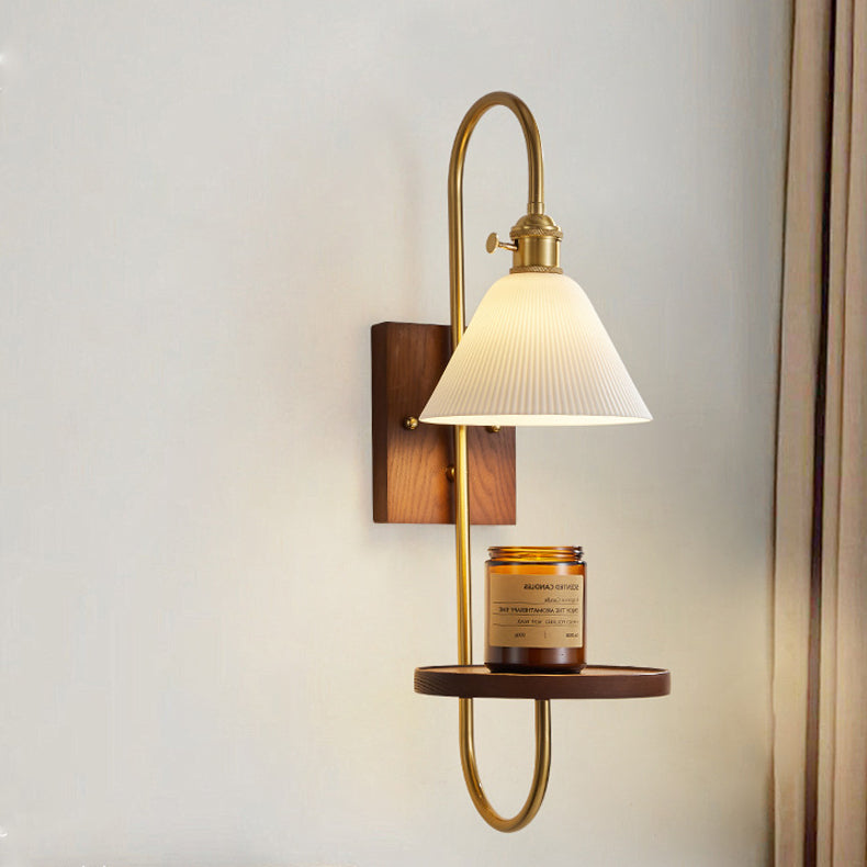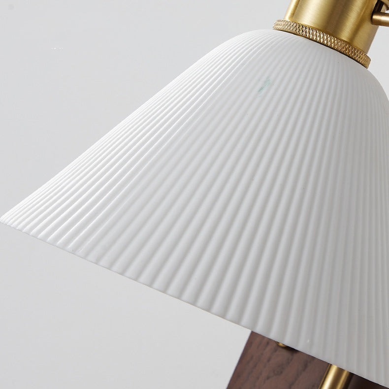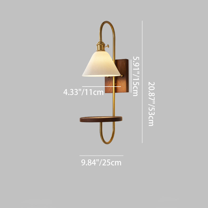 Featuring a refined mix of ceramic, glass, iron, and walnut wood, this 1-light wall sconce delivers evenly diffused, high-CRI lighting that's soft on the eyes. With its curved conical and rectangular shapes in warm white and brown tones, it adds a timeless, vintage touch to your living room atmosphere.