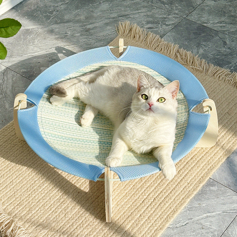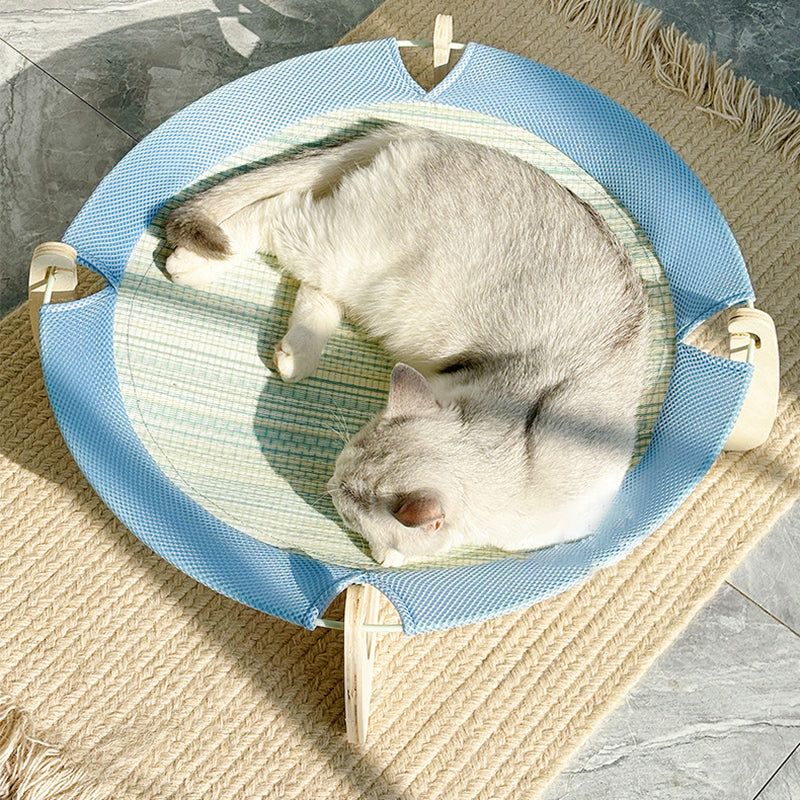 Keep your feline companion cool and comfortable with this breathable summer cat bed, a perfect blend of "organic texture" and Scandinavian design. Expertly constructed with a sturdy solid wood frame, this elevated lounge features a natural rush mat surface—a traditional, eco-friendly material prized for its exceptional breathability and cooling properties. The elevated hammock design promotes 360-degree airflow, preventing overheating during the warmer months while providing a firm, supportive foundation that caters to your pet's health and comfort.