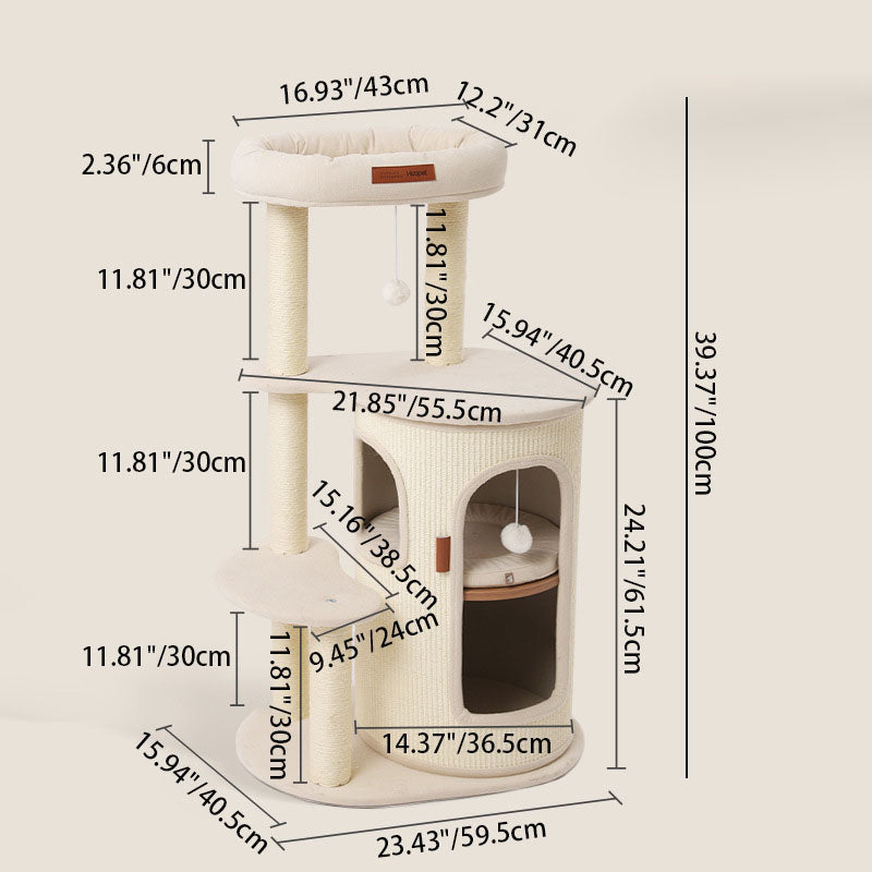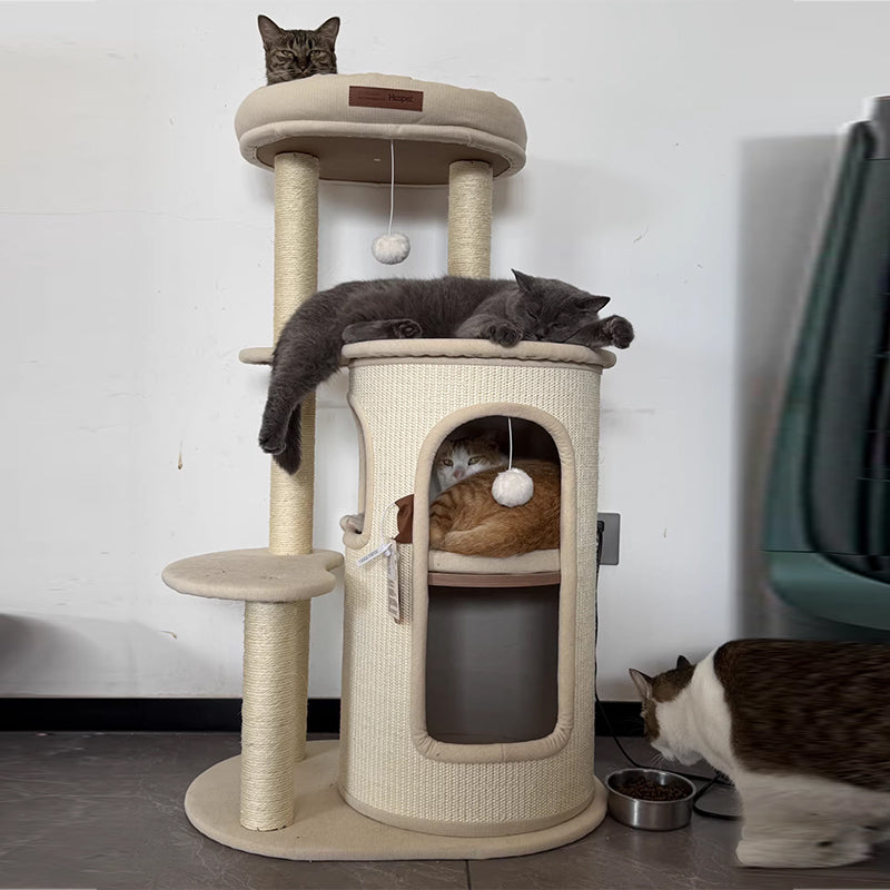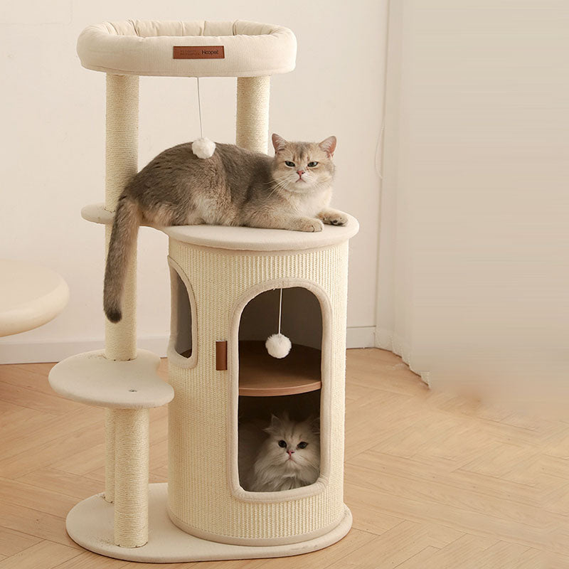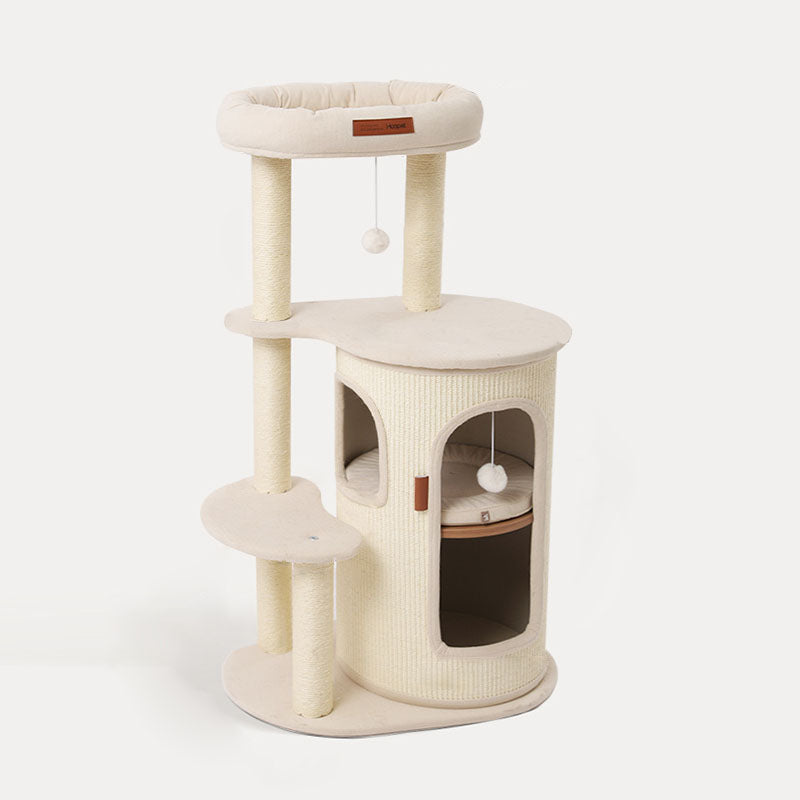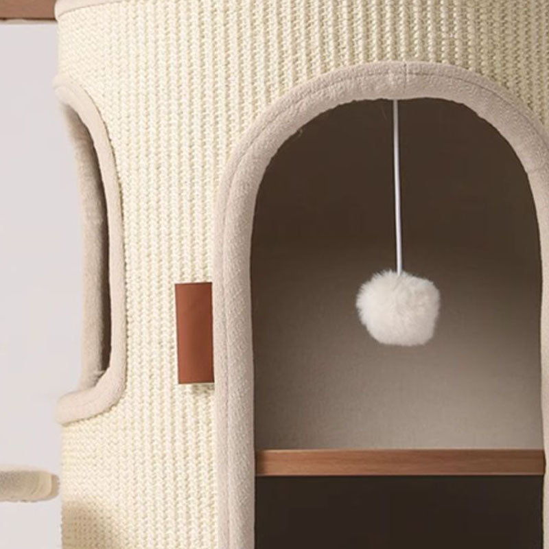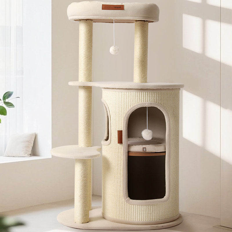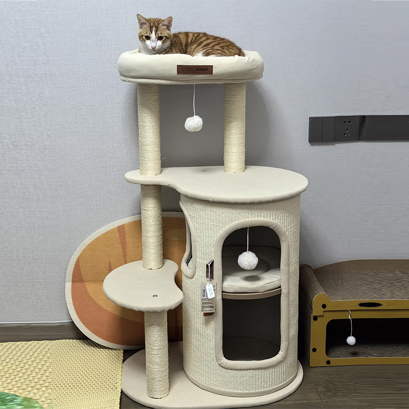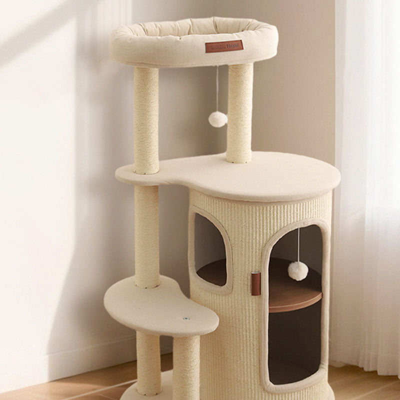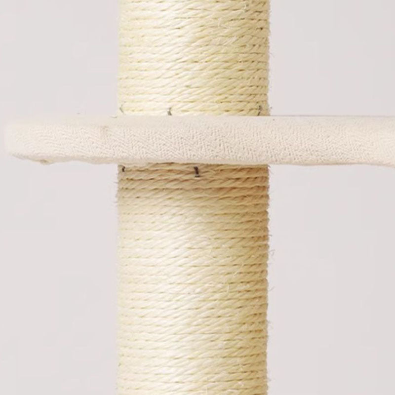 Elevate your small-space feline haven with this 5-tier tree-shaped cat tree, blending contemporary Bohemian style with natural sisal wrapping, plywood structure, and cotton-linen fabric upholstery. Filled with soft PP cotton and featuring paper tube details, the off-white design fits seamlessly in living rooms, bedrooms, or balconies, offering a durable climbing, scratching, and resting spot for your cat.